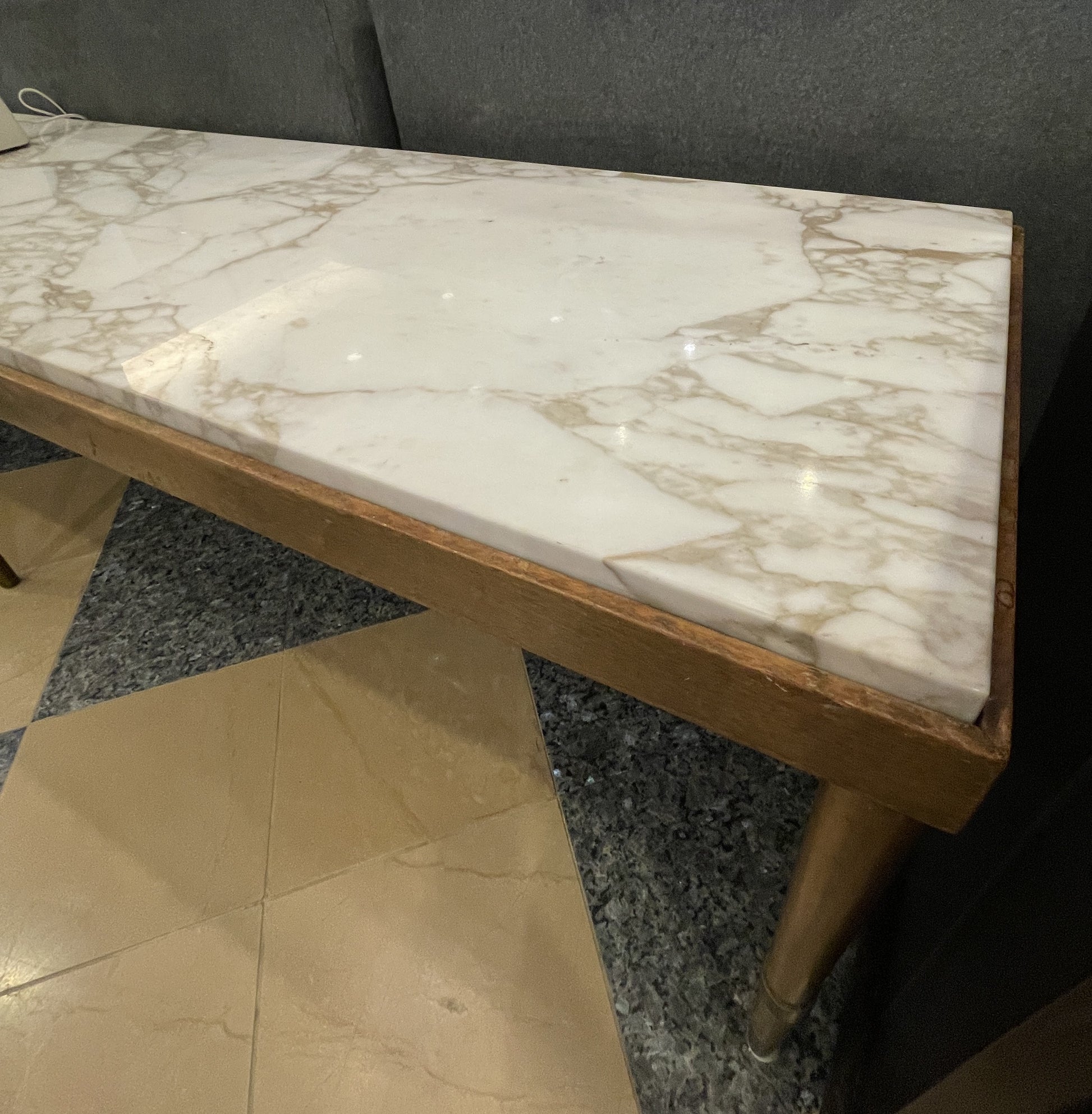 Mid Century Modern Calacatta Marble and Wood Low Console, AS IS (0GE005)