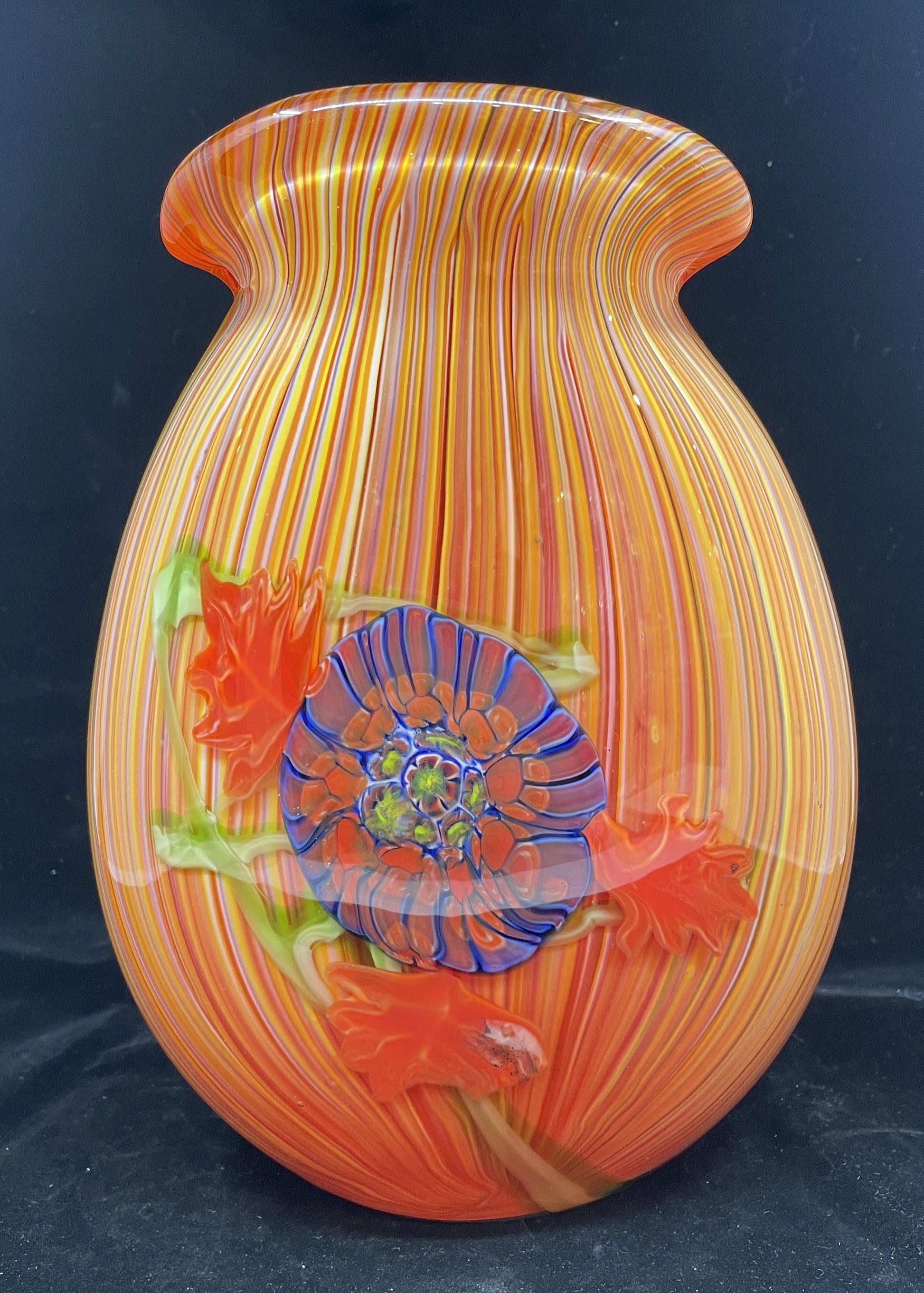 Millefiori Murano vase. This beautiful hand blown glass vase has a stunning design. The vase is oblong with a tapered neck. The piece is covered in beautiful vertical linear details in shades of orange, yellow, white, and red. The two wider sides of the vase have different floral details. One side has a blue and red flower accented by a green stem and orange leaves, and the other side has a thicker green stem accented with orange leaves. The interior of the vase is a solid, bold orange color. This beautiful vase is sure to add vibrant charm to any space with its gorgeous designs on all sides.