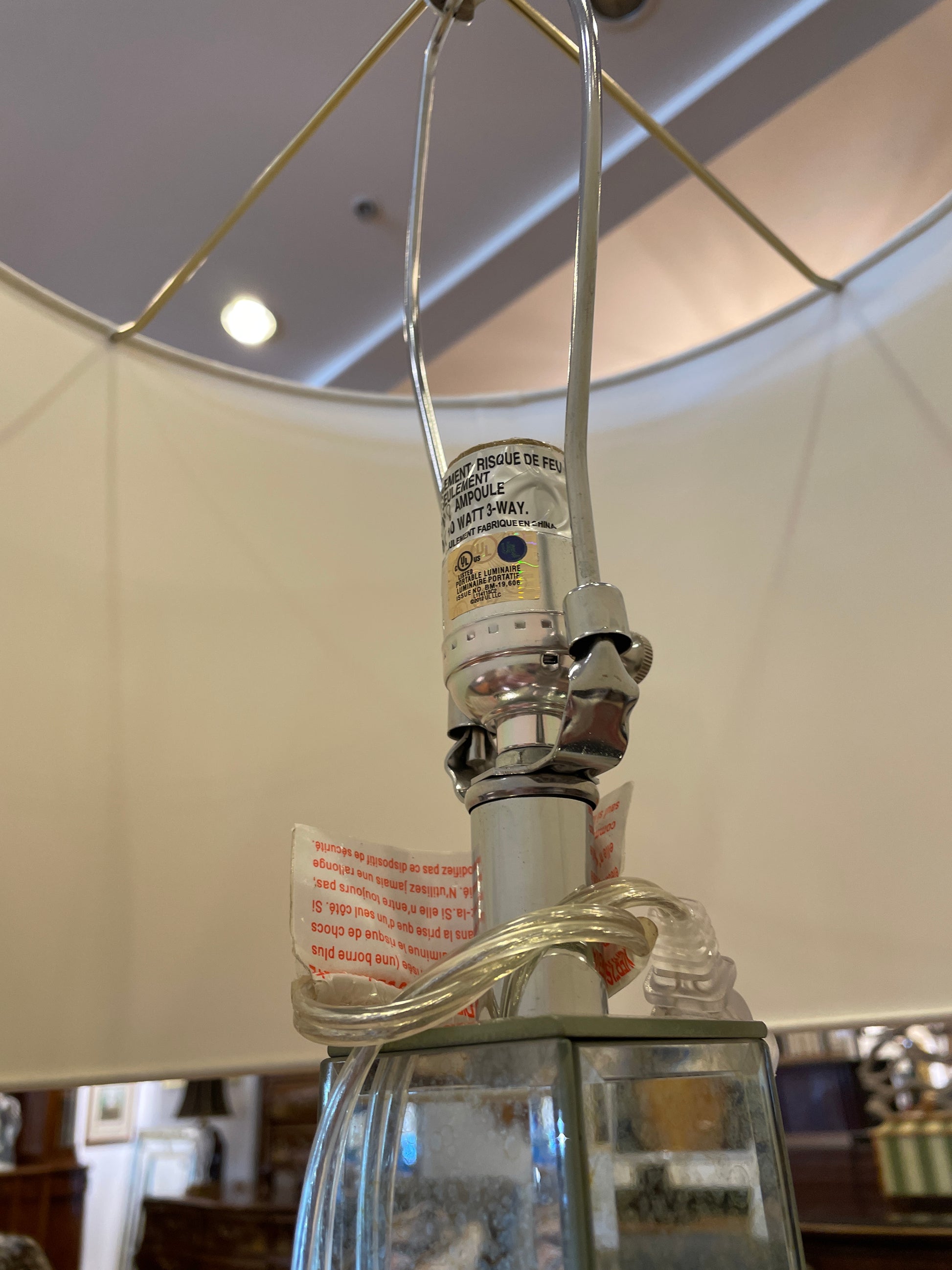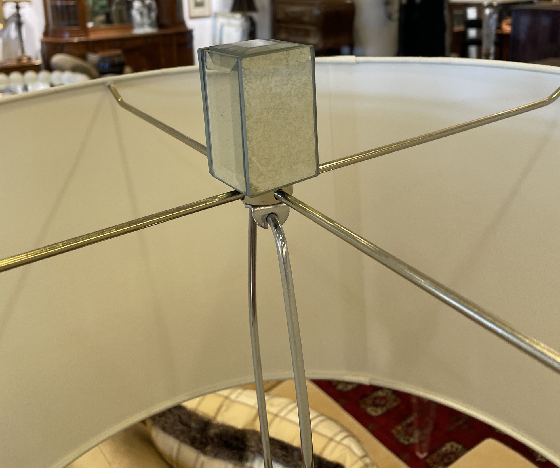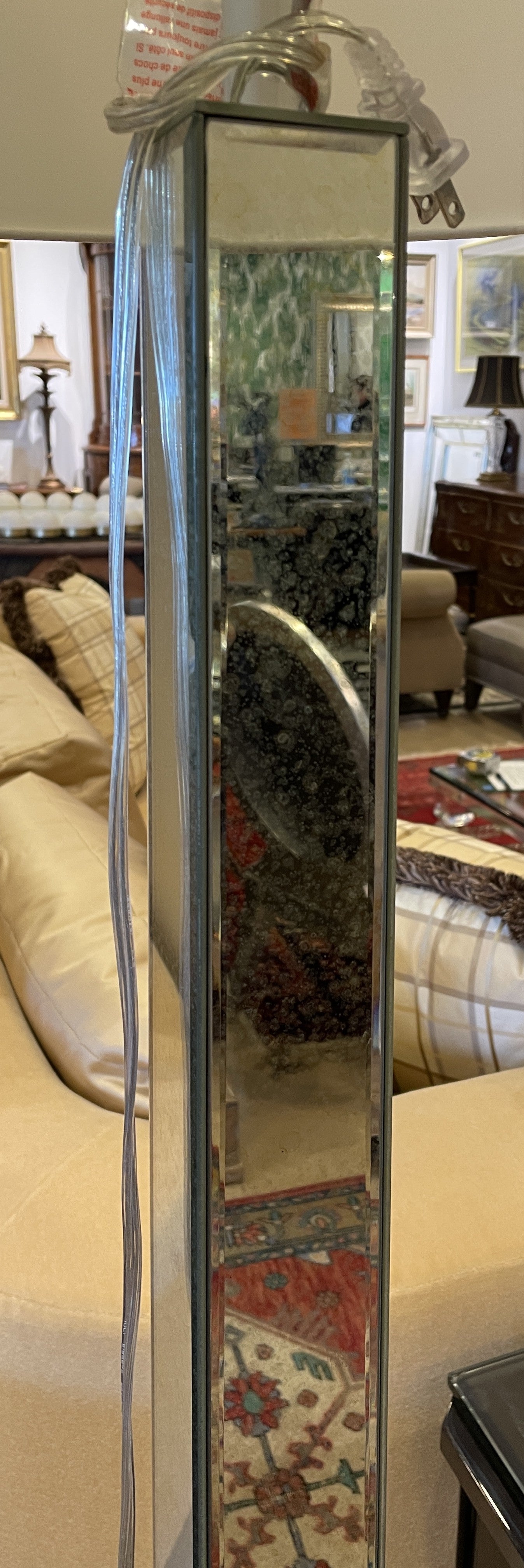 Mirrored floor lamp. This gorgeous floor lamp features a mirrored base beneath a simple shade. The base is covered in mirrors on all sides. A simple, cylindrical shade in cream sits on top of the base, and a small finial peeks out. The finial is a rectangular shape and, similar to the base of the lamp, is covered in mirrors. The finial however has an added beveled detail on each mirror. This charming lamp is sure to brighten up any space both with its light and mirrored design.