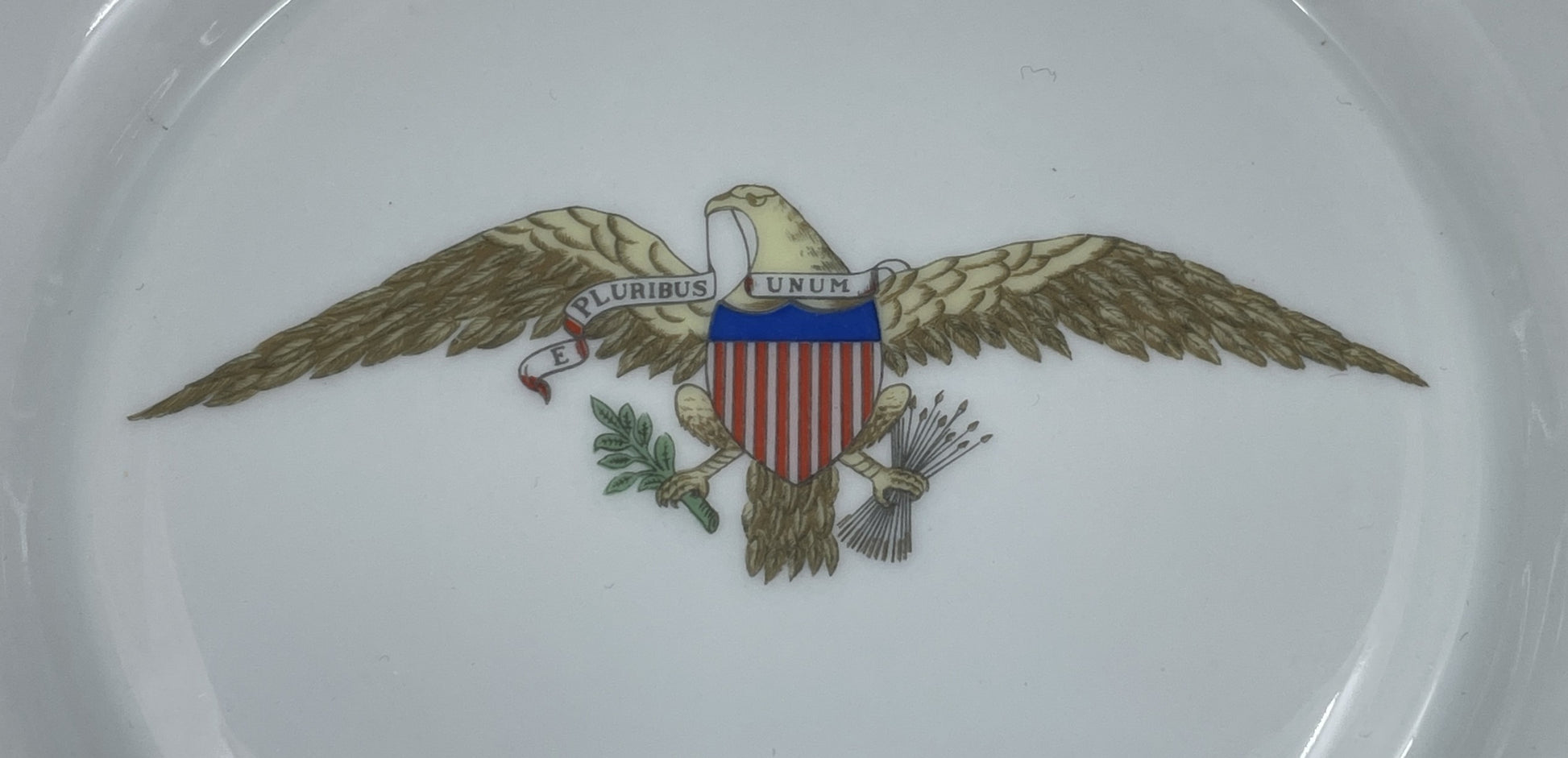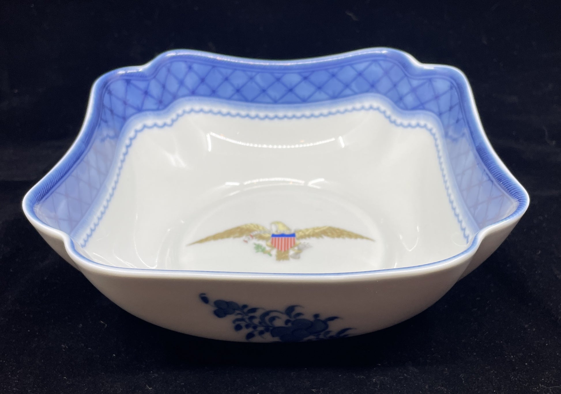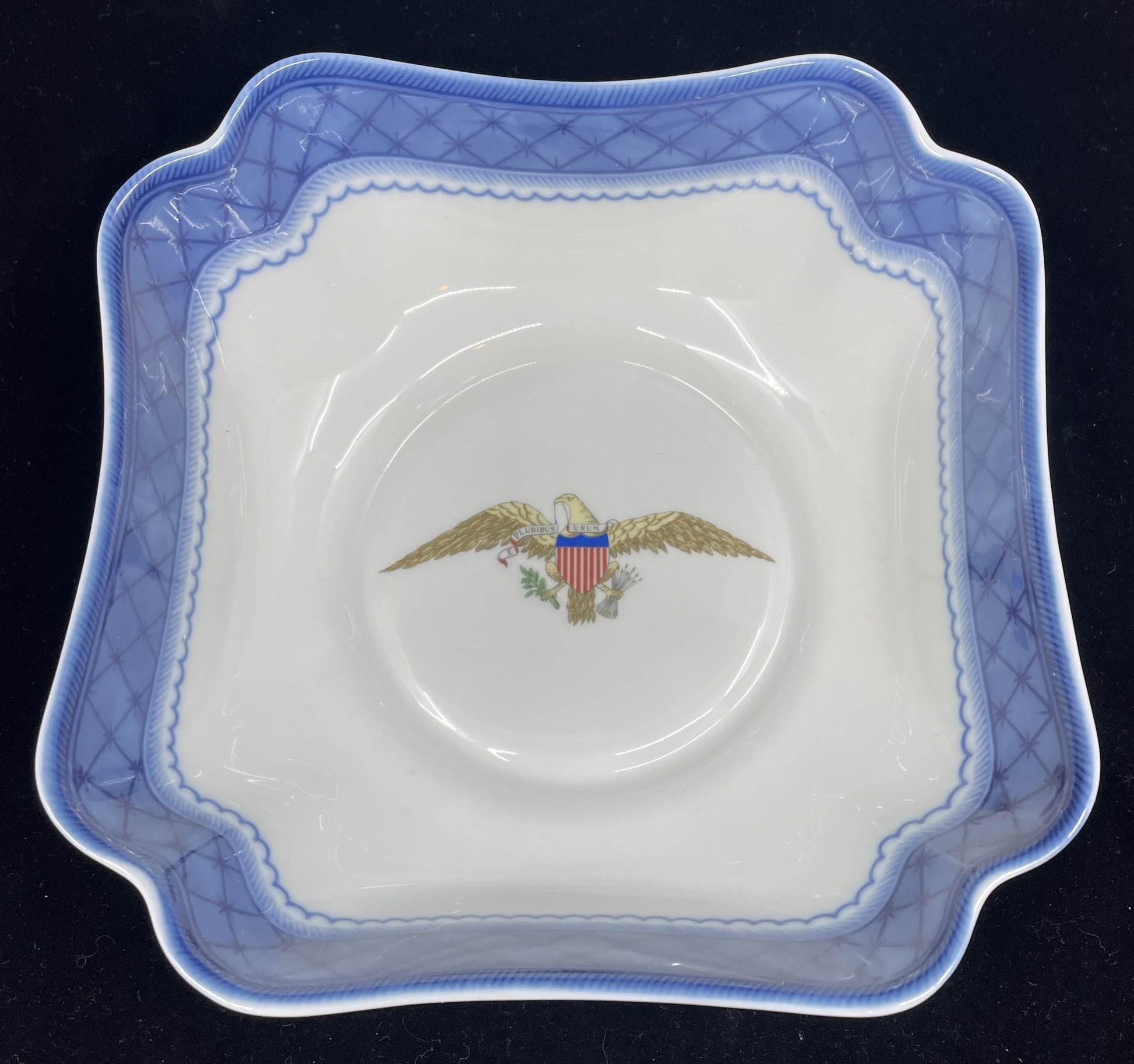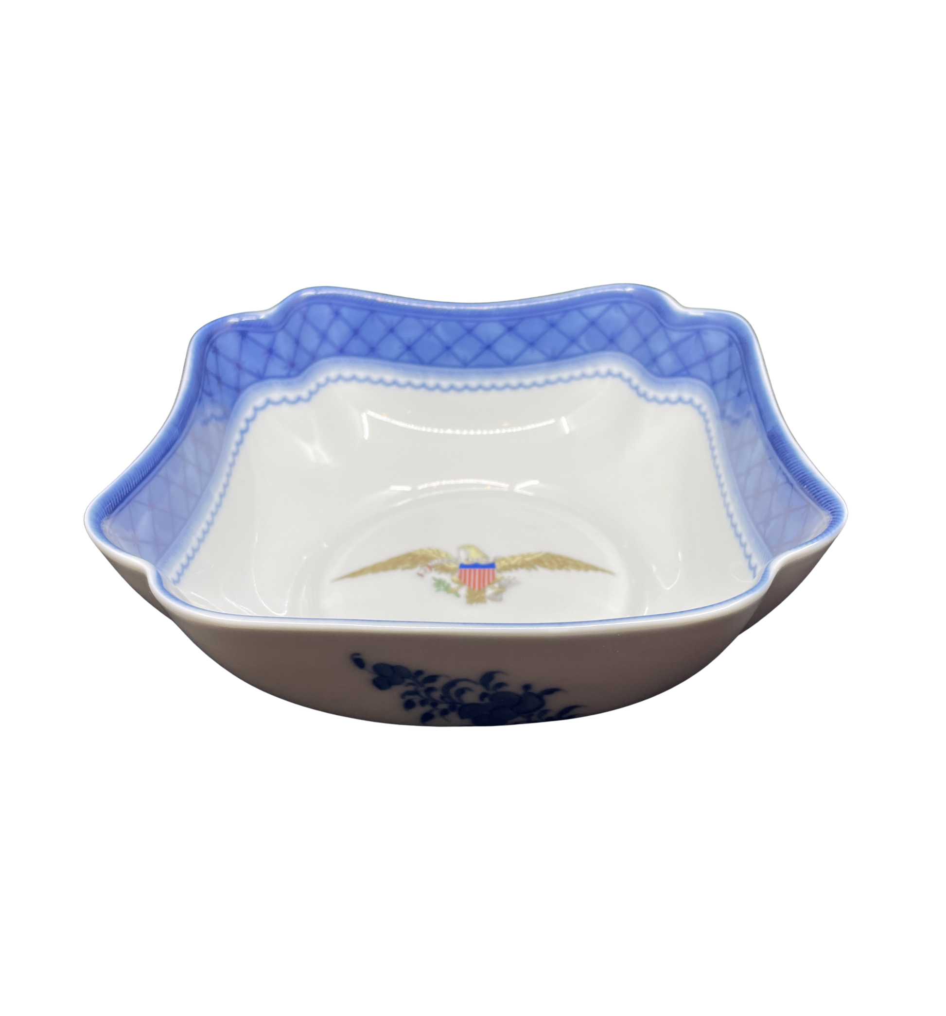 Mottahedeh diplomatic reception reproduction bowl. Marked on the bottom. This bowl was originally designed for diplomatic reception rooms of the Department of State. This reproduction features an eagle emblem that reads "E Pluribus Unum". The bowl has a square shape with scalloped corners. The upper inner edge of the bowl is accented by a blue band with crisscross details, and each side of the exterior has a blue floral design in its center. A gorgeous porcelain bowl that's sure to start conversation.