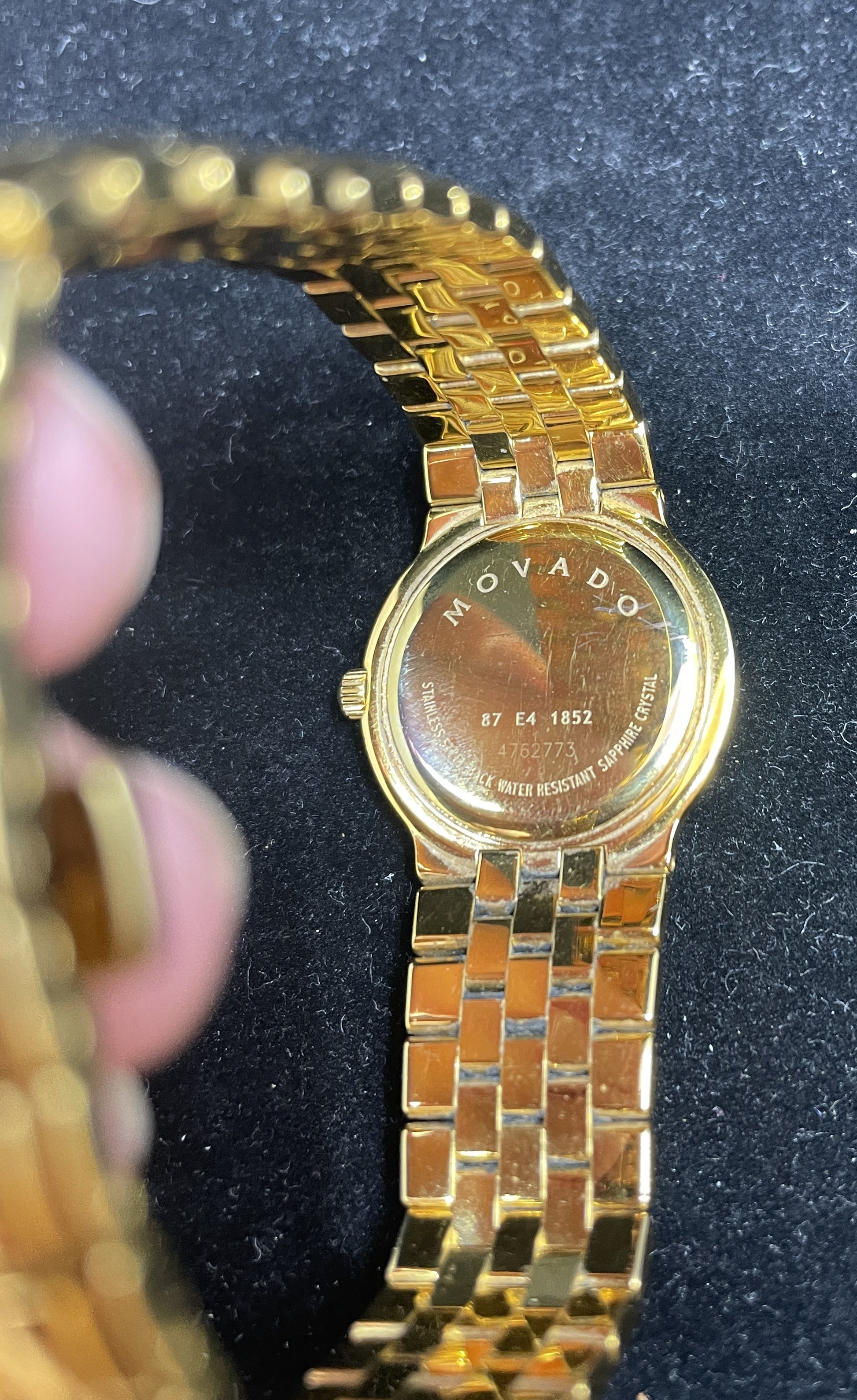 Movado Celestina ladies watch. This beautiful watch has a black, numberless, round face. The hardware of this watch is gold colored stainless steel. The clasp have a release button to open and close. A beautiful and timeless piece that's sure to elevate any outfit.
