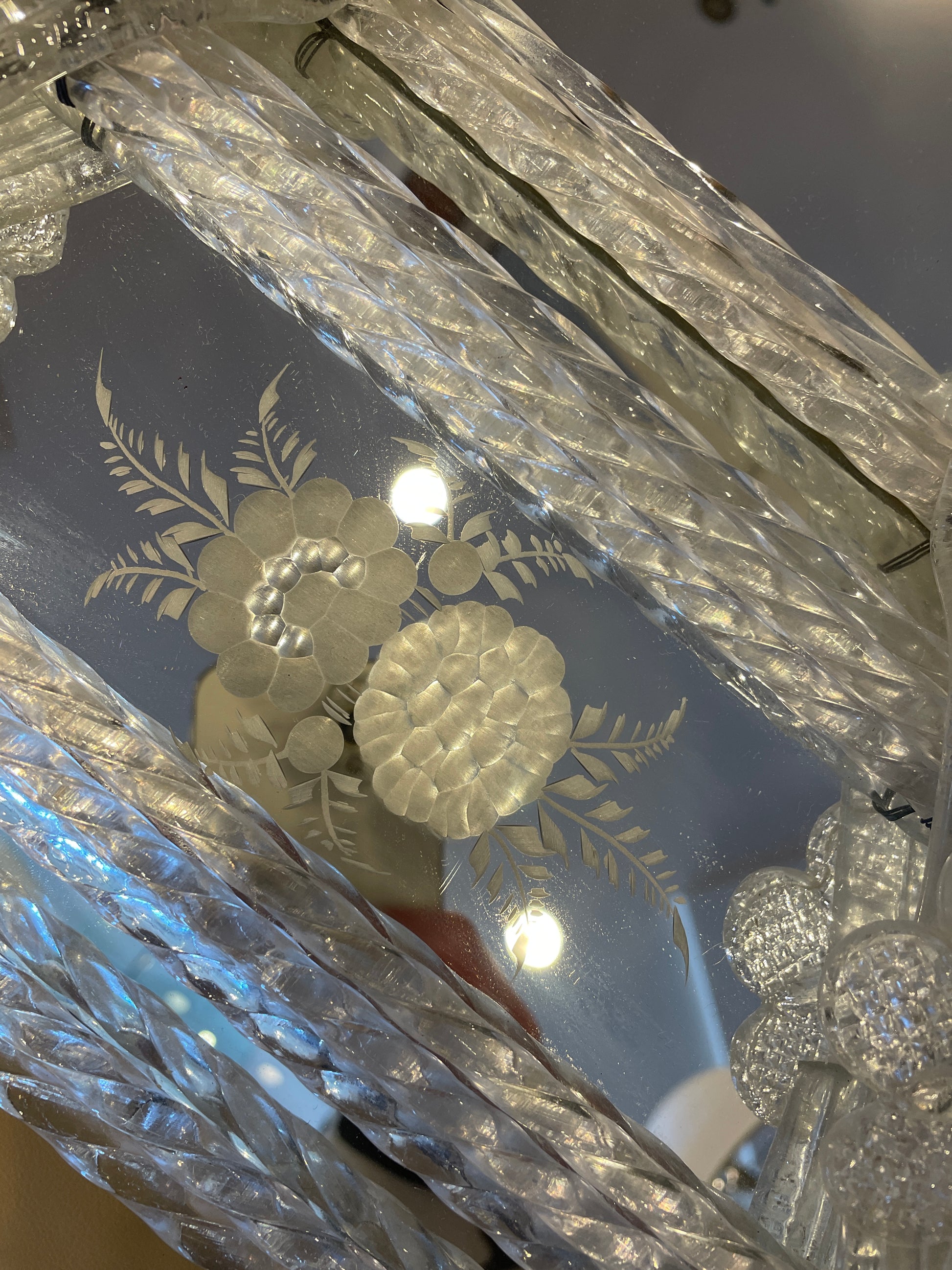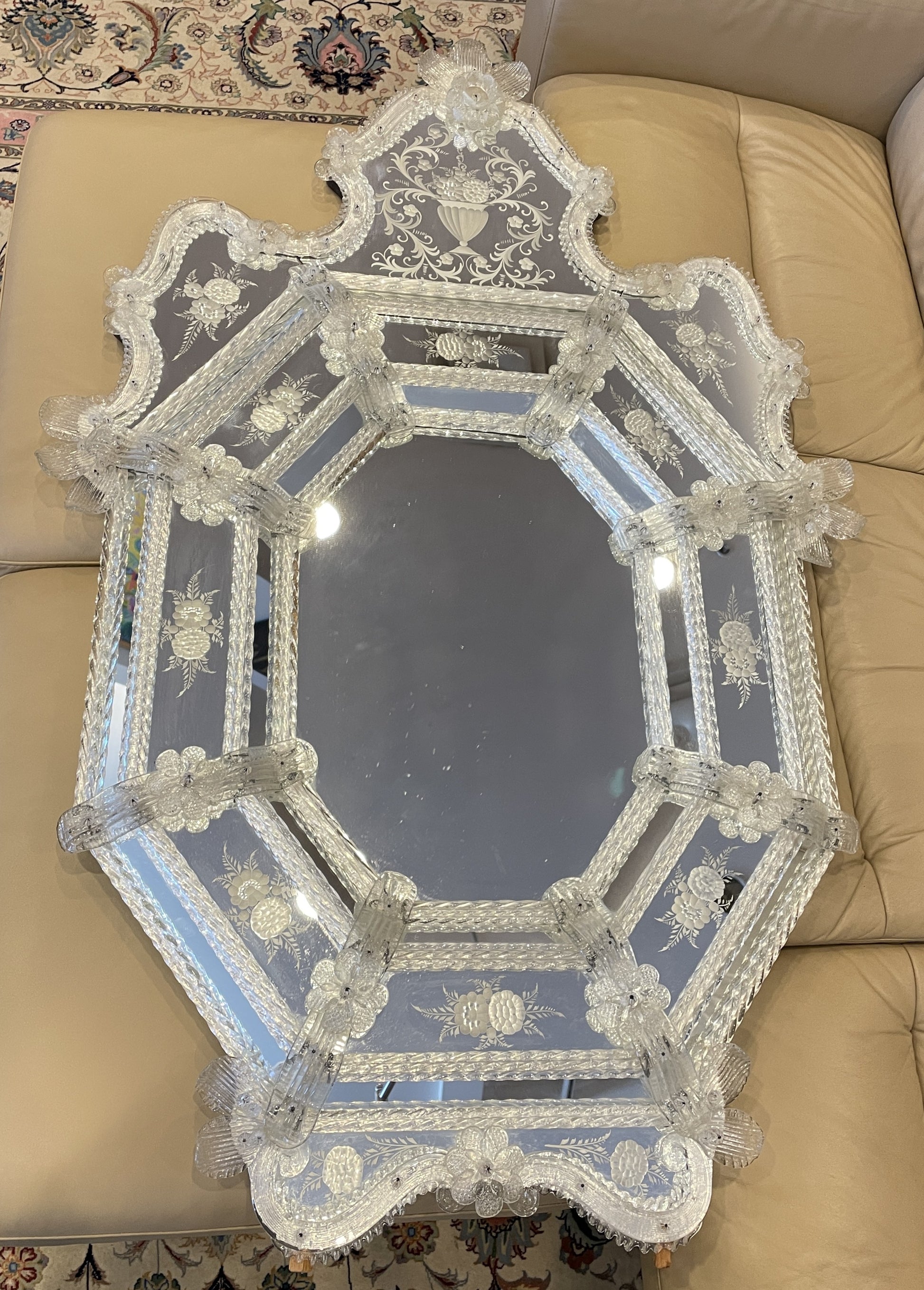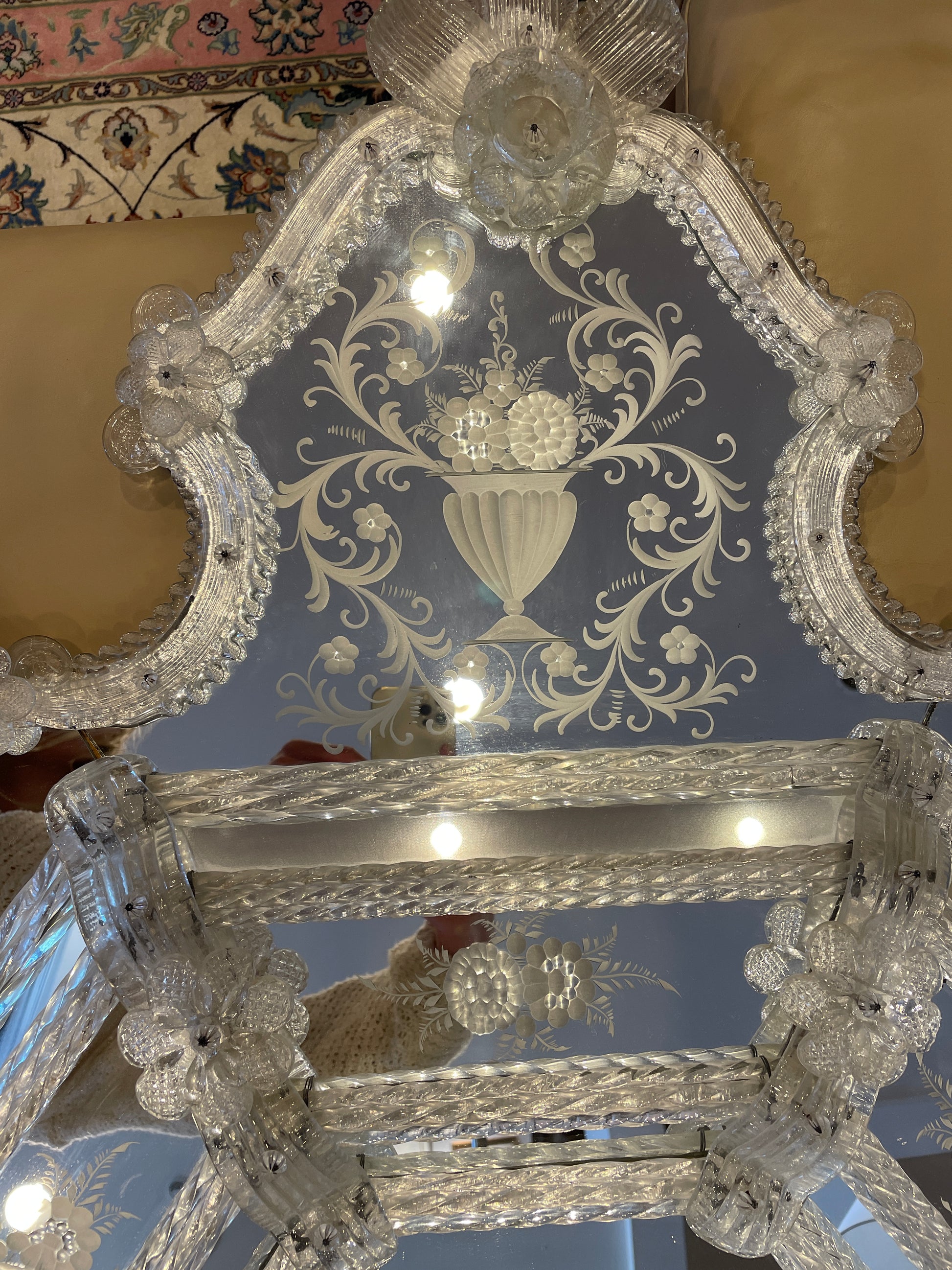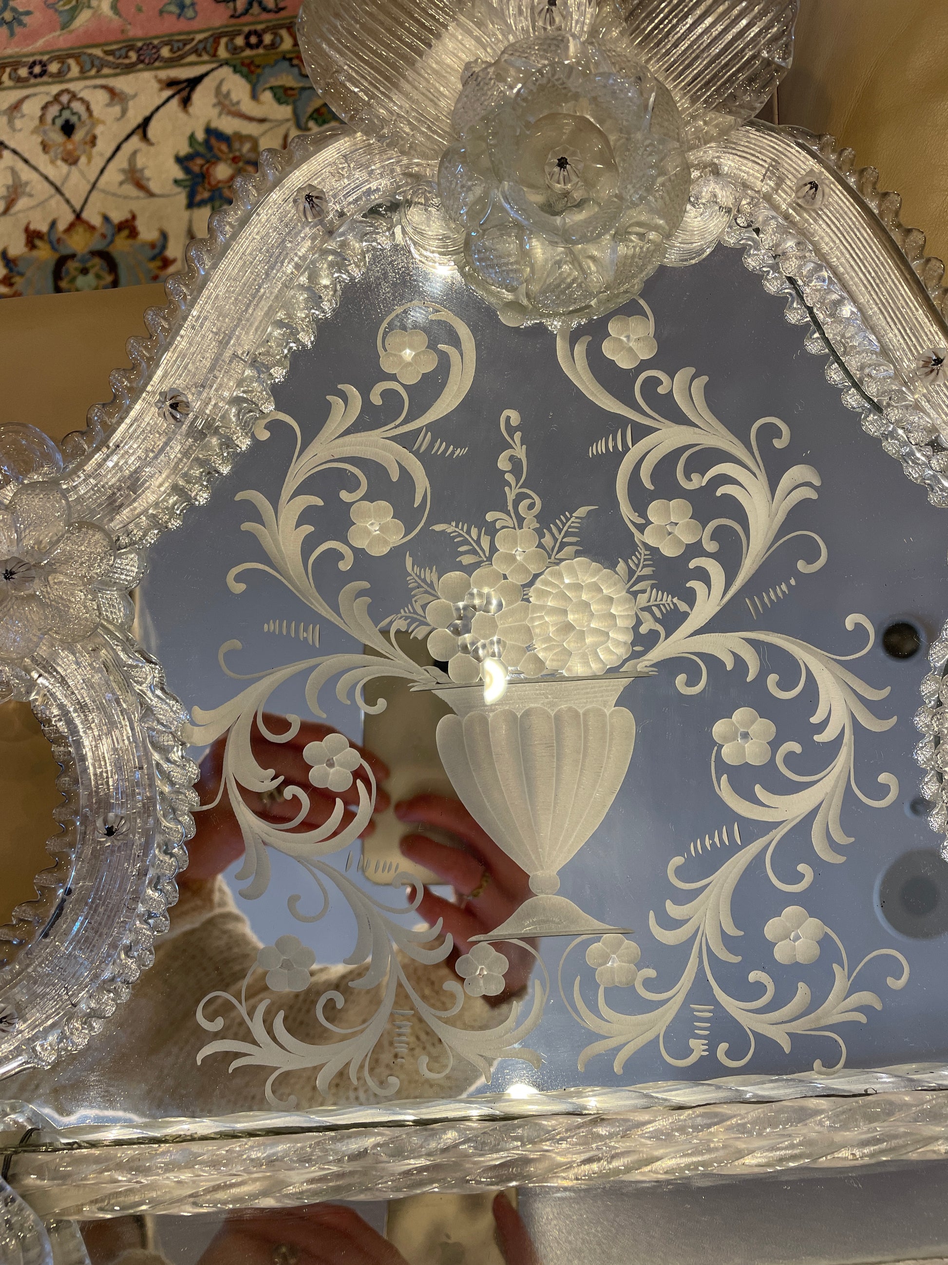 This Murano Venetian Mirror is a stunning example of traditional Italian glass artistry. Handcrafted in Murano, Italy, it features intricate etched detailing, elegant floral accents, and a beautifully beveled glass frame. Both decorative and functional, this mirror adds timeless elegance and a touch of old-world glamour to any space.