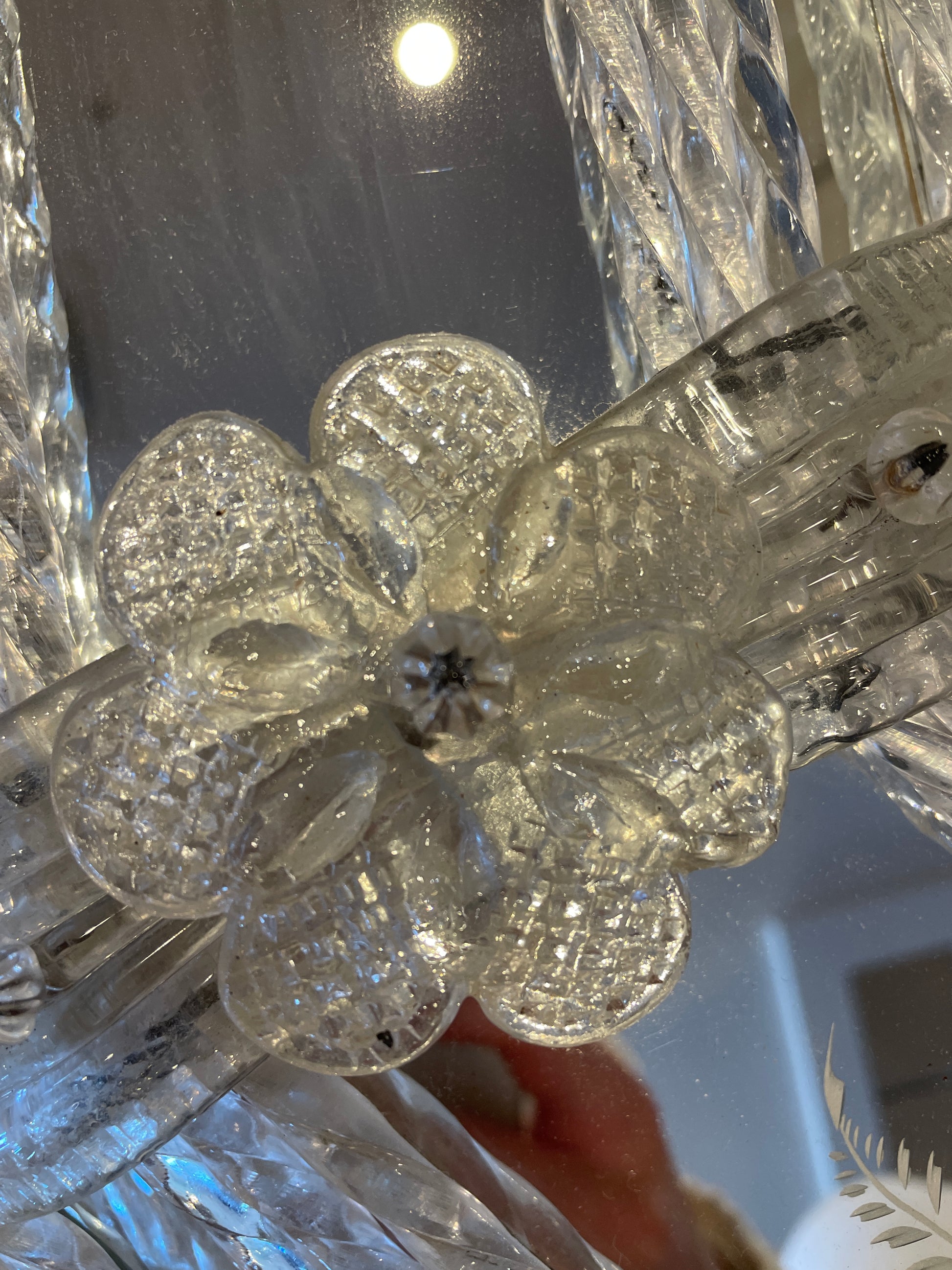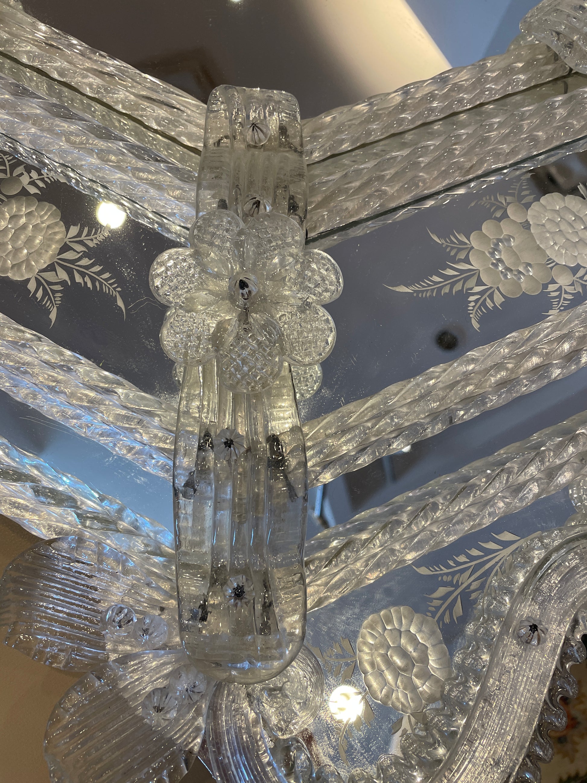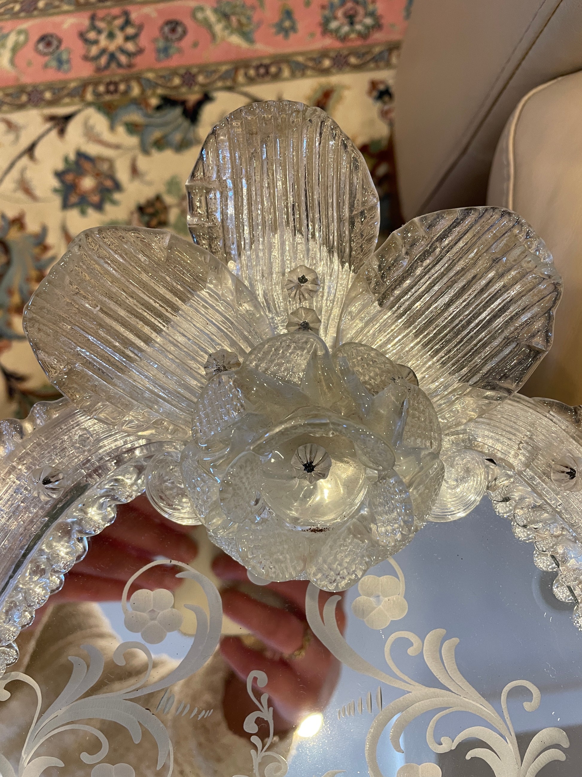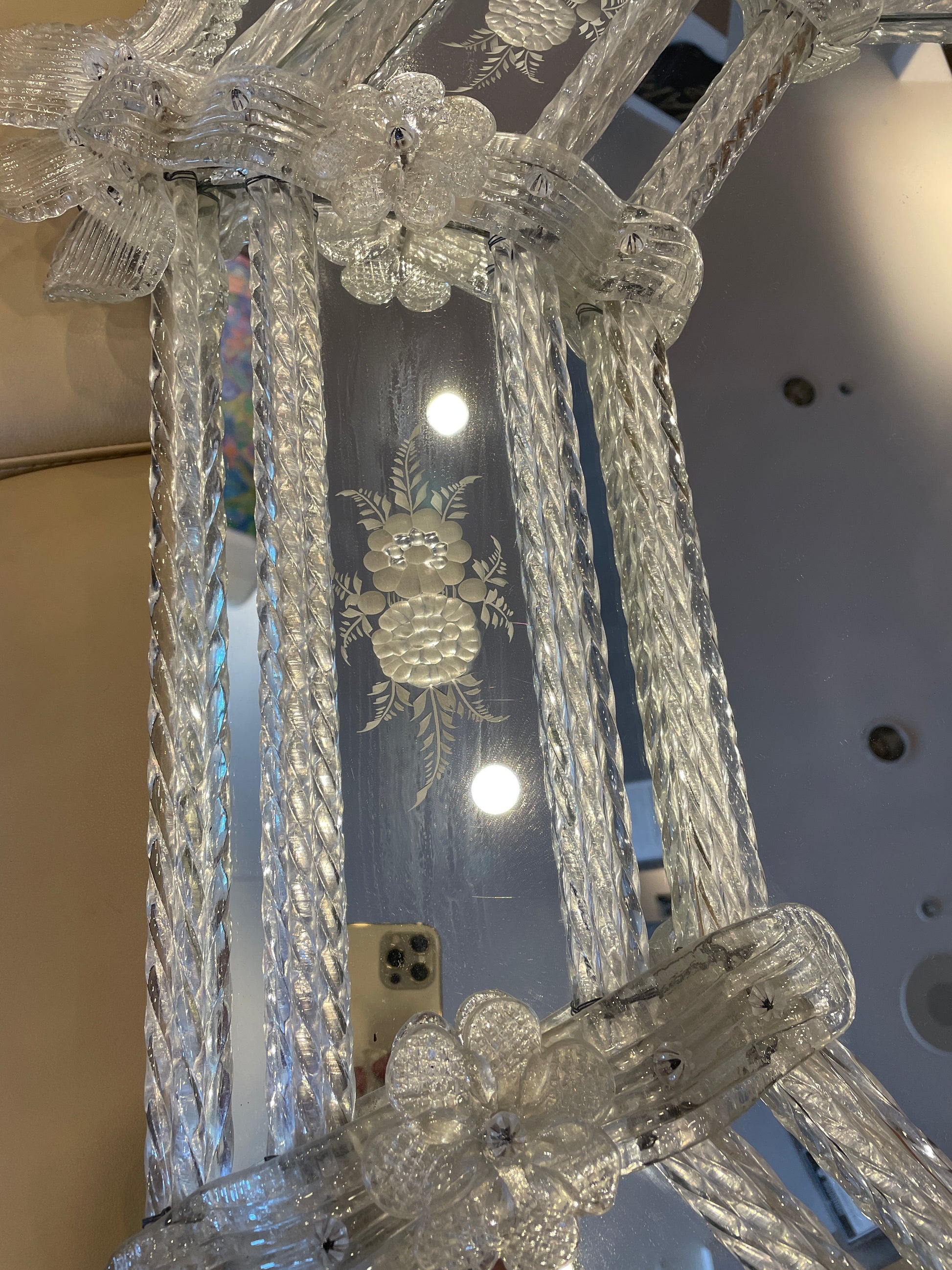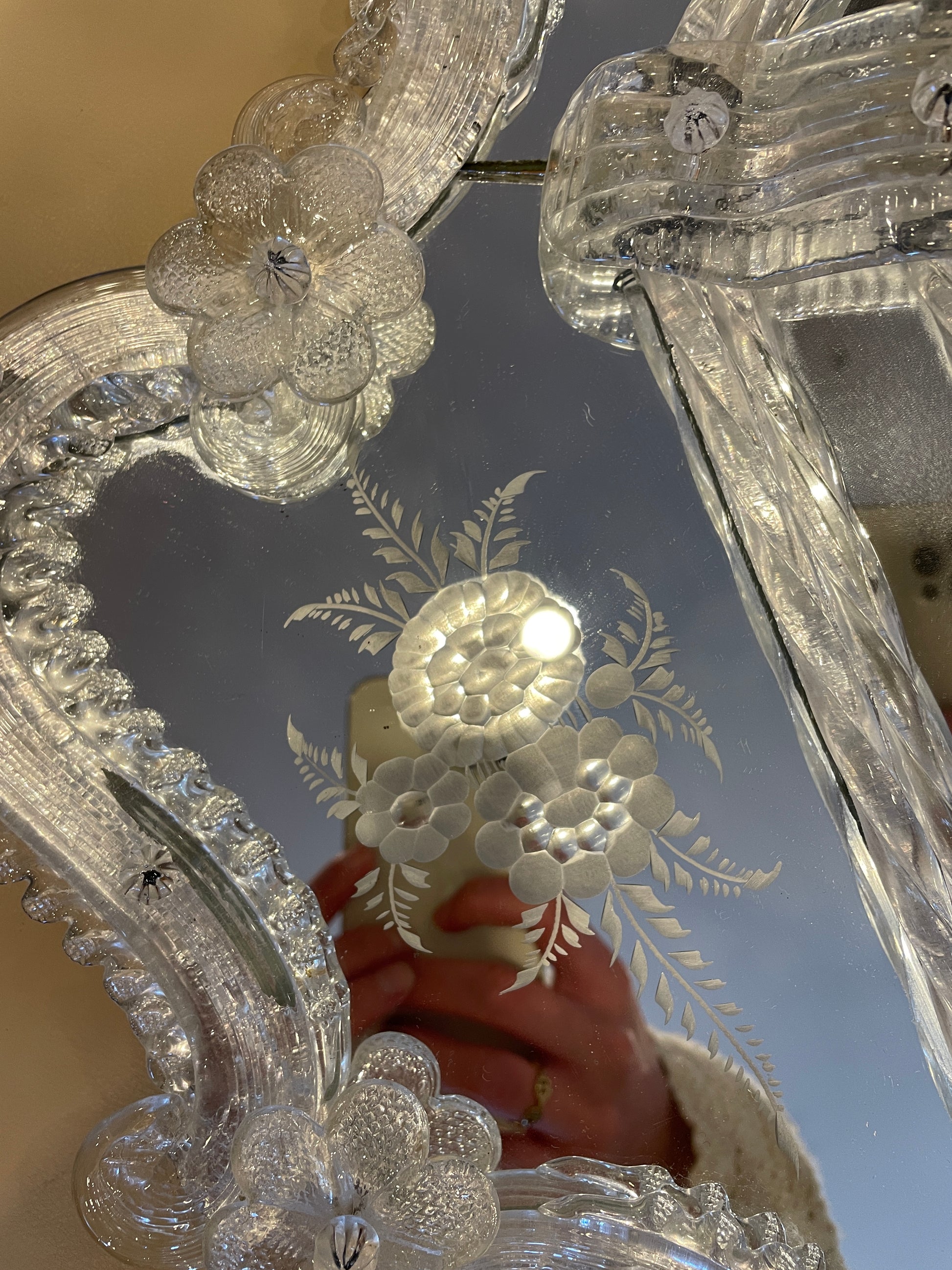 This Murano Venetian Mirror is a stunning example of traditional Italian glass artistry. Handcrafted in Murano, Italy, it features intricate etched detailing, elegant floral accents, and a beautifully beveled glass frame. Both decorative and functional, this mirror adds timeless elegance and a touch of old-world glamour to any space.