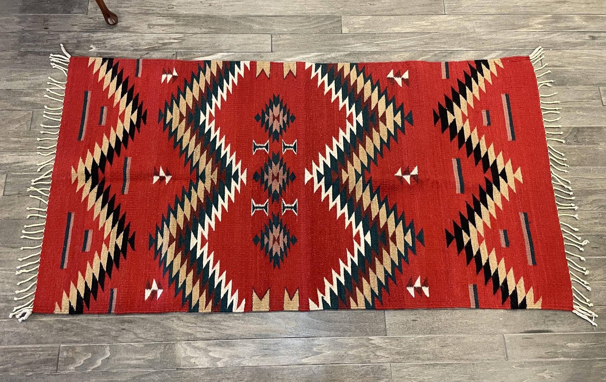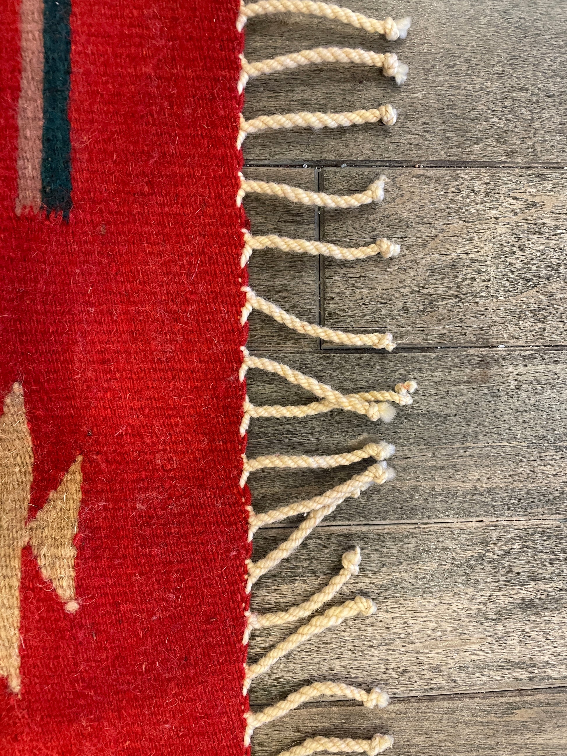 This rug is from the Navajo tribe (an indigenous people of the Southwestern states). It features a red background with a green, black, and tan geometric pattern. Complete with cream fringe.