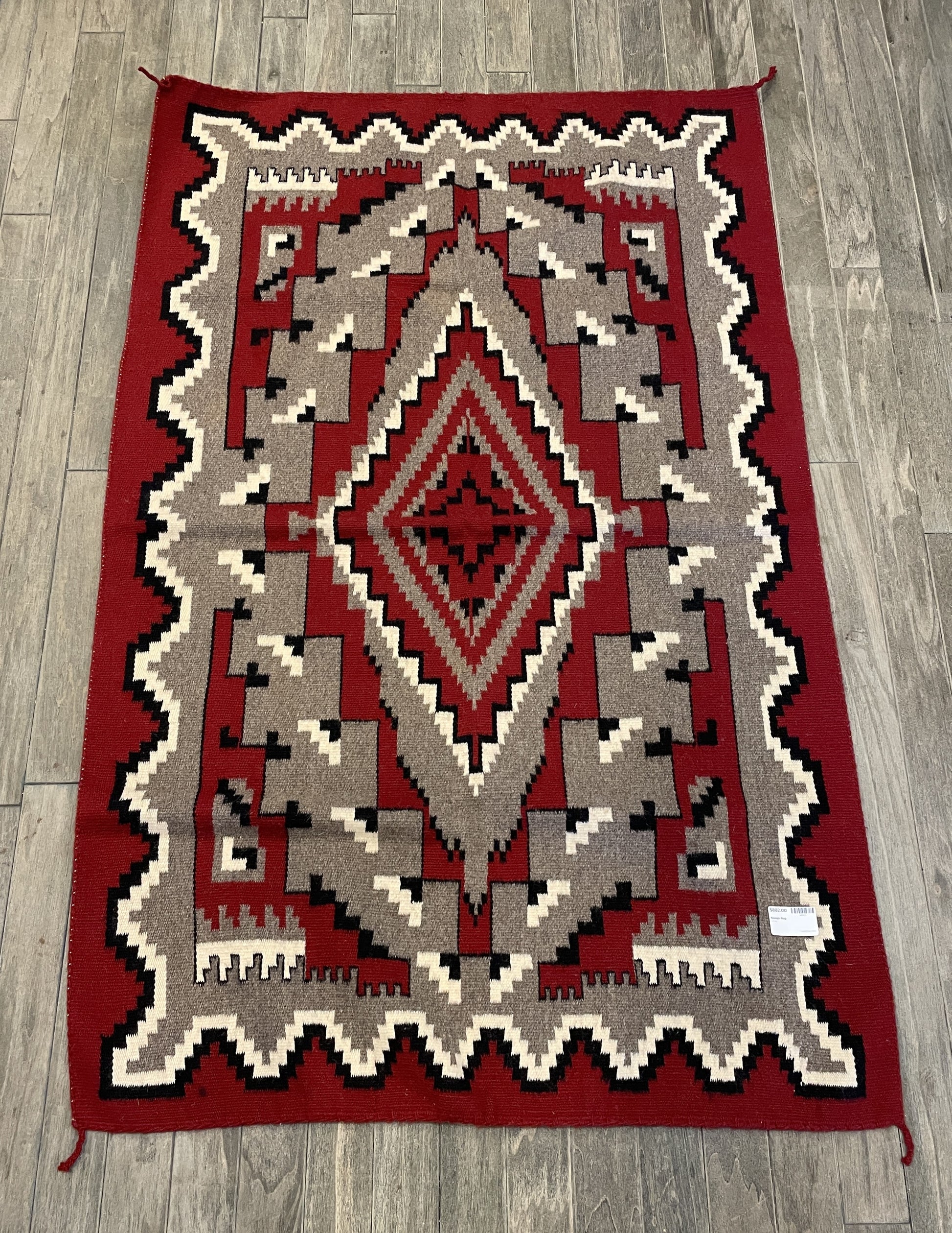 This rug is from the Navajo tribe (an indigenous people of the Southwestern states). It features a red background a grey, black, and cream geometric pattern.