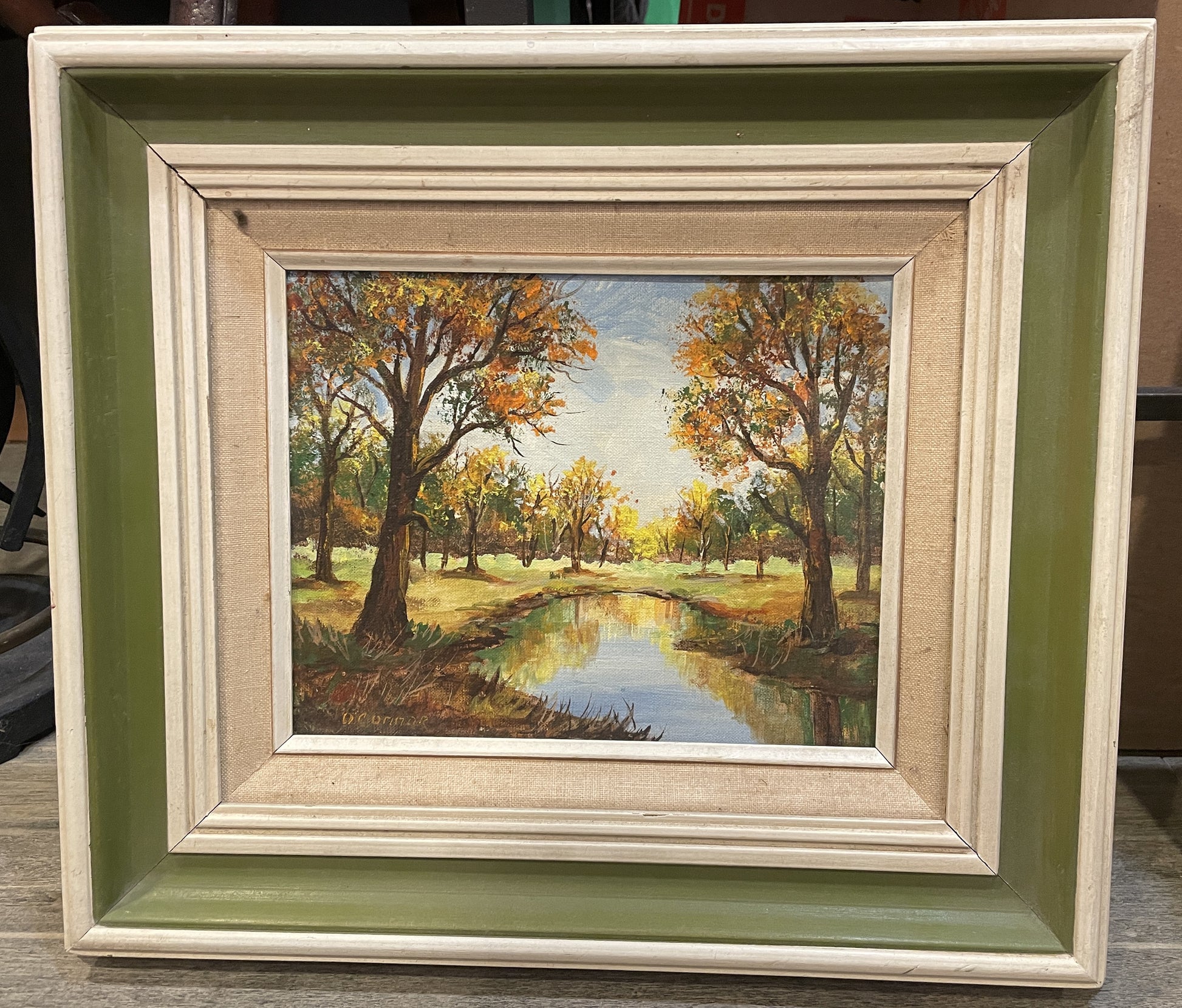 O'Connor oil on canvas fall scene. Signed lower left. This beautiful painting depicts a small pond lined with autumn trees. A cloudy blue sky forms the background of this piece. The leaves of the trees are shades of orange, yellow, and green with orange being more prominent in the foreground and greener trees in the back. The piece is matted and framed. The mat is a beige color, and the frame is green with a white border on the inner and outer edge. A piece rich in color and charm that's sure to brighten up any space.