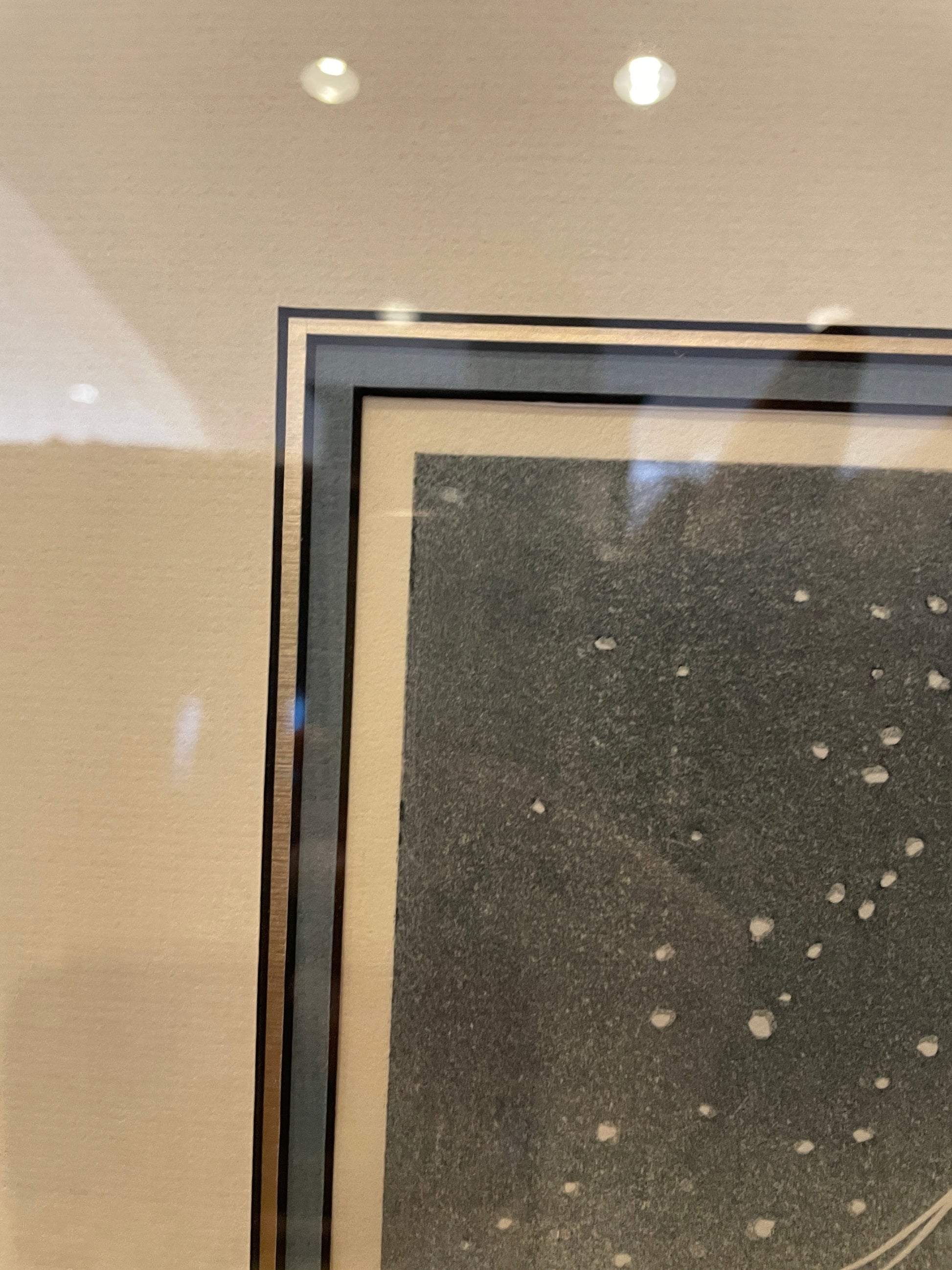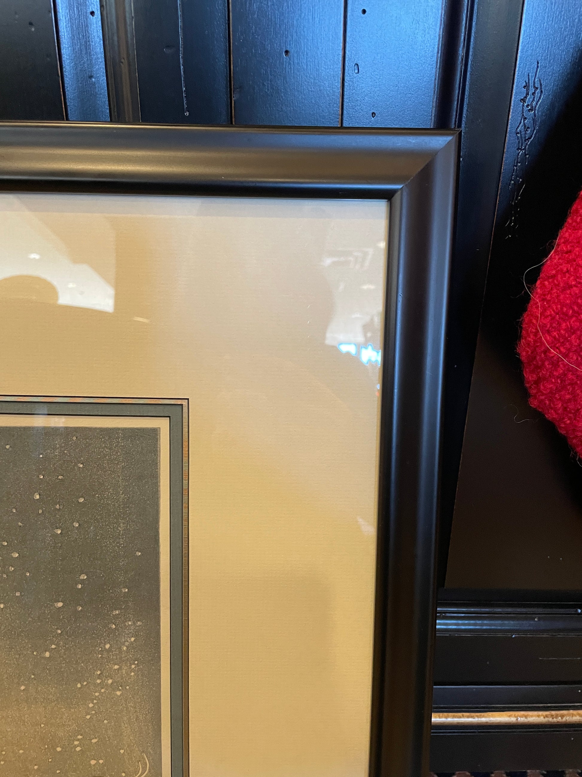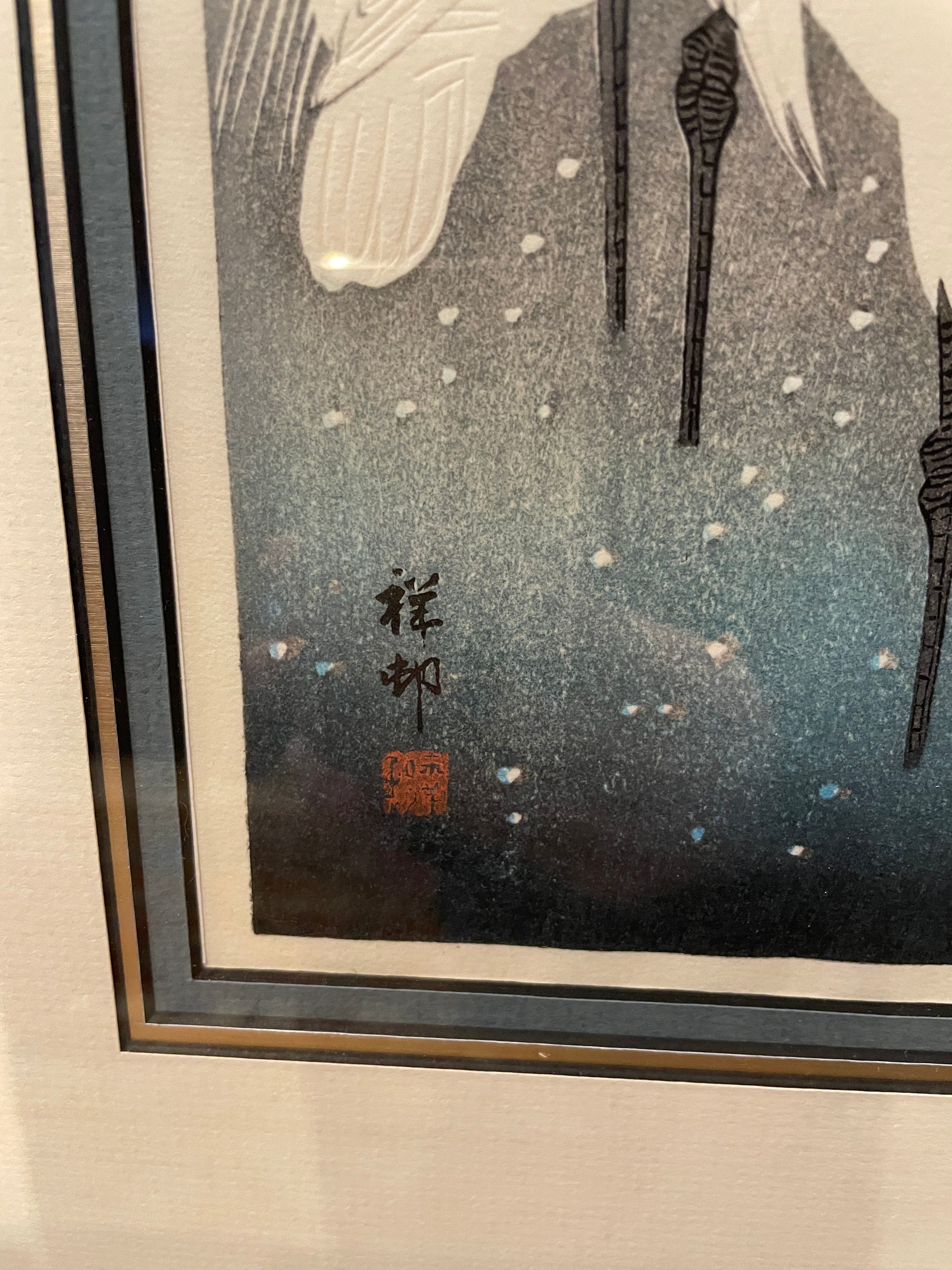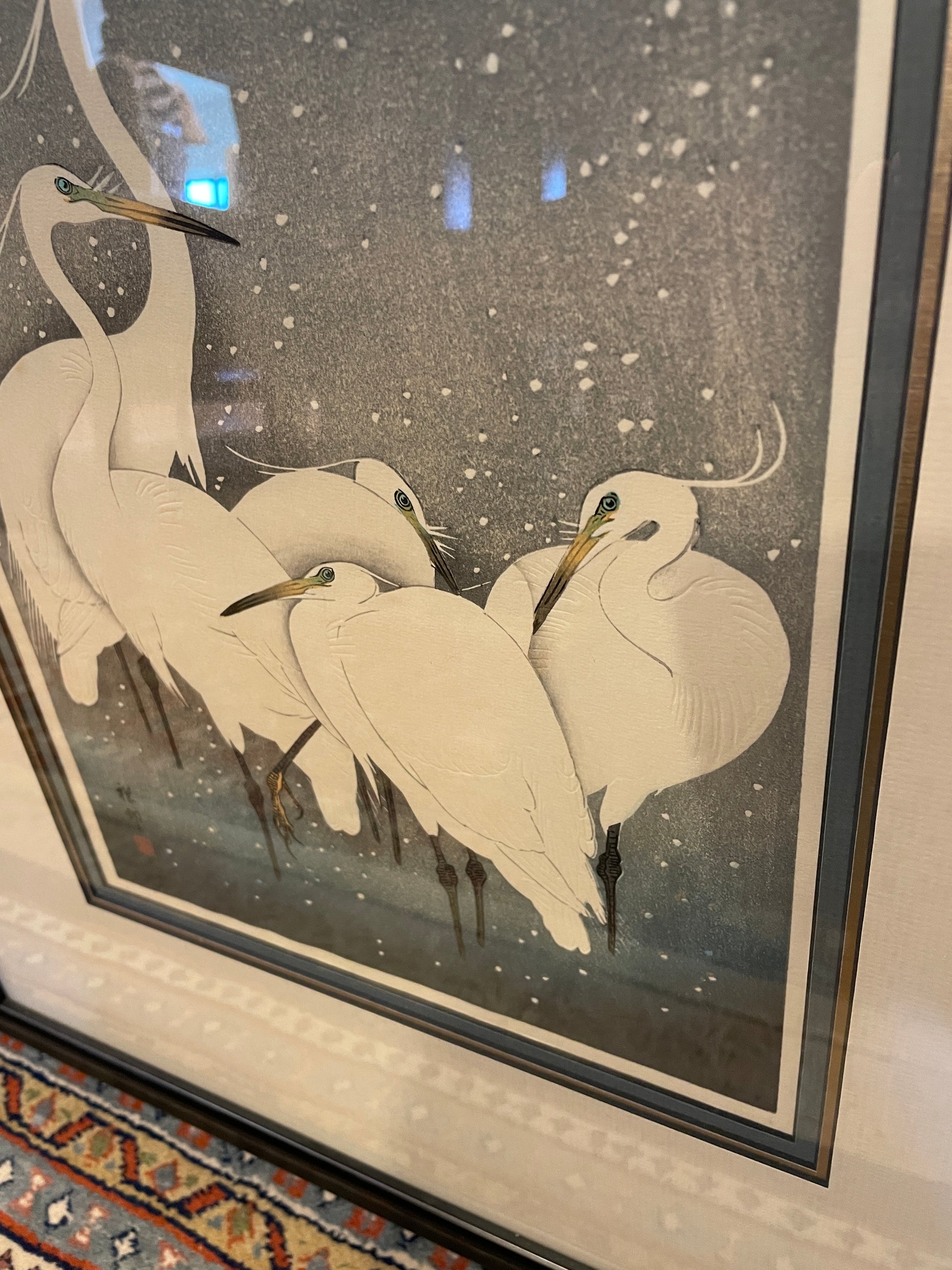 Oharah Shoson "Egrets" woodblock print. This beautiful woodblock print depicts five egrets standing in water as it snows. The dark, cloudy background gives this piece a cool tone that is further emphasized by the snowfall. The egrets stand in a variety of poses, some with their heads up, some with their heads tucked close to their bodies. The piece has a calm, serene feel. The print is set on a white mat with a subtle inner border detail that includes cornflower blue and gold framing pieces. It is also held in a simple black frame with a beveled edge. A stunning piece in a traditional Japanese style that is sure to elevate any space.