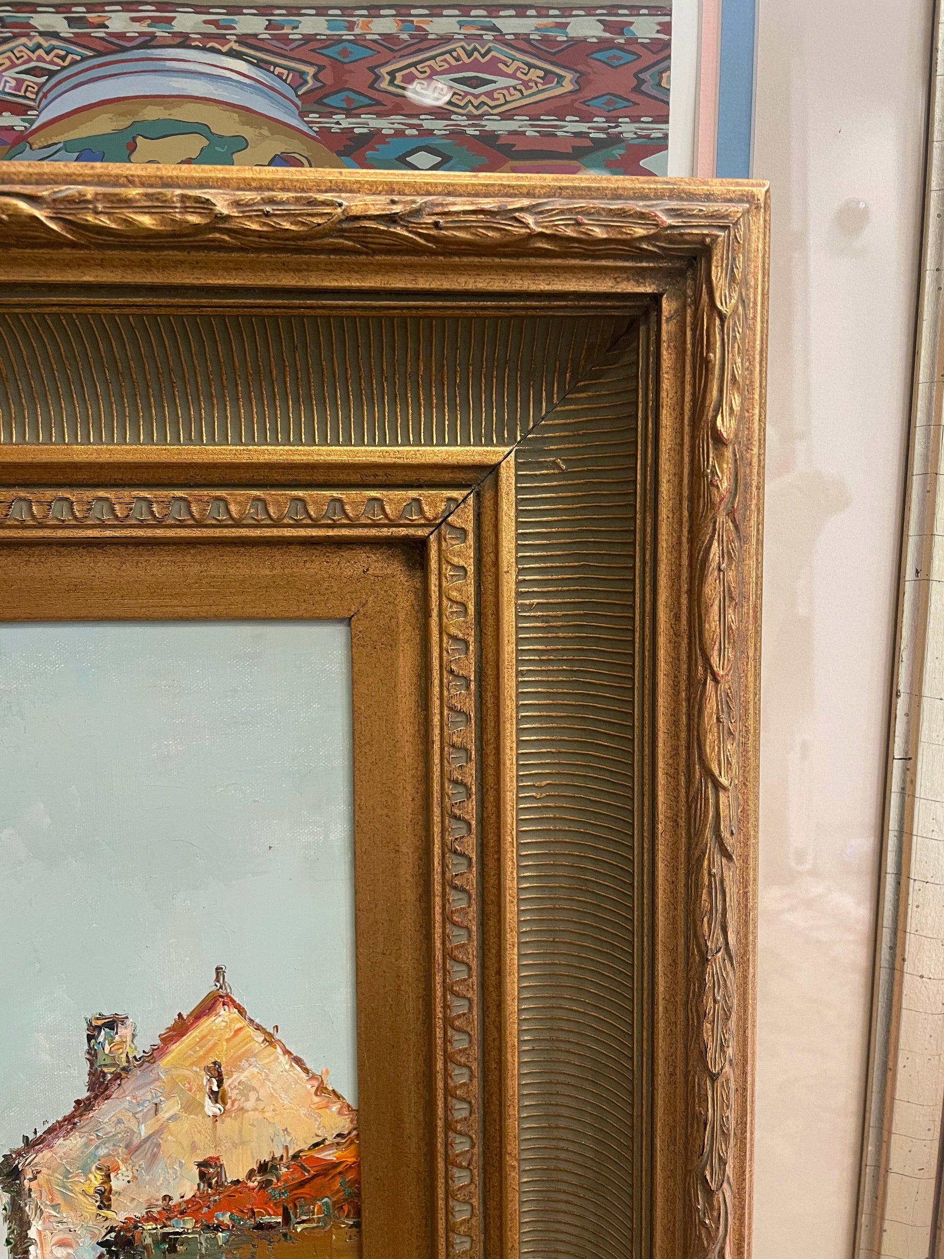 Gorgeous oil on canvas canal scene. Signed "Morgan" lower left. This beautiful impressionist painting depicts a canal. The scene features a group of boats that line the left side of the water. They sit against a wooden dock that has a couple of people strolling. The background of the piece is lined with some large buildings which are backed by a hazy sky. The piece is held in a thick, gilt carved frame that has various patterns including channels, feather-like details, and geometric designs. this canal scene is a charming nautical piece sure to elevate any space with impressionist flare.