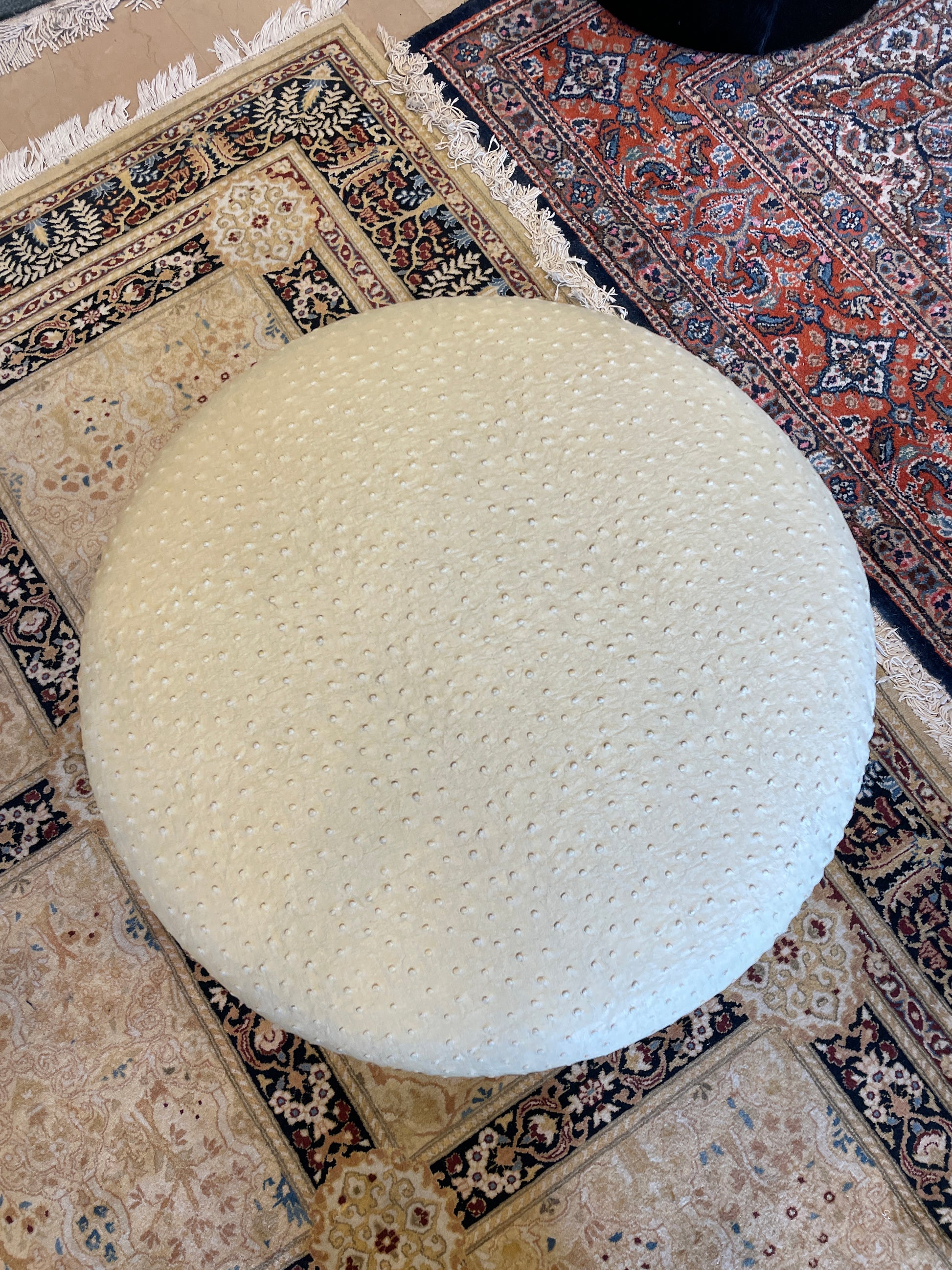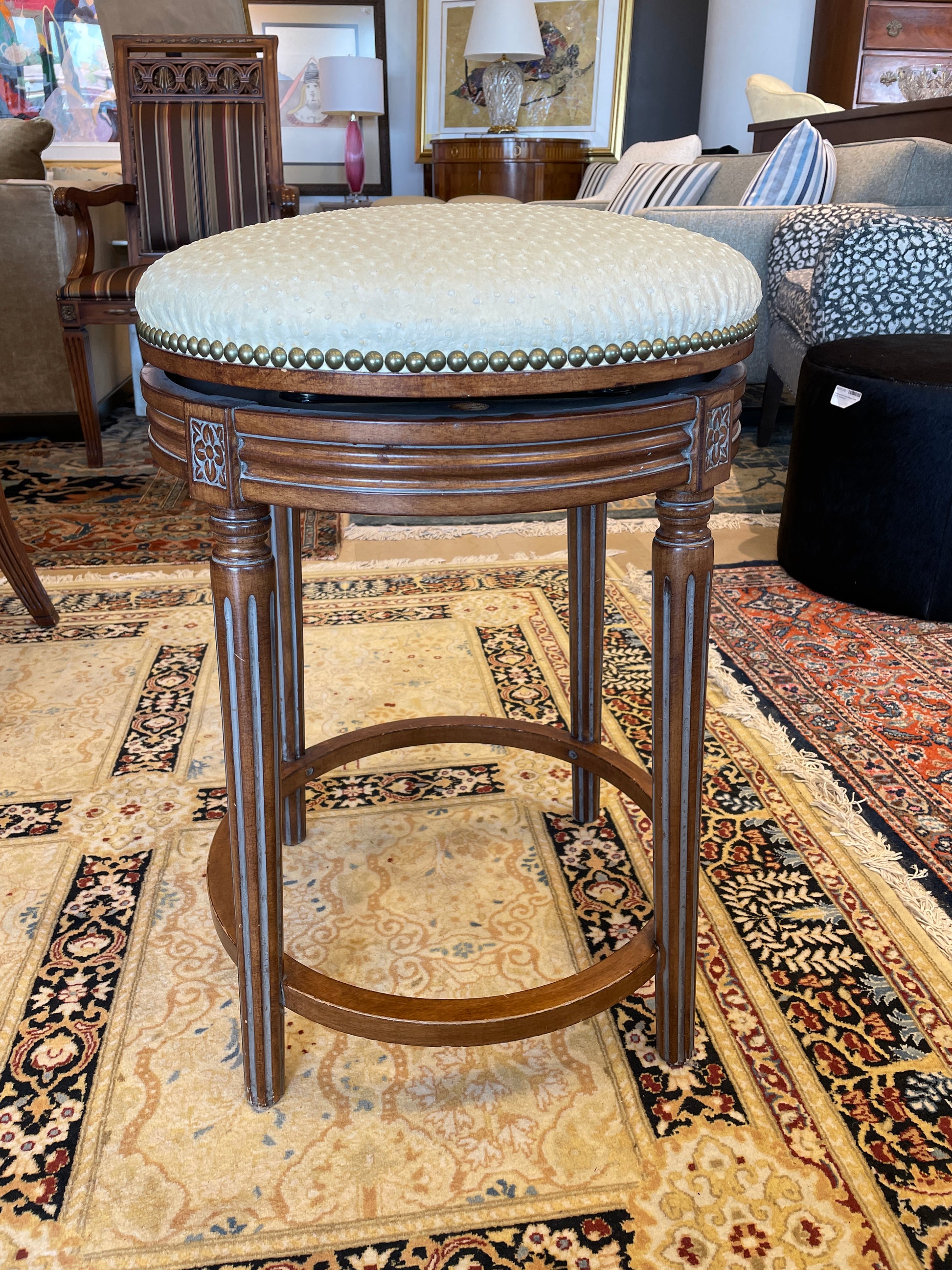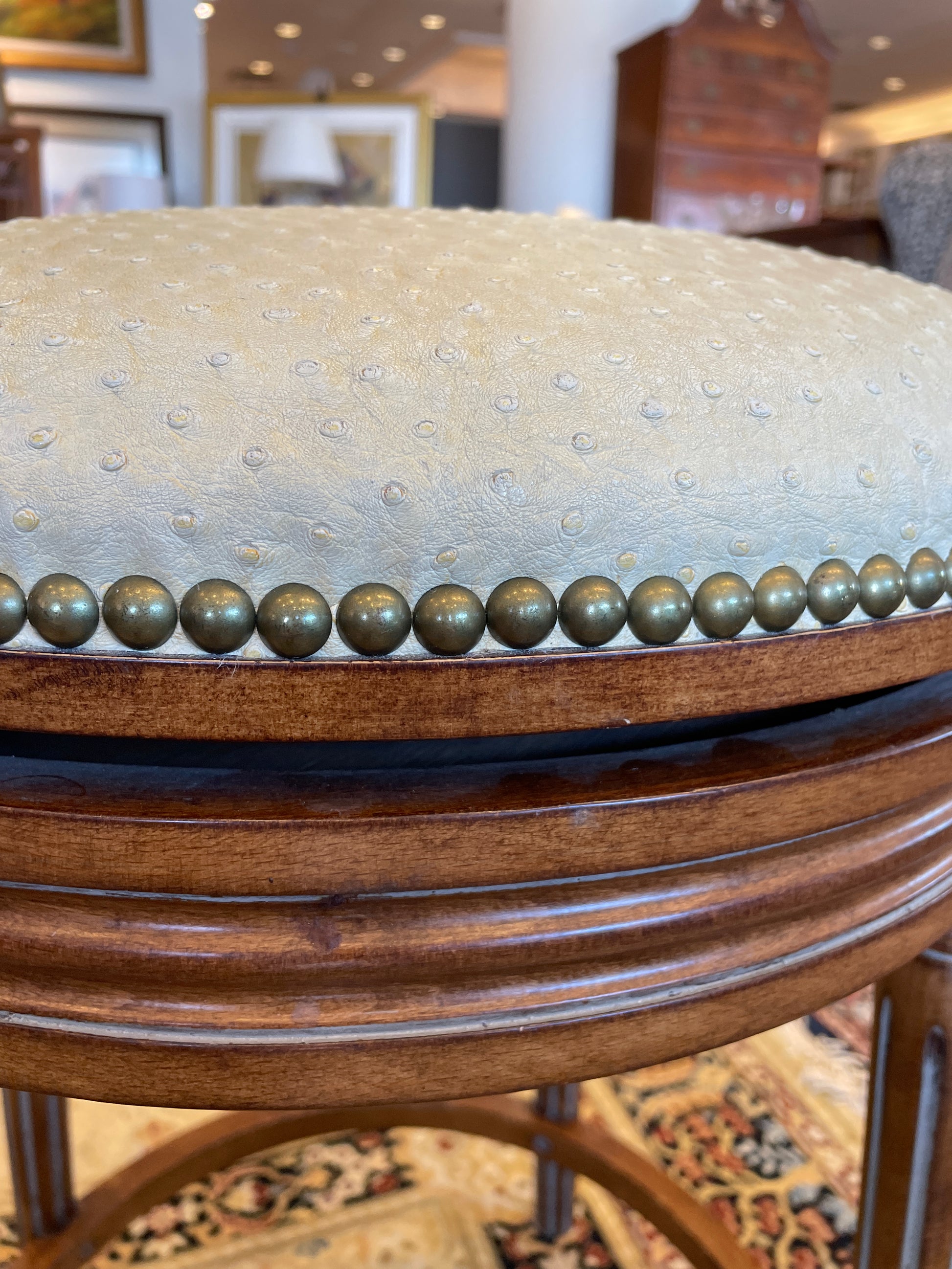 Unique ostrich leather swivel stool. This sleek circular stool sits on a wooden frame with fluted legs and a round stretcher. At the point where the legs meet the base of the cushion, there is a small carved design. The white ostrich leather seat is attached with brass studs. The top of the stool swivels for comfort and ease of use. A fun and beautiful piece that's sure to add character to a room.