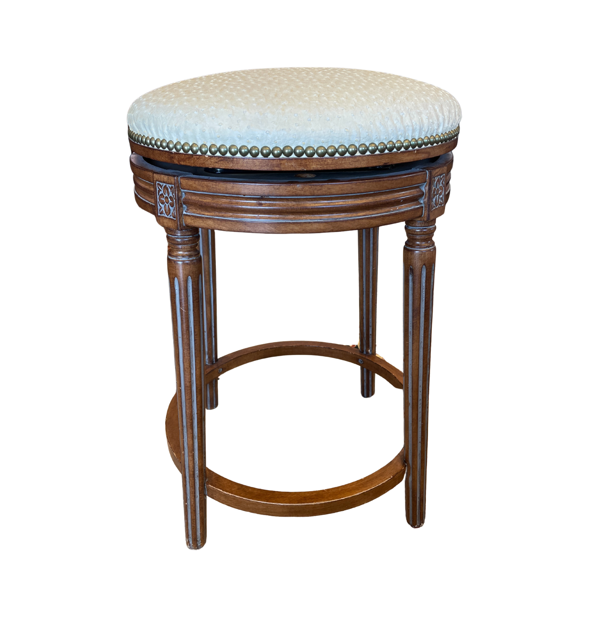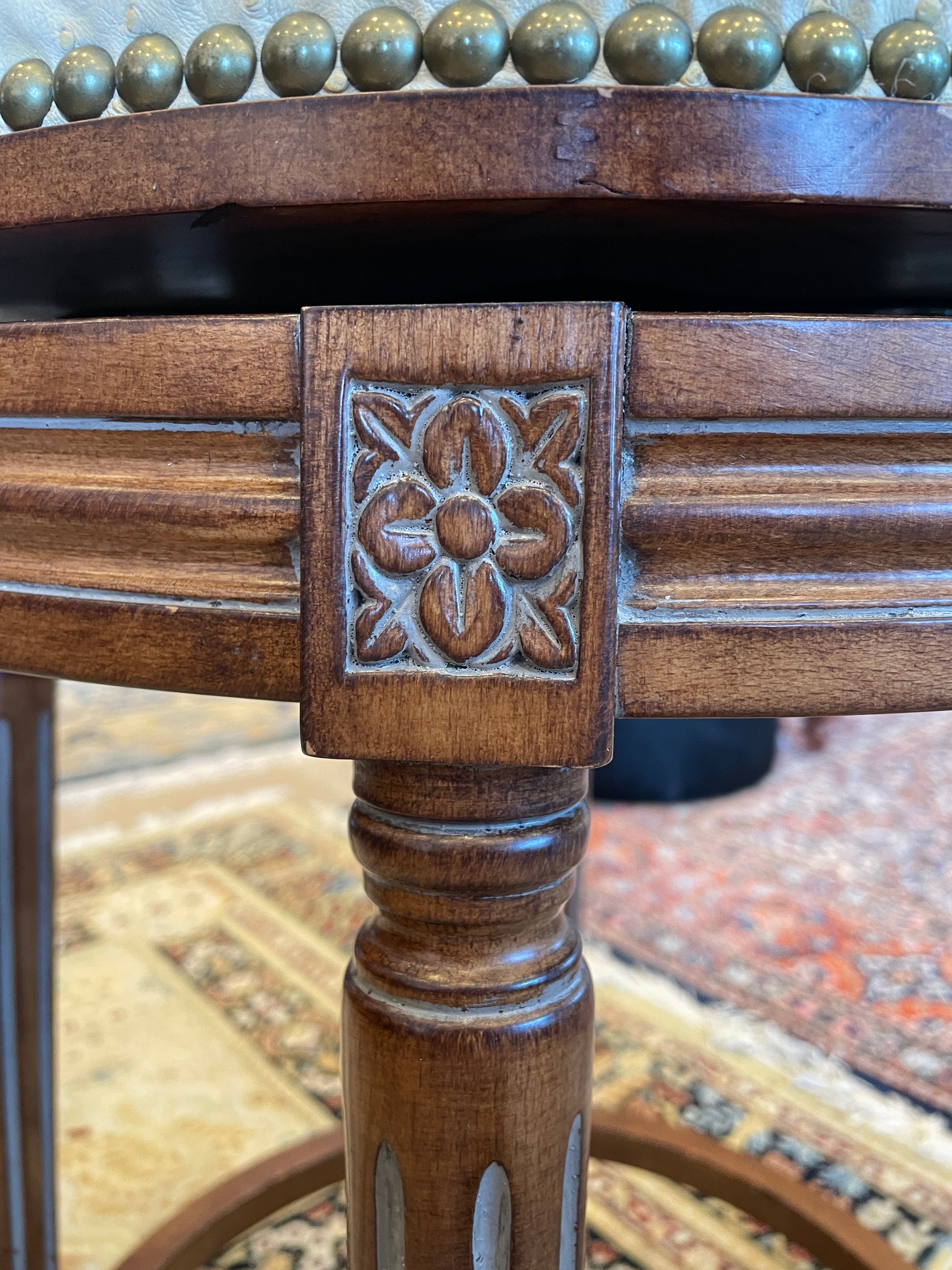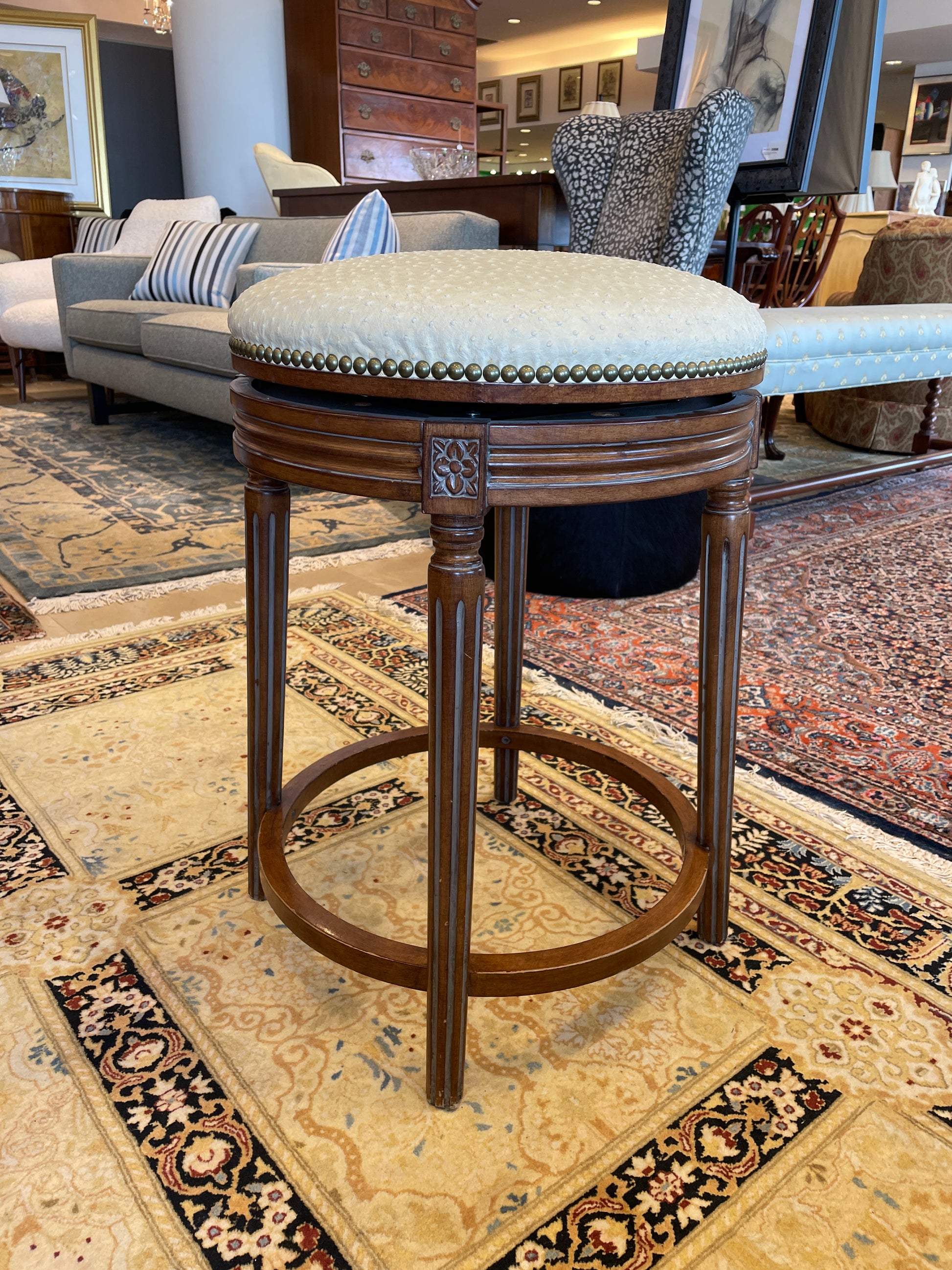 Unique ostrich leather swivel stool. This sleek circular stool sits on a wooden frame with fluted legs and a round stretcher. At the point where the legs meet the base of the cushion, there is a small carved design. The white ostrich leather seat is attached with brass studs. The top of the stool swivels for comfort and ease of use. A fun and beautiful piece that's sure to add character to a room.
