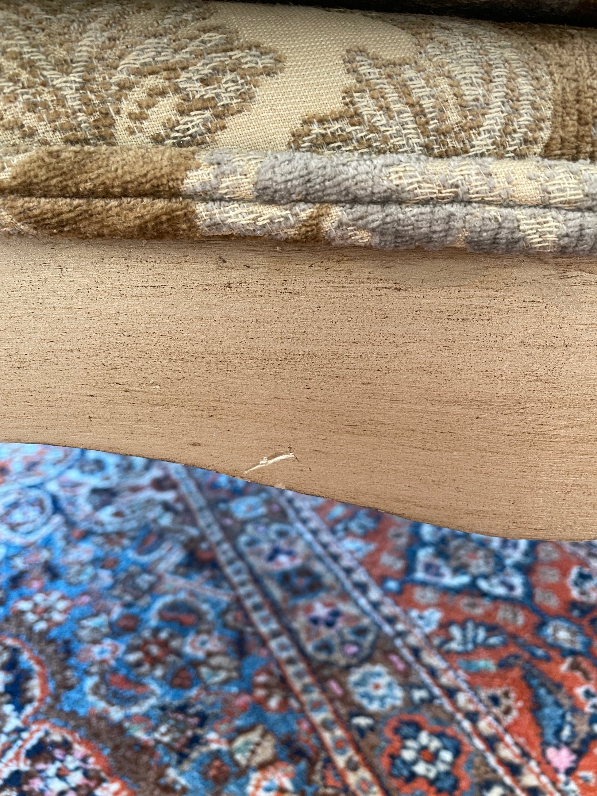 This item is sold in AS IS condition. The fabric is fraying in spots, and there are some dings to the wood. Please see photos for details.
