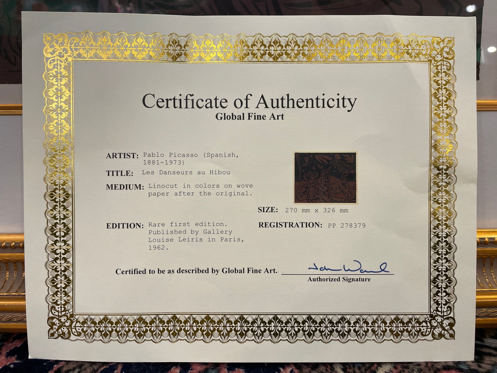 Framed linocut of "Les Danseurs au Hibou" by Pablo Picasso. Made by carving a sheet of linoleum that is inked and then pressed onto wove paper to create a relief print. Certificate on file.