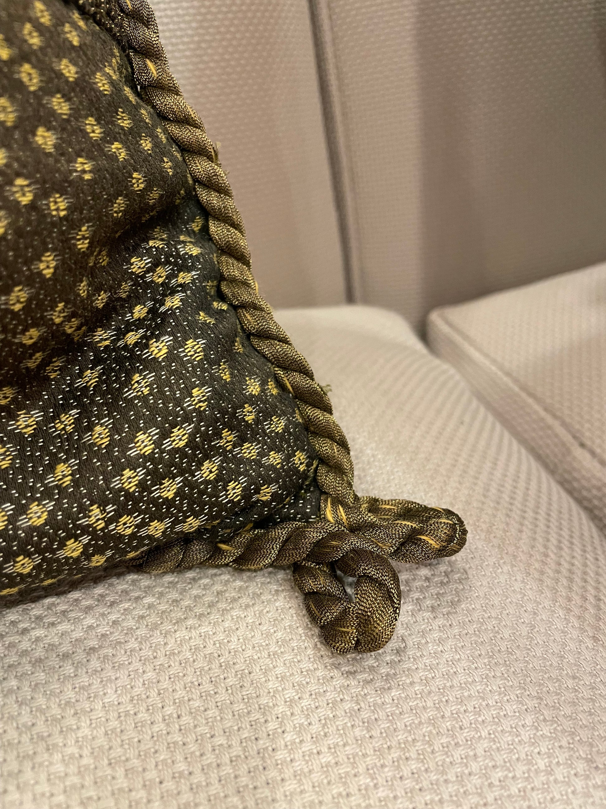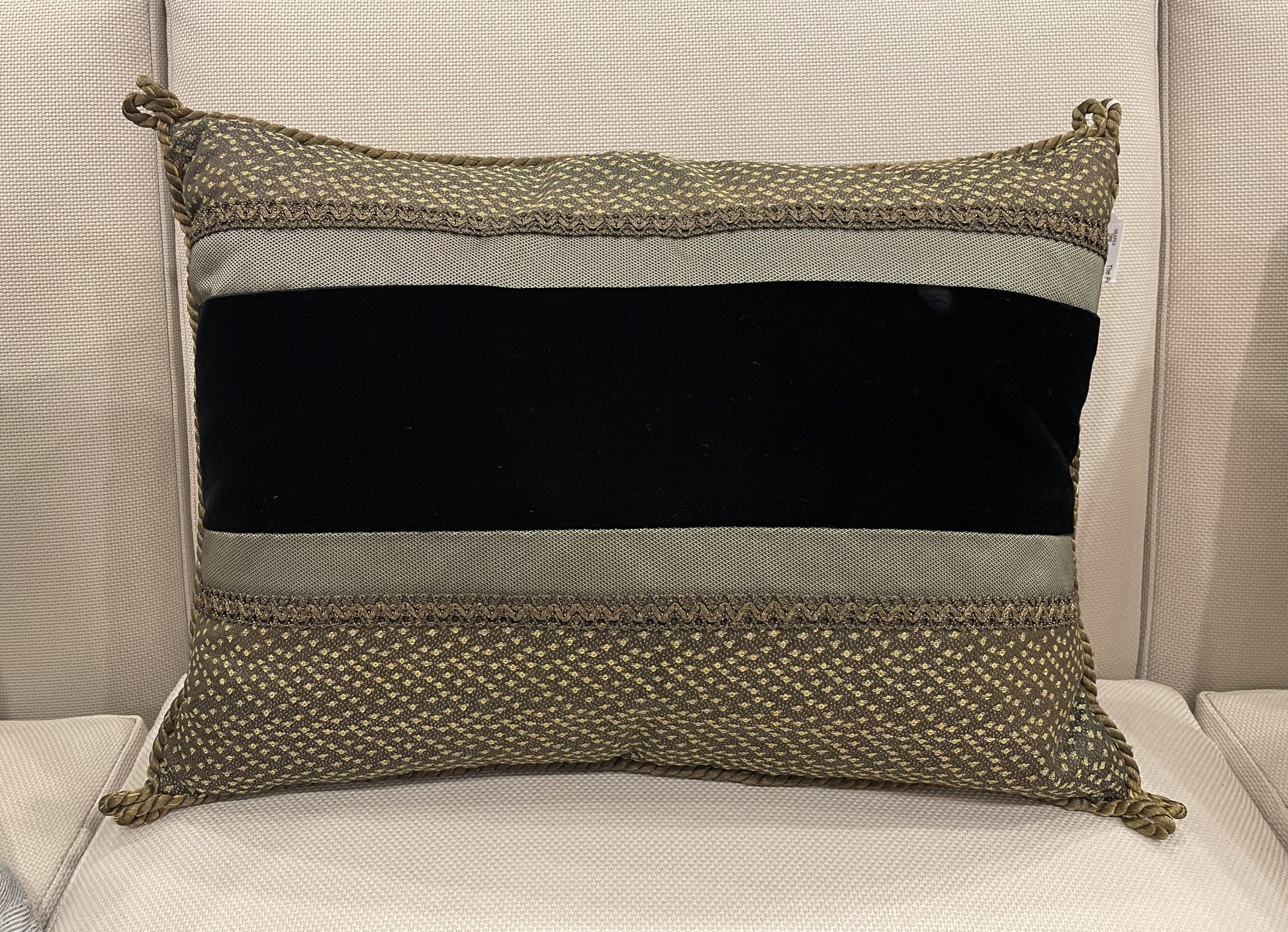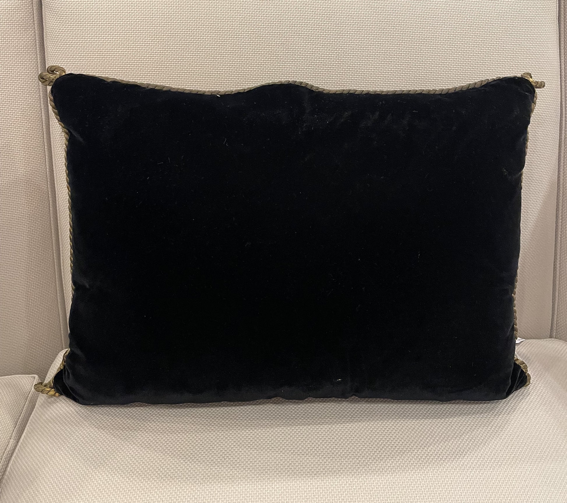 These 19th-century decorative pillows feature green obi silk with a black velvet center stripe. There is a small yellow floral pattern on the top and bottom edges. The perimeter is embellished with twisted cord trim. The back side is all black velvet