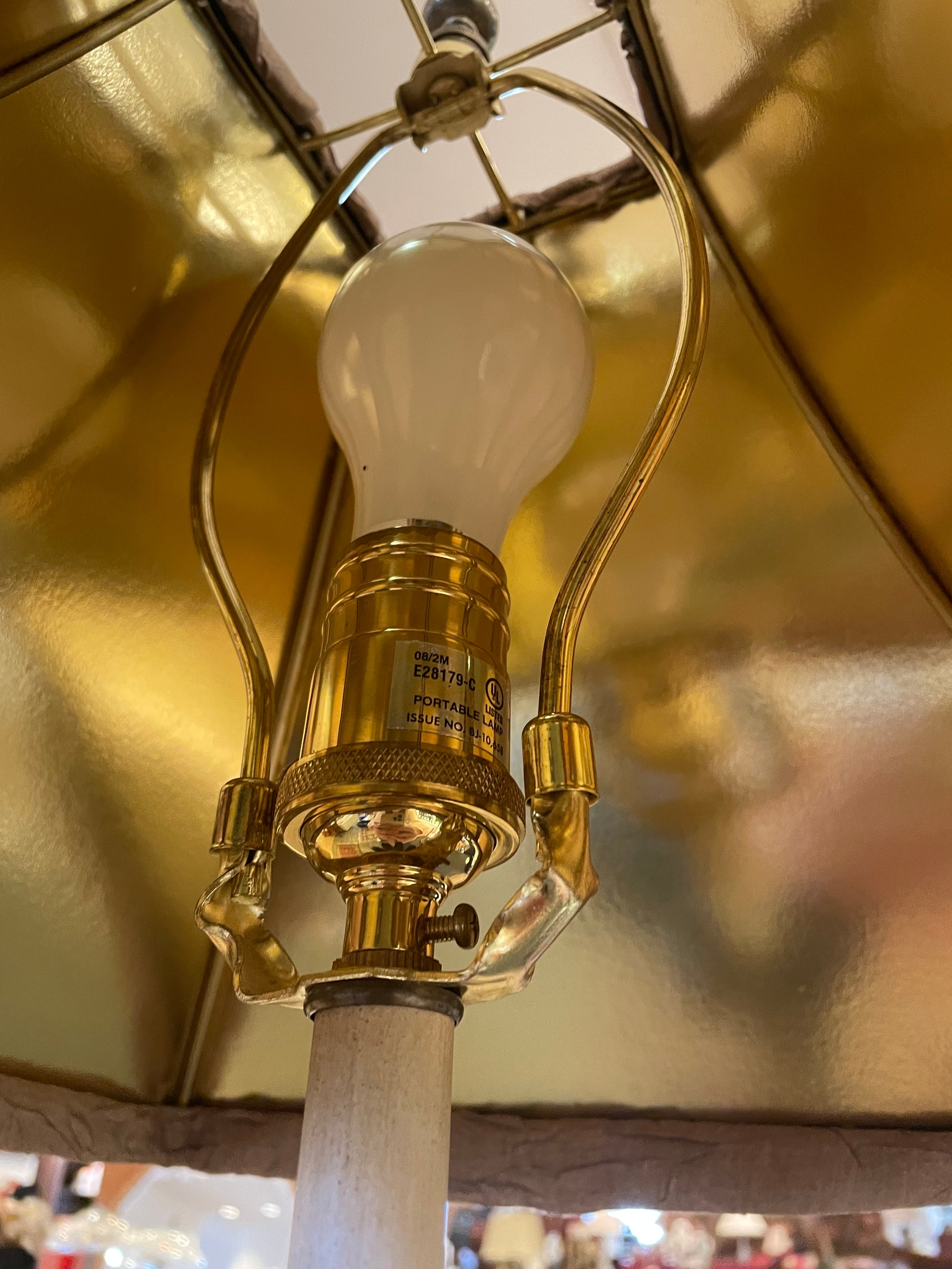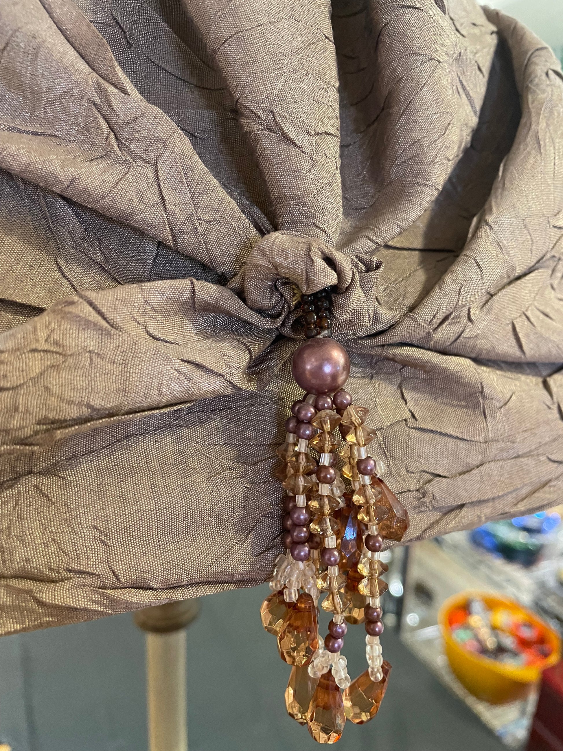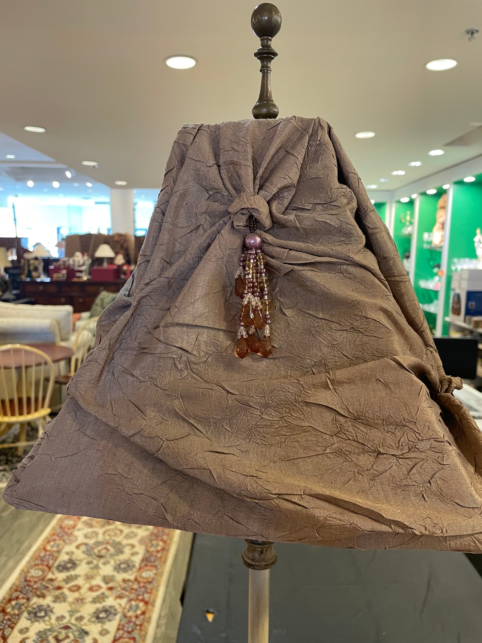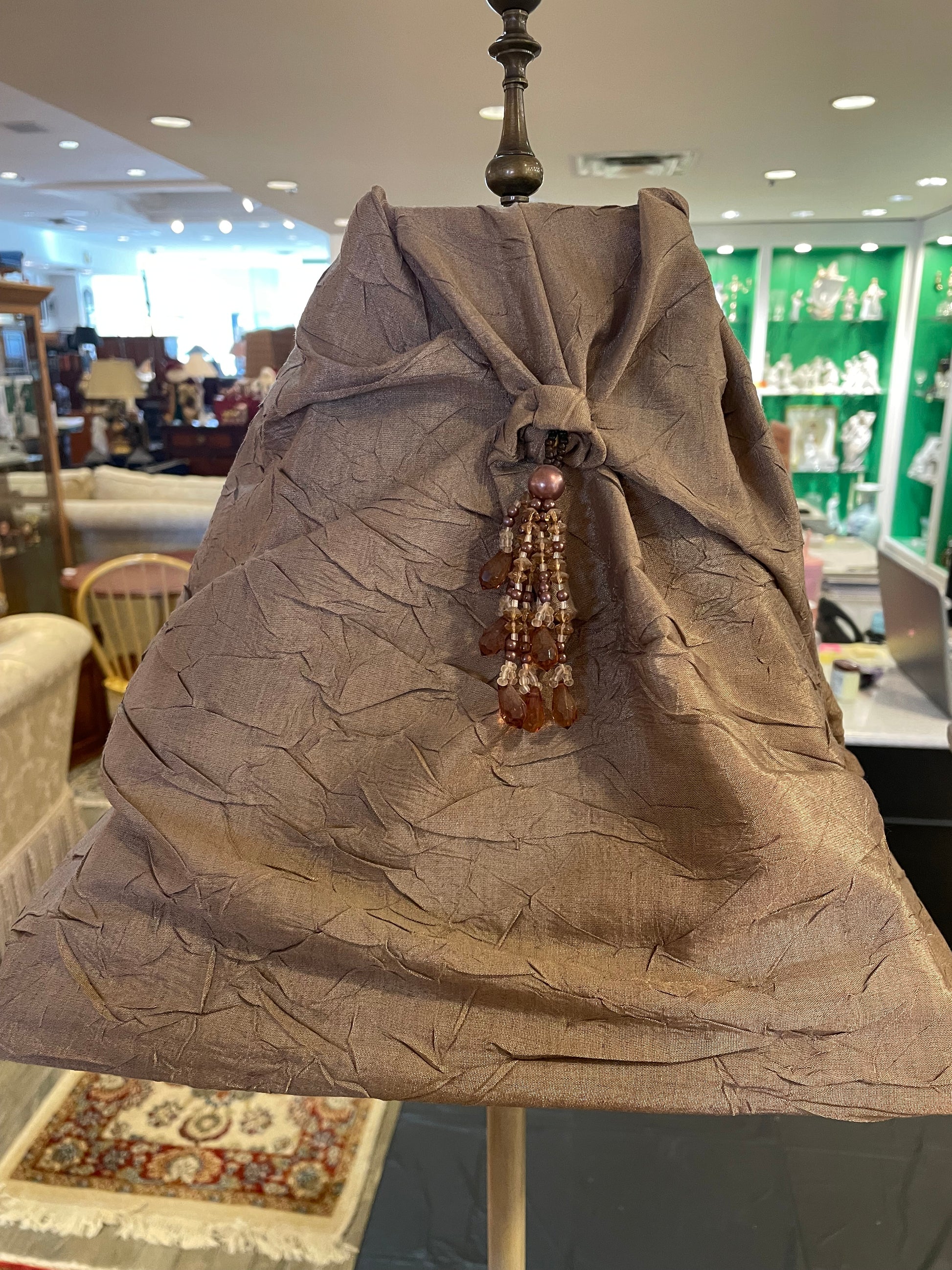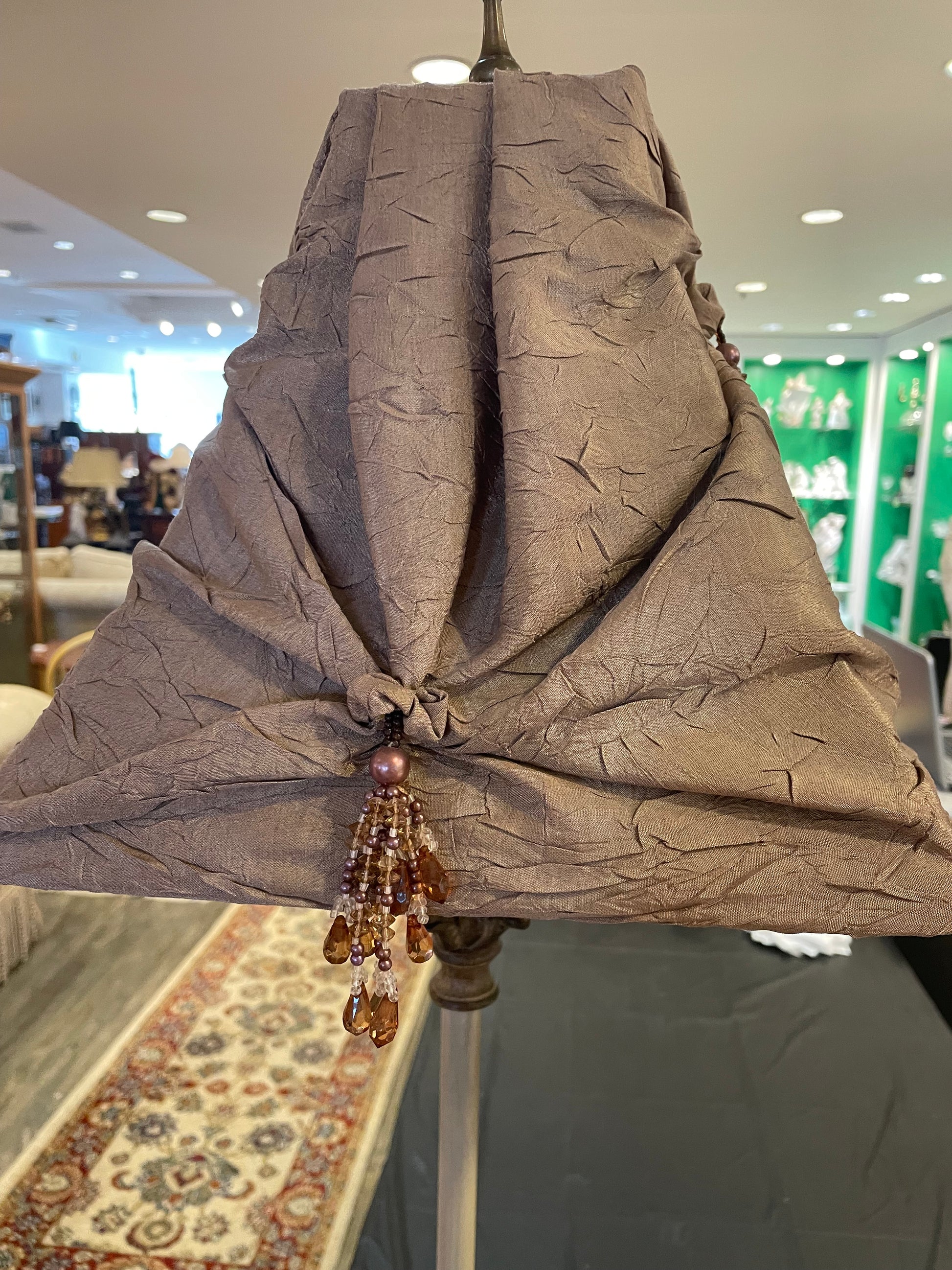 Pleated buffet lamps. Features two French-style bases with draped brown fabric-covered bell shades and beaded accents.