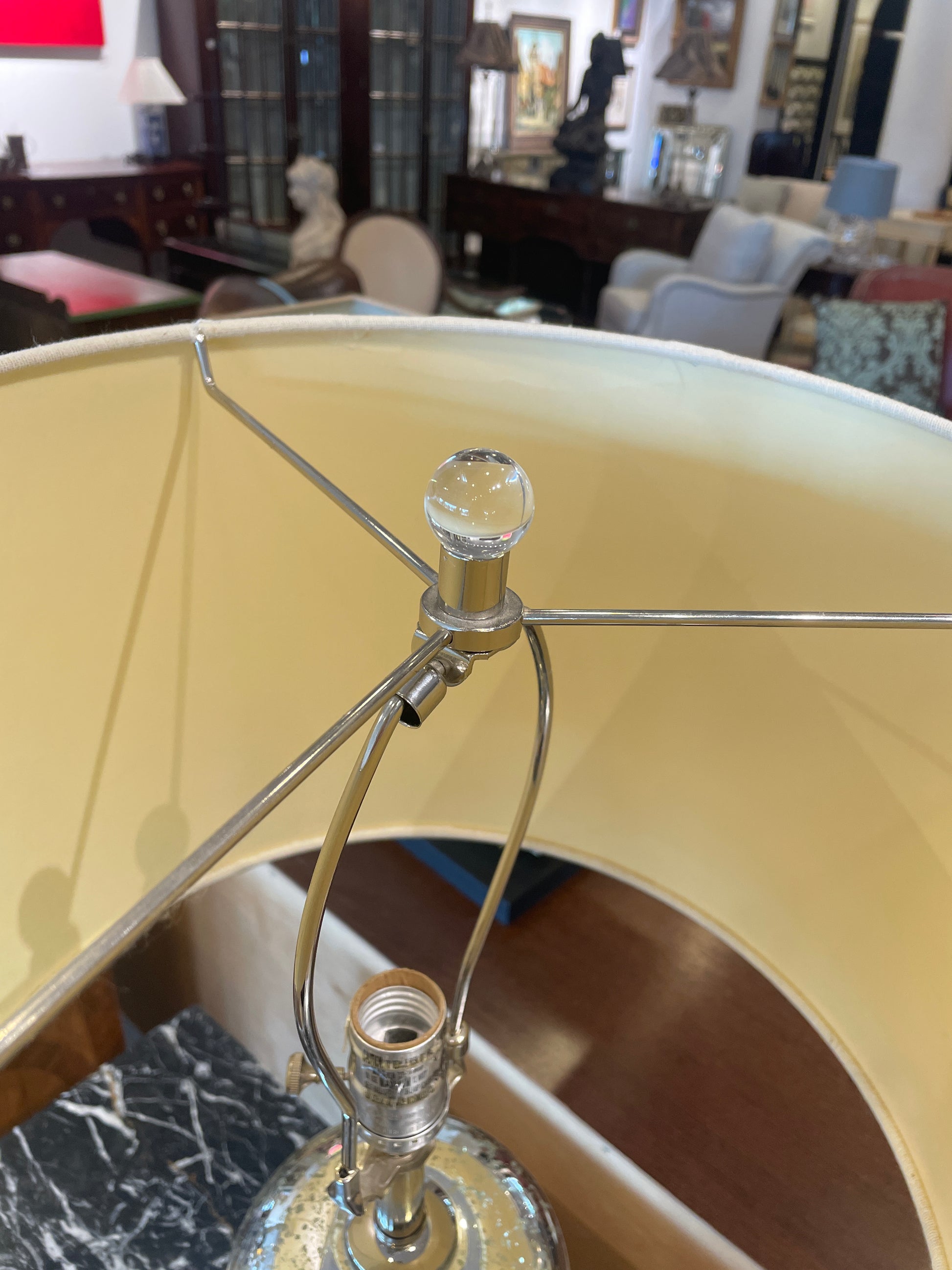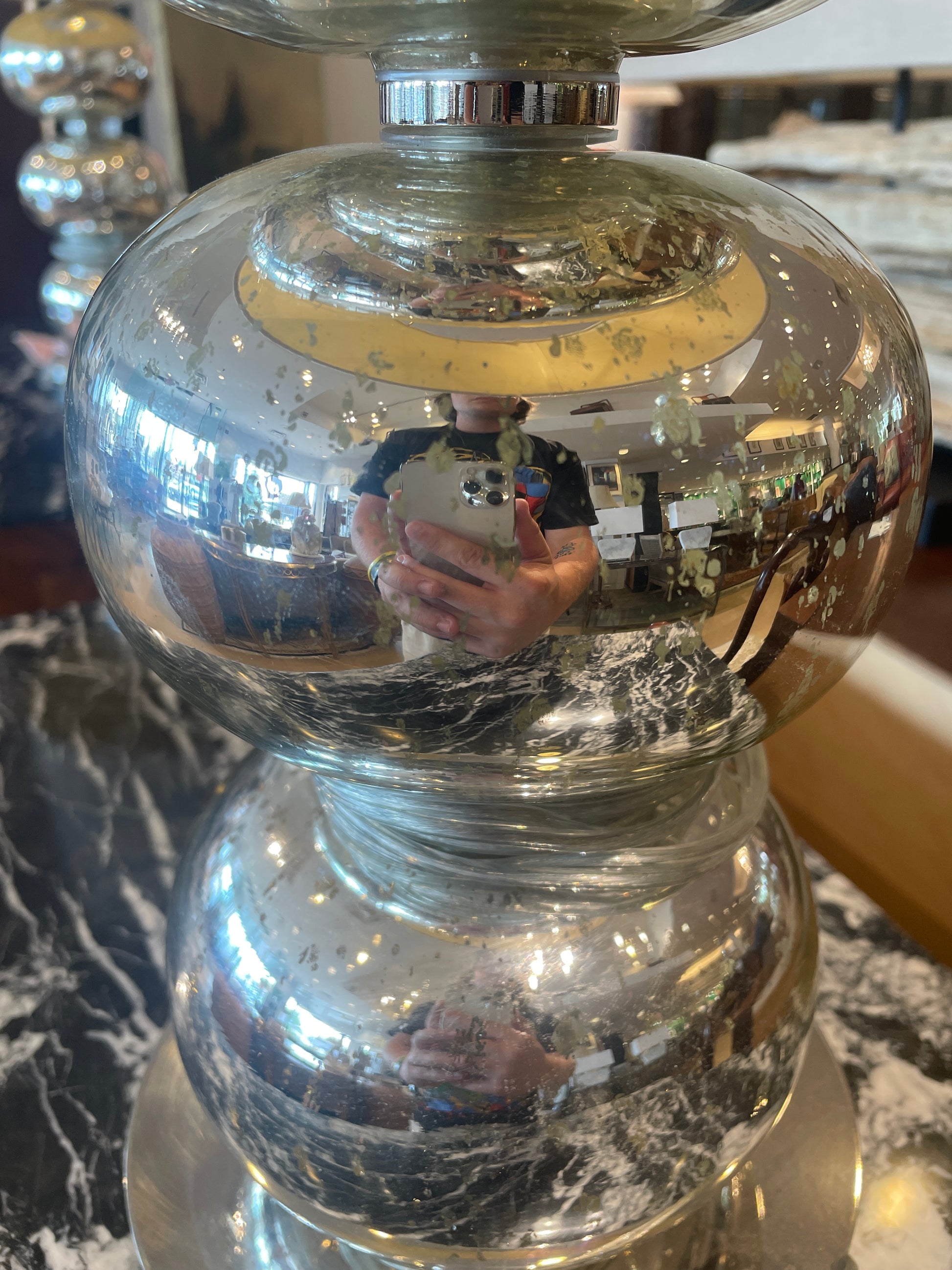 This stylish pair of mercury glass lamps features stacked, reflective orbs that create a bold yet elegant silhouette. The shimmering silver bases are paired with classic white drum shades, offering a sophisticated blend of vintage charm and modern appeal. Perfect for adding a touch of glamour and ambient light to any room.