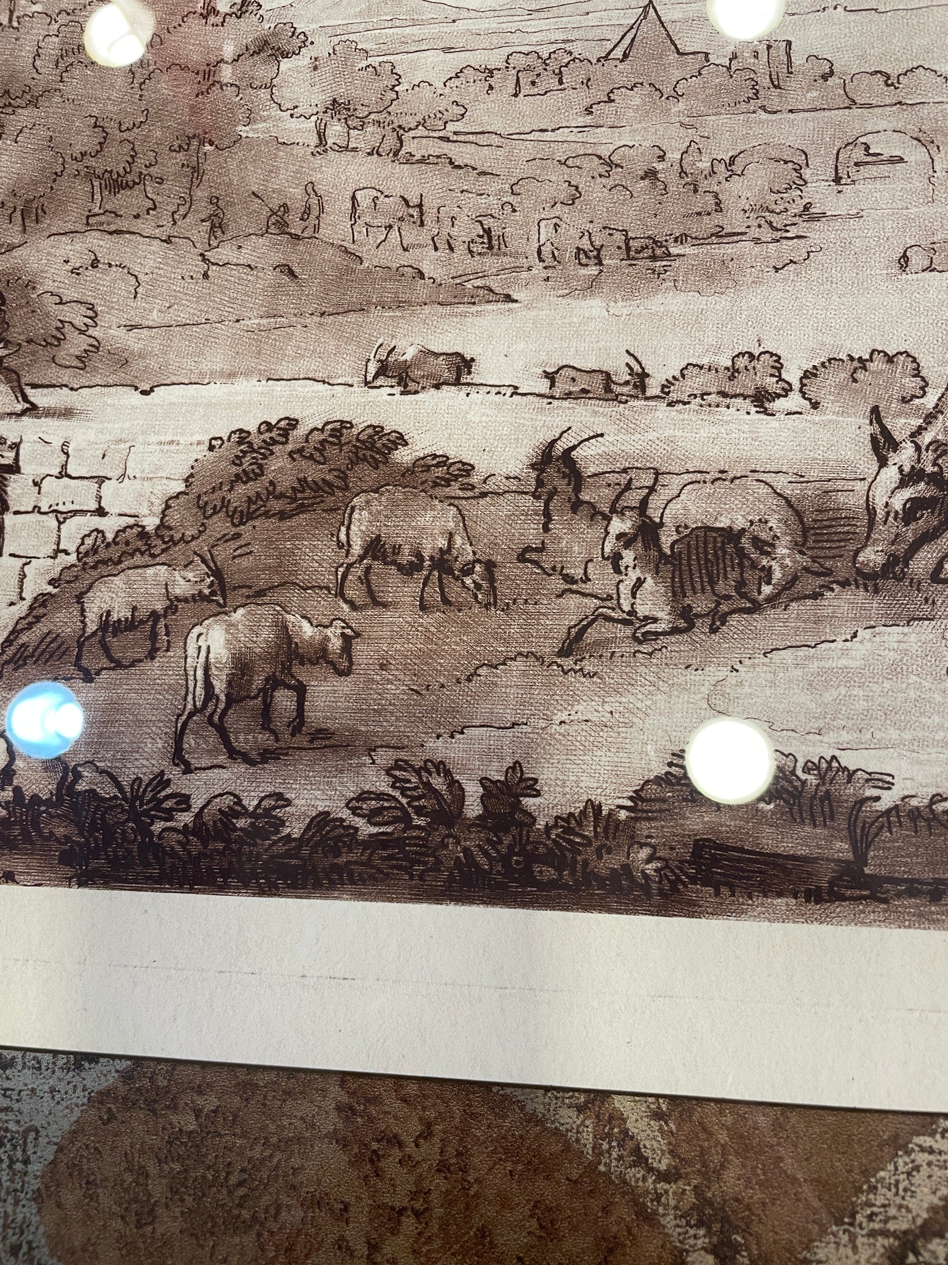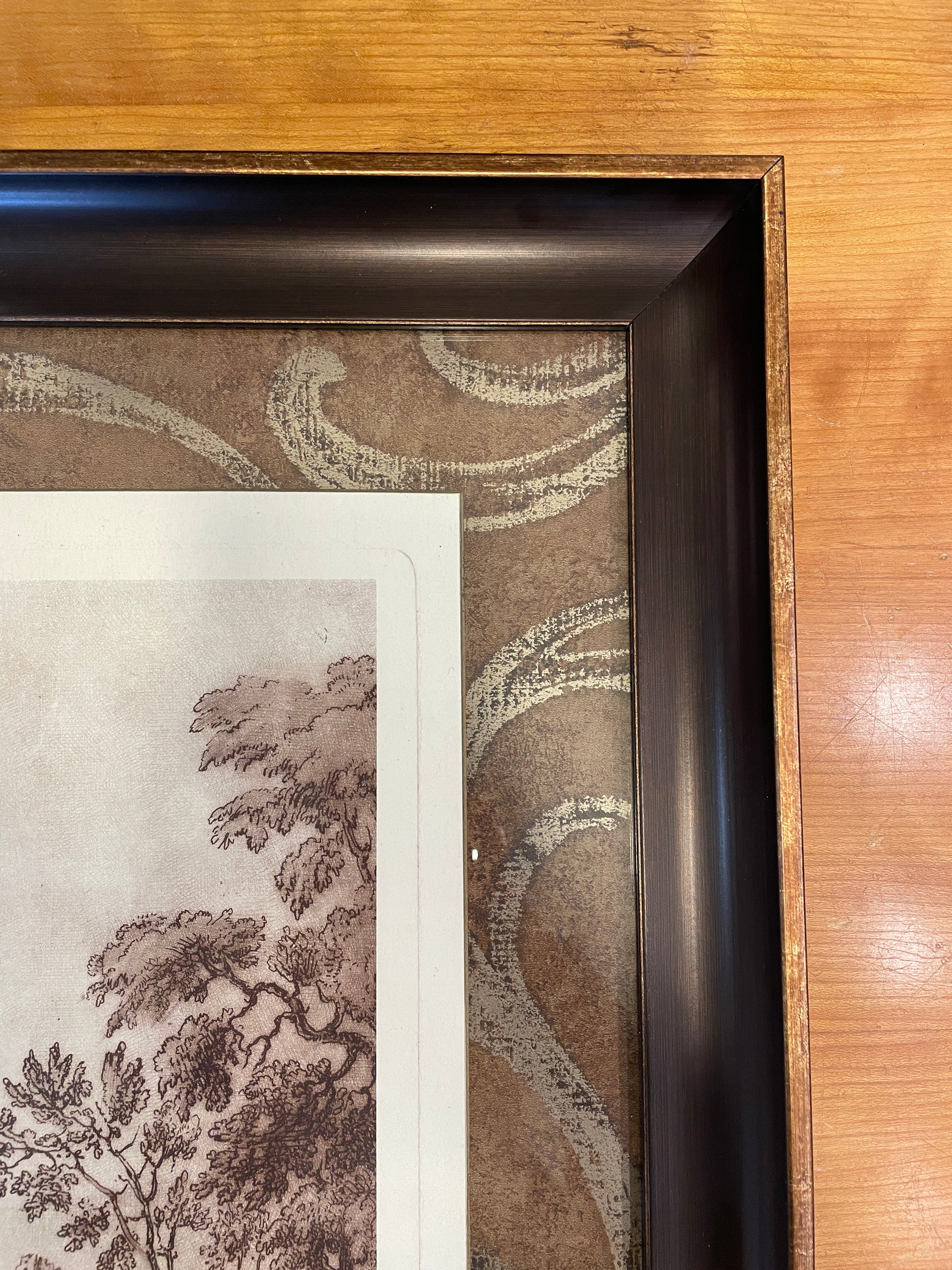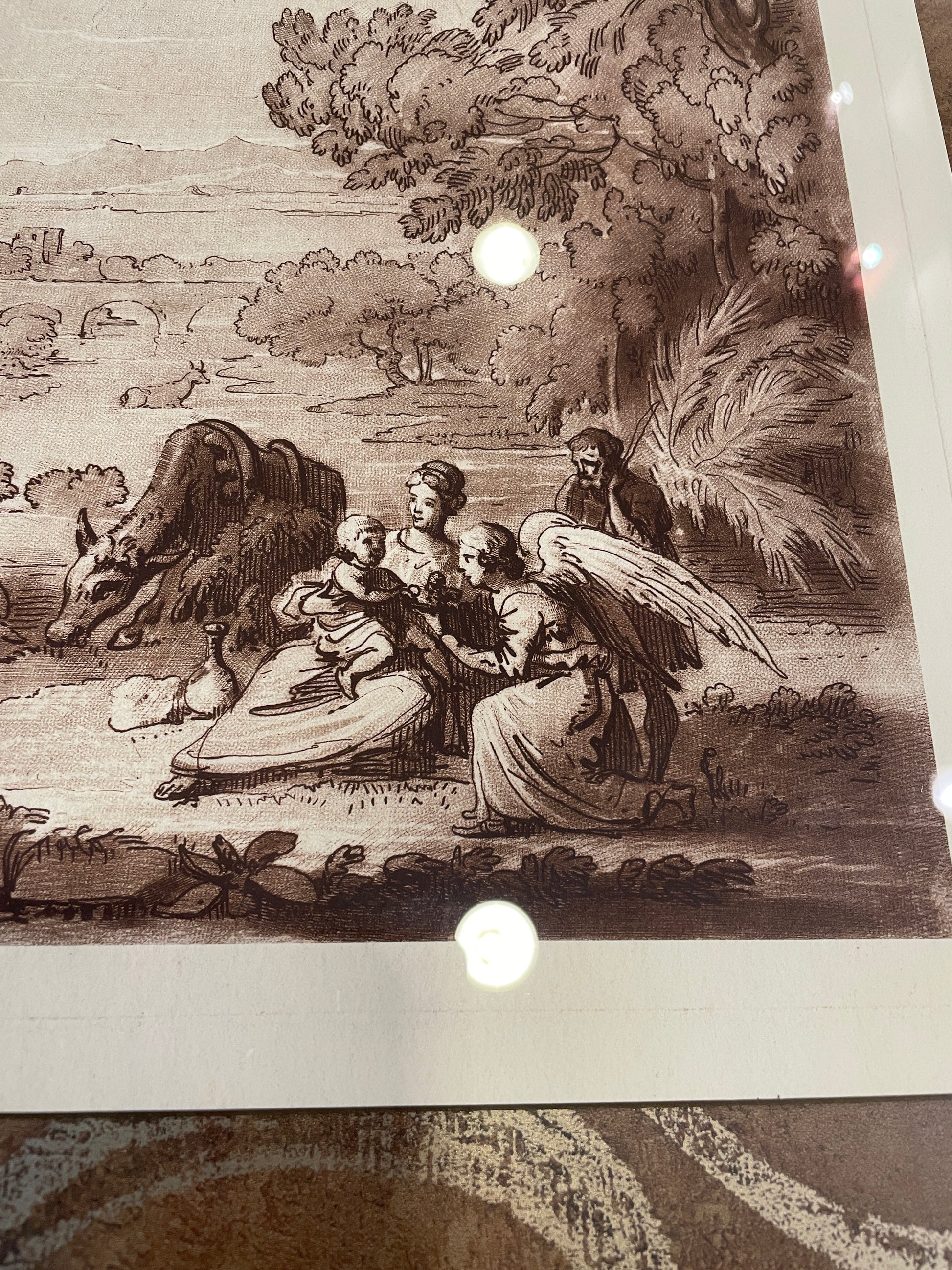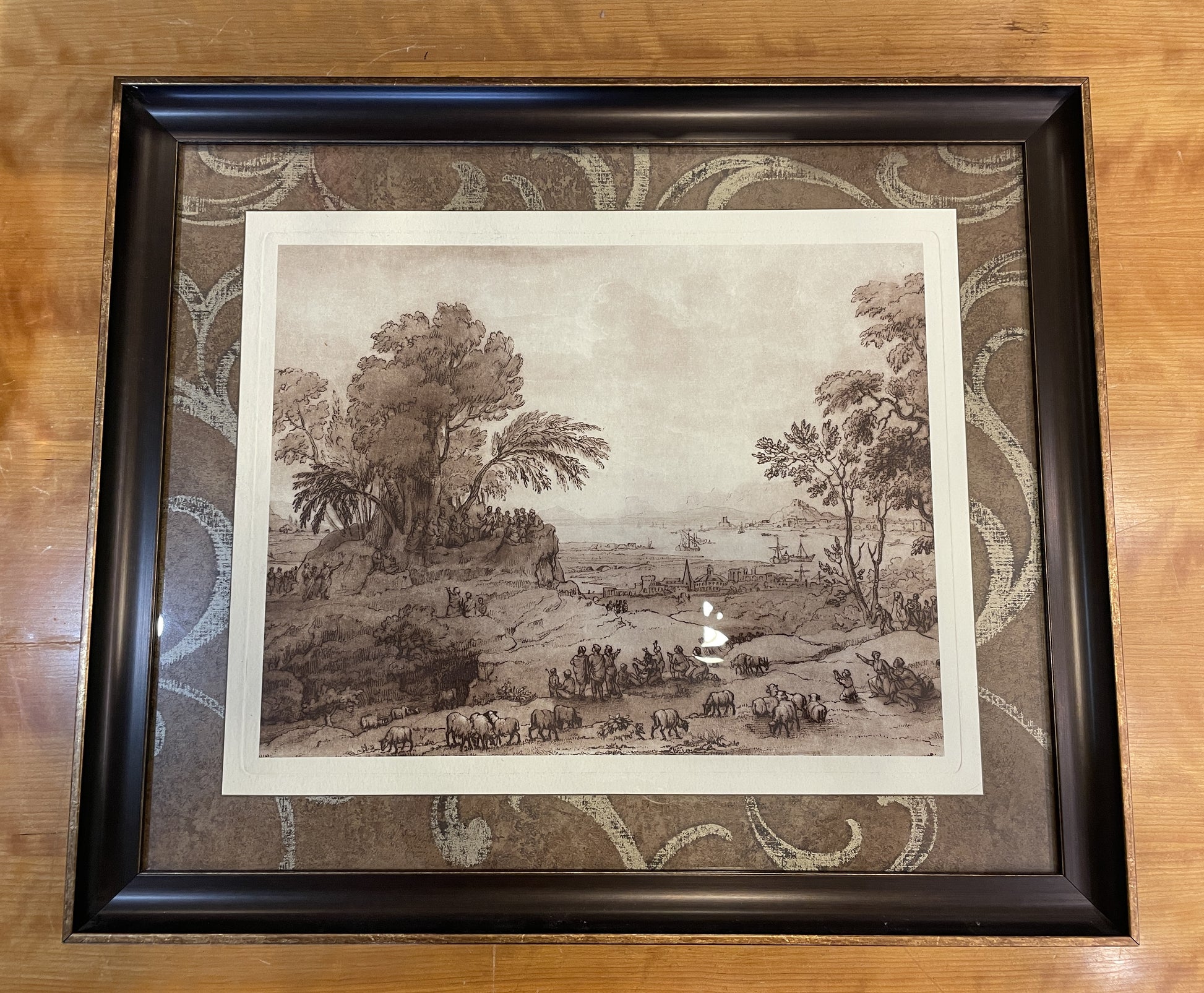 Paragon pastoral beauty, set of two. This beautiful pair of prints features calm scenes of the picturesque countryside. Angels and shepherds sit with their herds of sheep. Beautiful rolling hills and foliage lie in the background of these pieces. These pieces are done in black and white. The pieces are matted with a subtle design and held in a dark beveled frame. A perfect pair of prints with a peaceful and inviting feel.