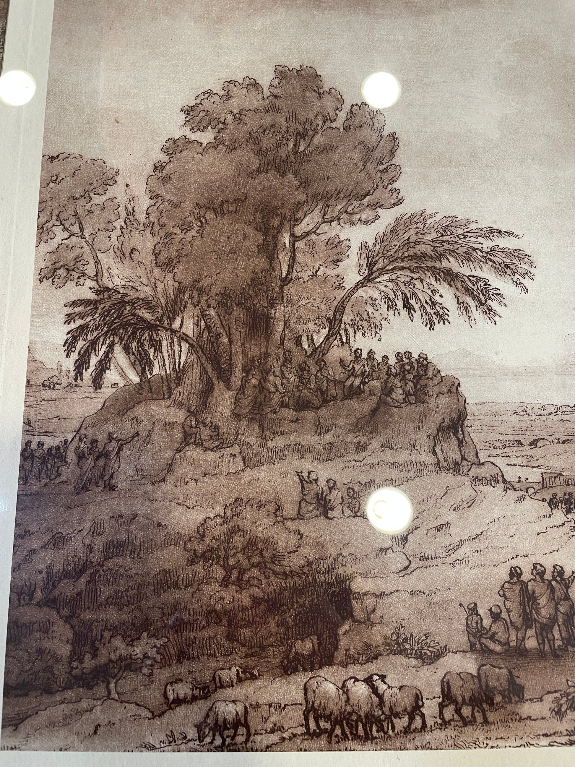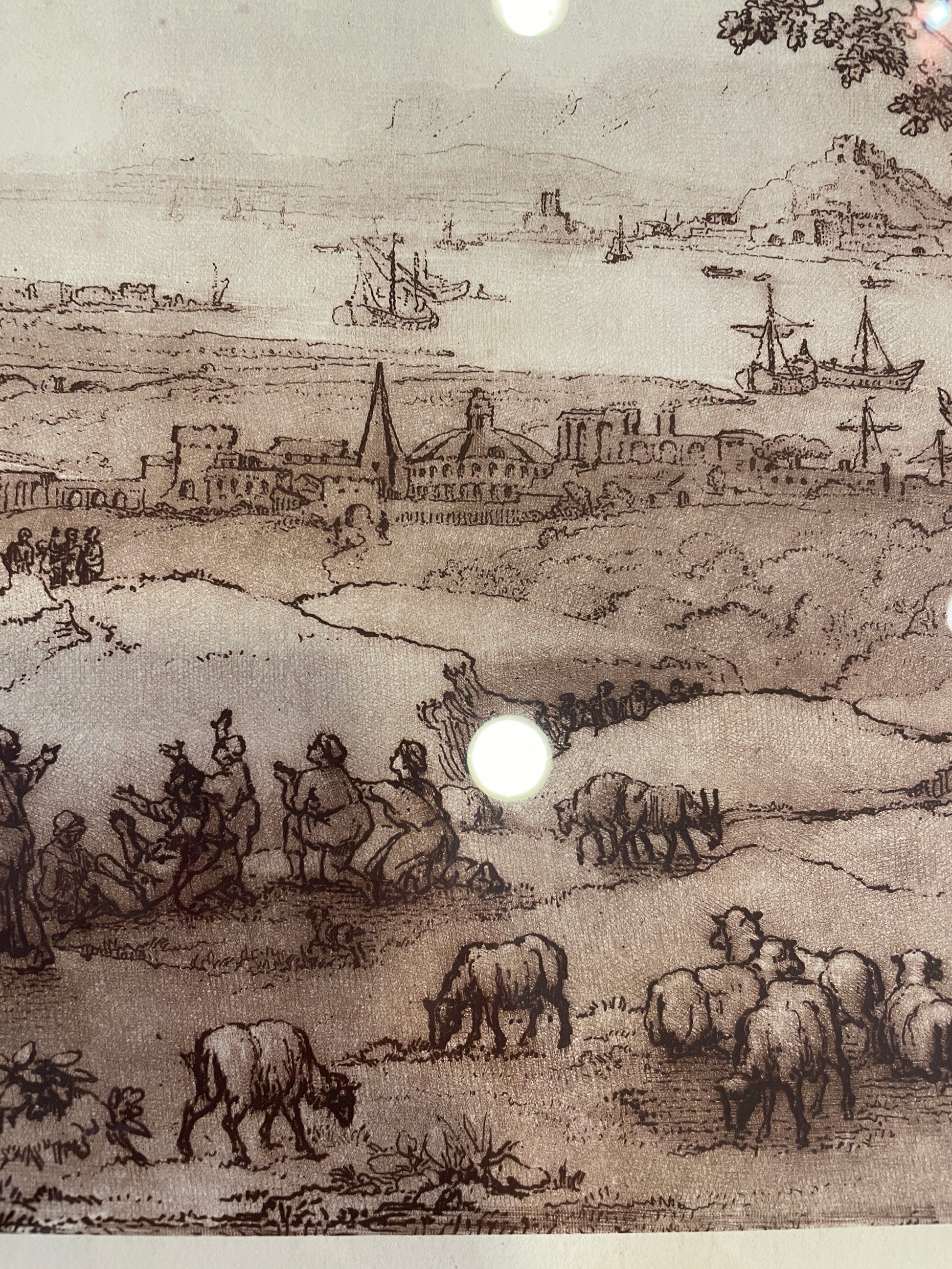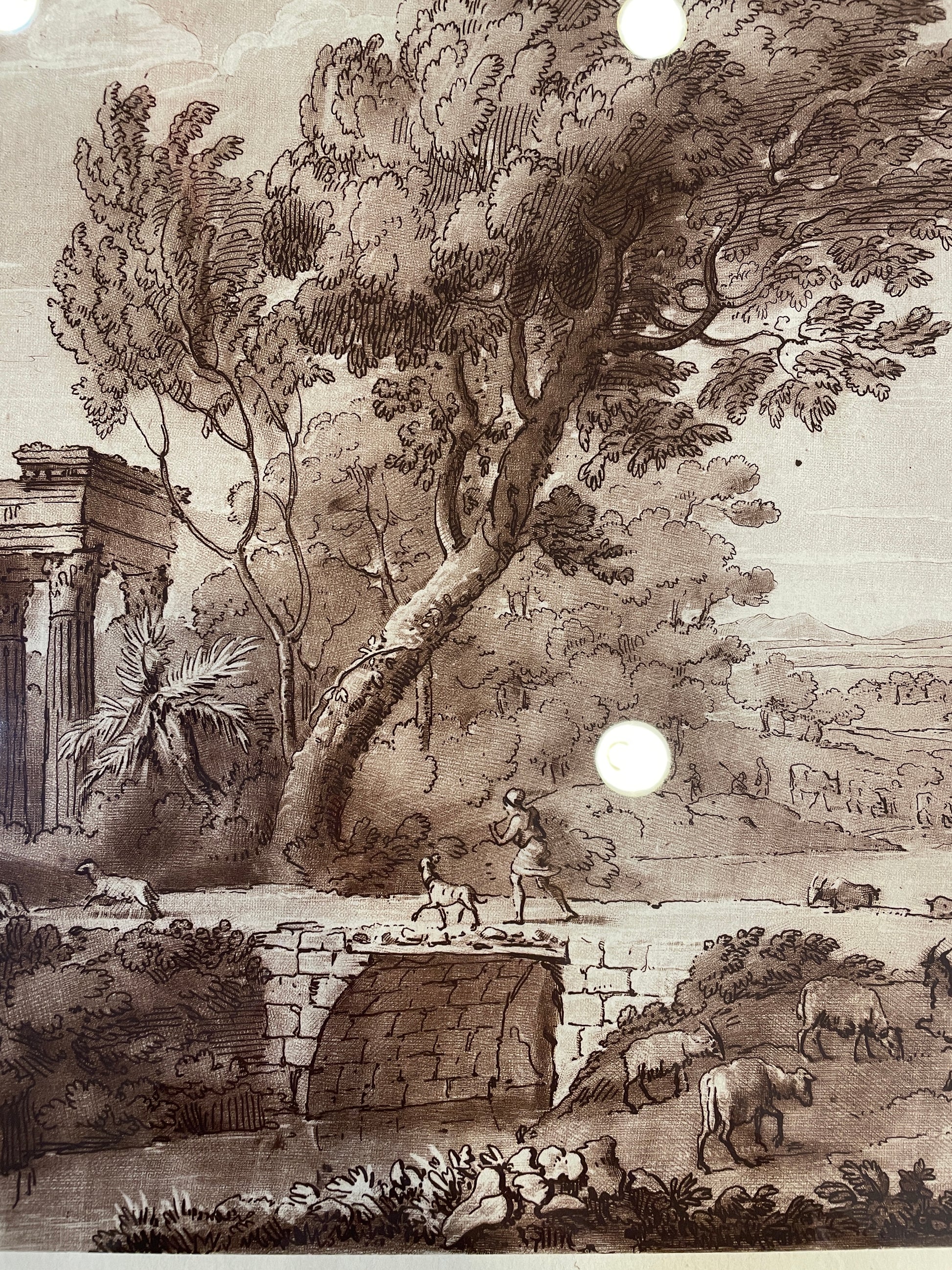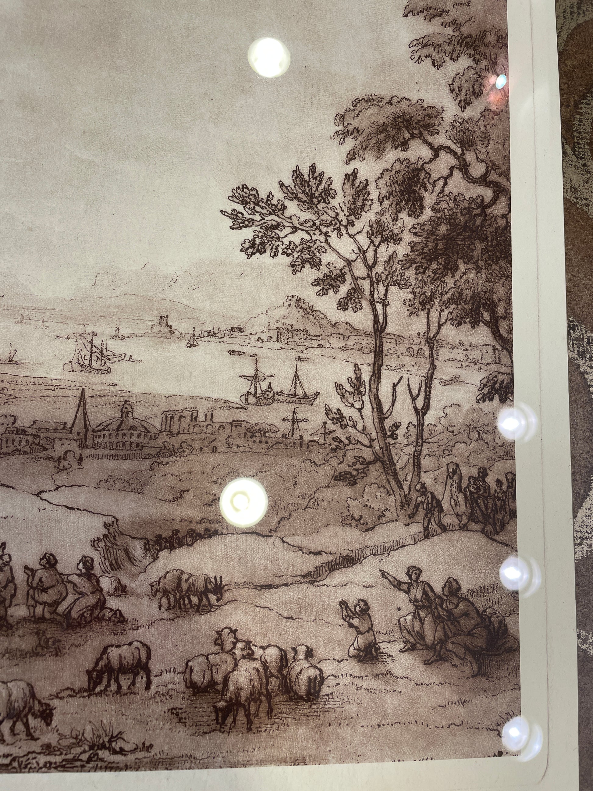 Paragon pastoral beauty, set of two. This beautiful pair of prints features calm scenes of the picturesque countryside. Angels and shepherds sit with their herds of sheep. Beautiful rolling hills and foliage lie in the background of these pieces. These pieces are done in black and white. The pieces are matted with a subtle design and held in a dark beveled frame. A perfect pair of prints with a peaceful and inviting feel.