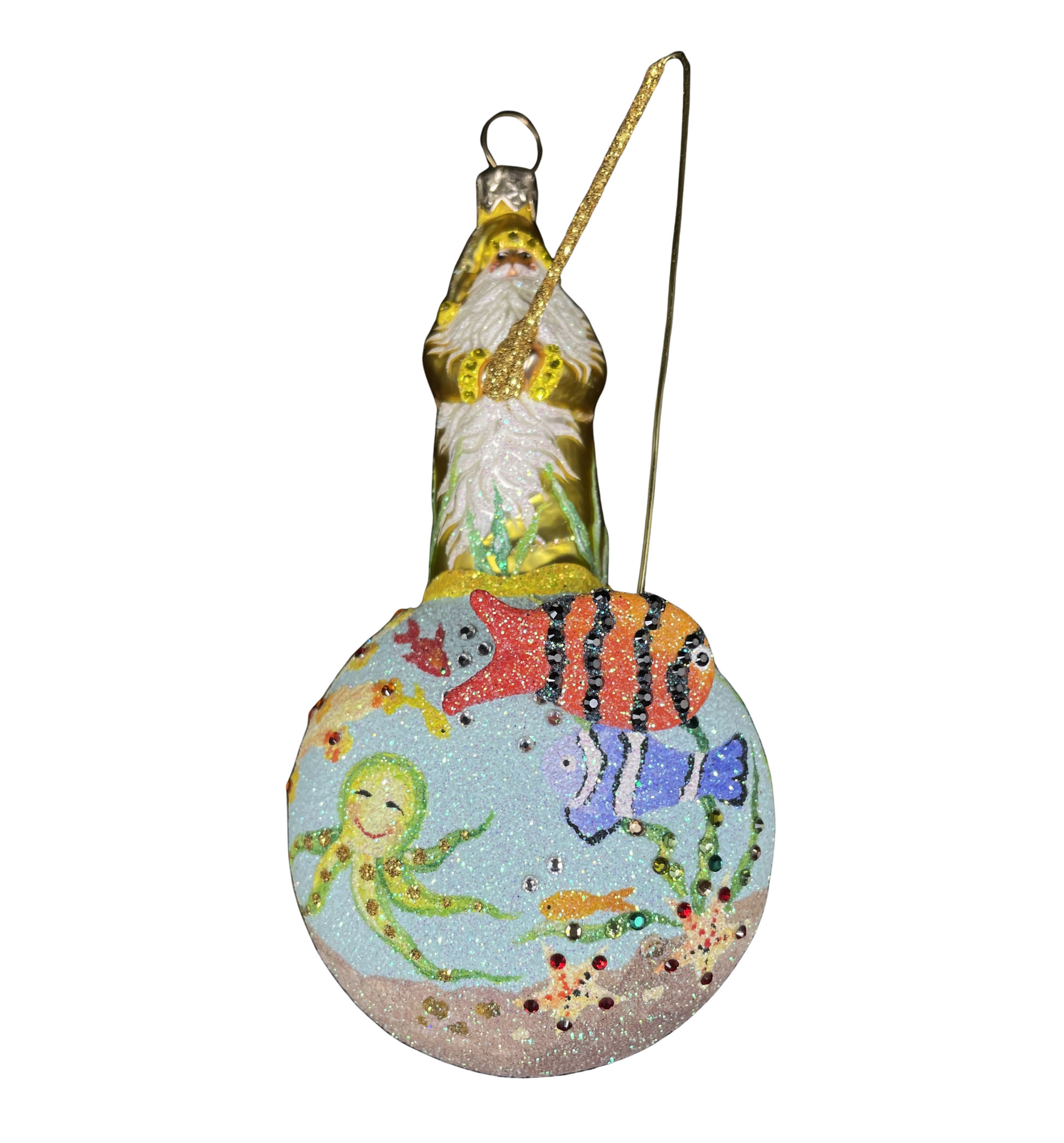 Patricia Breen casting for dreams ornament. This adorable hand-painted, hand-blown glass ornament features a Santa yellow robes standing atop an underwater scene. Santa is holding a fishing pole that has caught an orange fish with black bejeweled stripes. The underwater scene includes an octopus, a blue clownfish, a lobster, an orange fish, and a background with smaller fish, sand, starfish, coral, and seaweed. The scene is dusted with glitter and freckled with beautiful shimmering crystals. A playful ornament that is sure to add a whimsical charm to any tree.