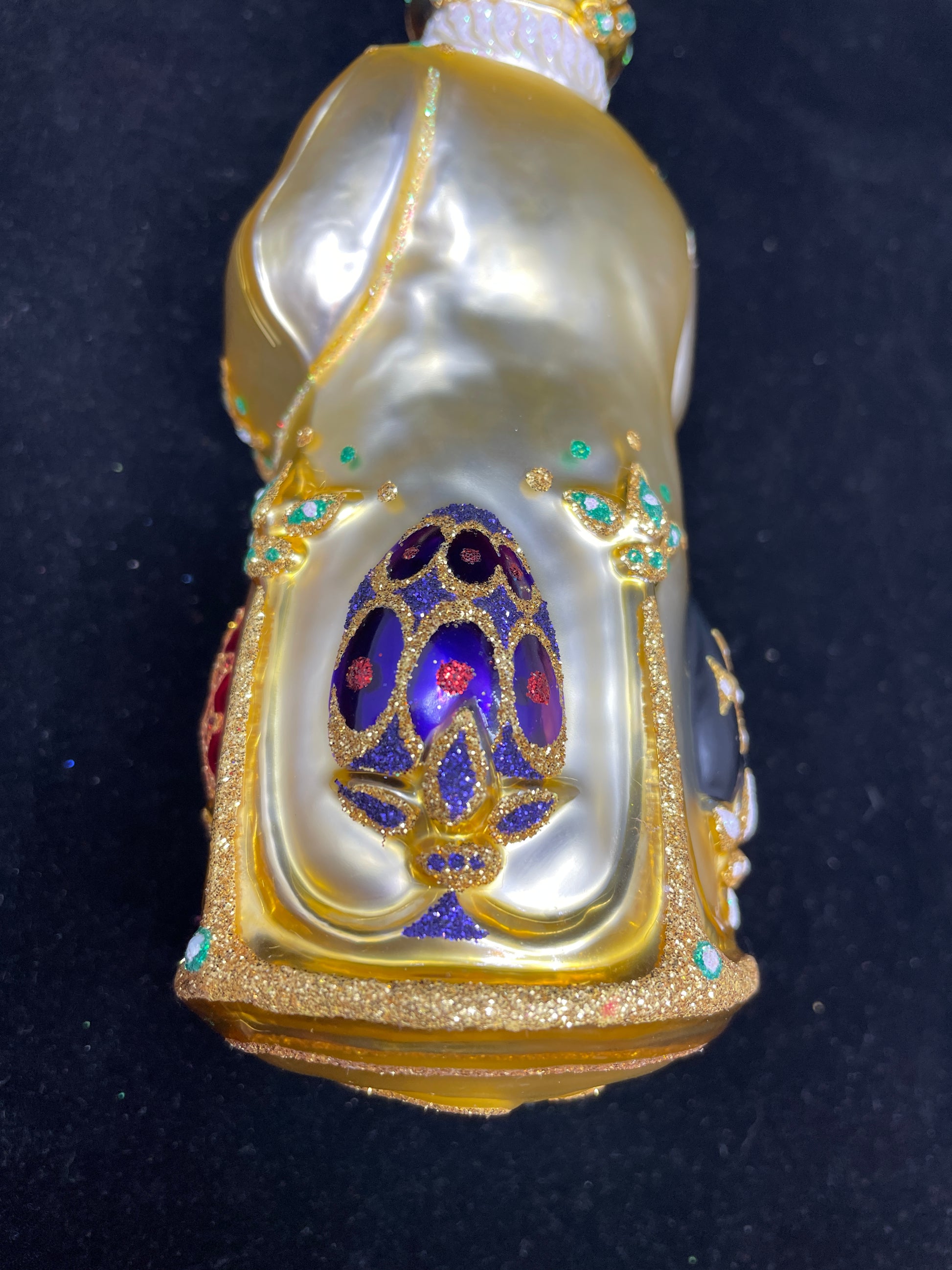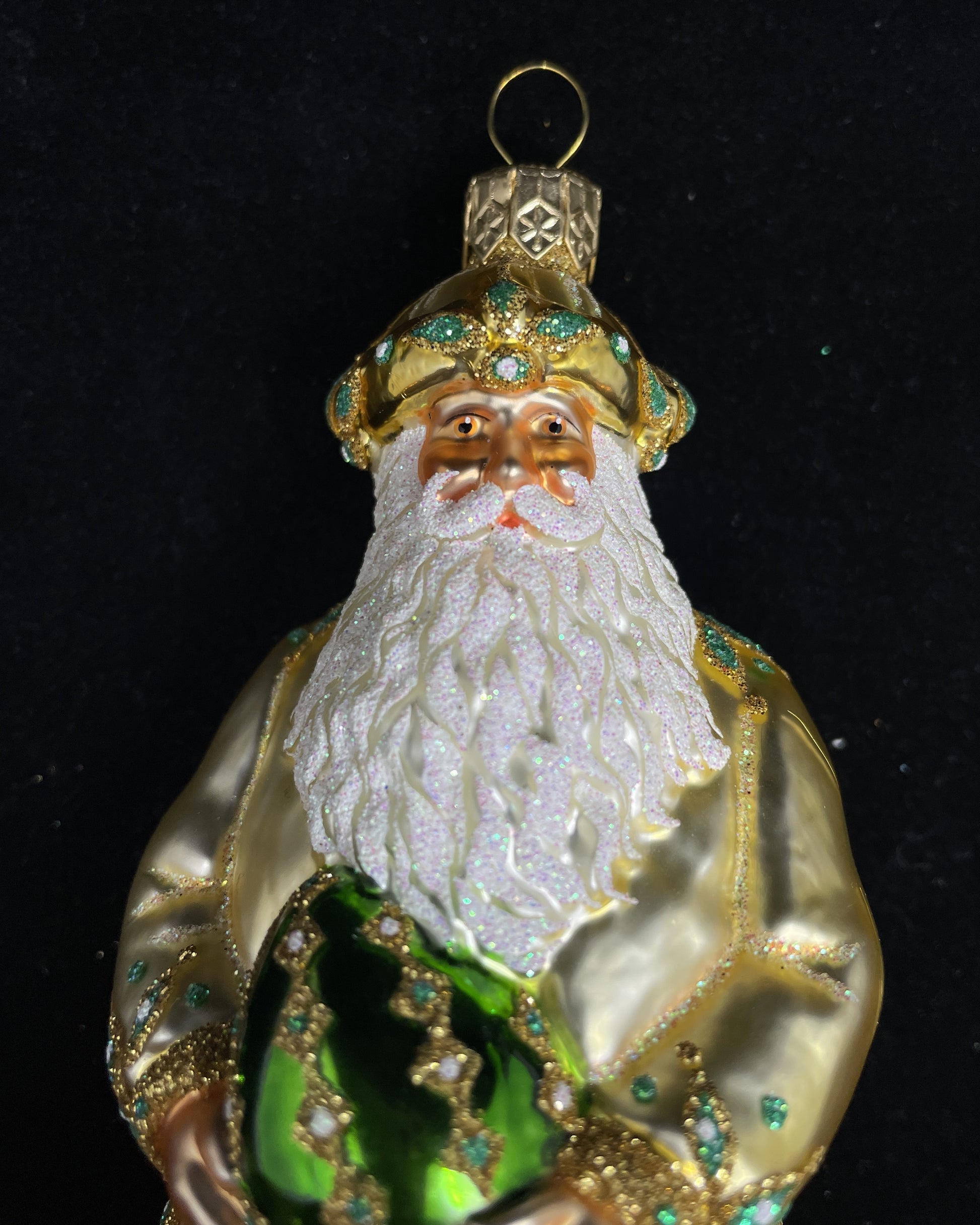 Patricia Breen imperial Santa ornament. This beautiful hand-painted, hand-blown glass ornament features a charming Santa in gorgeous imperial attire. His robes and hat are gold with blue bejeweled accents. The robe has four distinct panels on its bottom, each of which with a different Fabergé egg design. There is one red egg, one cobalt blue egg, one royal purple egg, one black egg, and Santa is holding one more egg in green. The entire ornament is further accented with beautiful sparkles throughout. An ornament with a regal feel that is sure to elevate any tree.