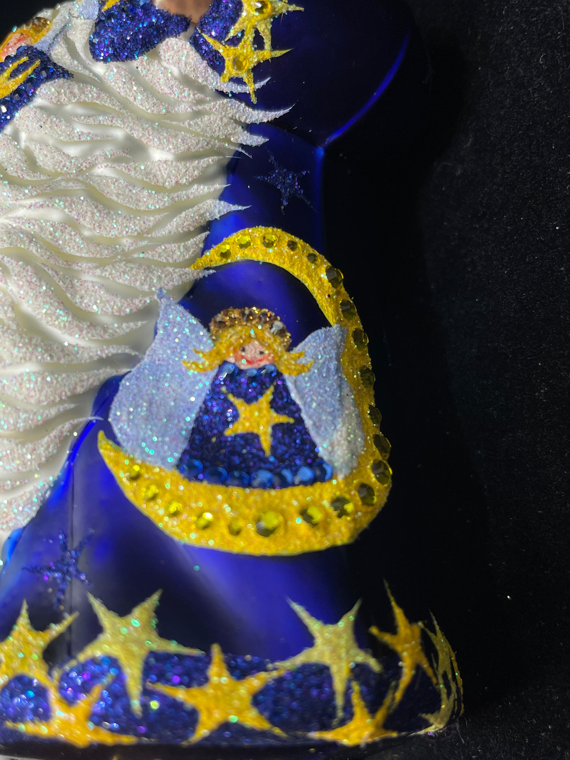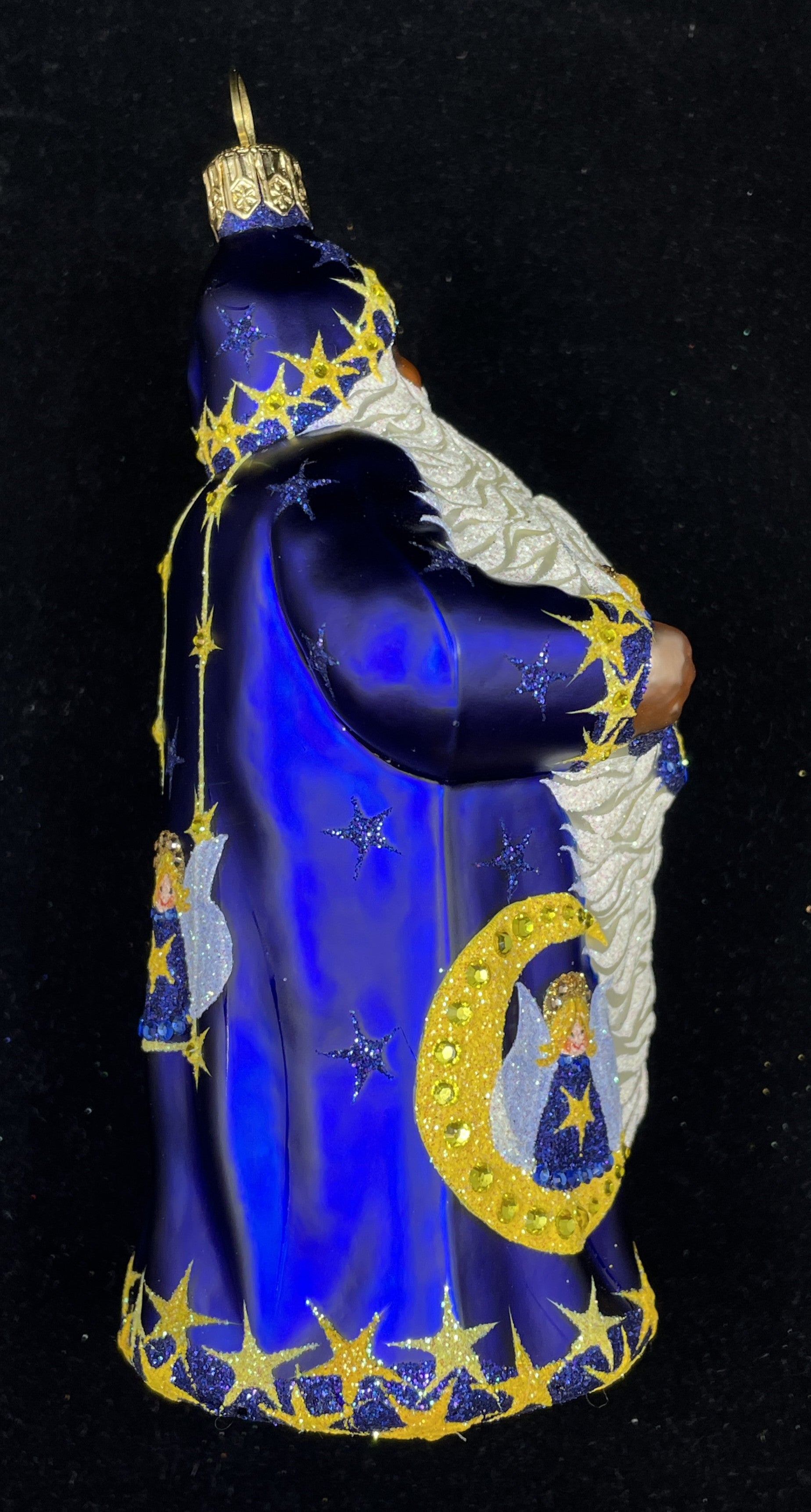 Patricia Breen moons and angels Santa ornament. This beautiful hand-painted, hand-blown glass ornament features a Santa in blue robes holding a string of Angels. He has an especially long sparkly beard that creates a background for the four angels with alternating yellow moon and star designs on their blue outfits. The Santa also wears a blue robe with moon and star motifs. The crescent moon on either side of his robe houses another angel. The back of the robe displays an angel on a swing with stars on the ropes. A beautiful ornament that's sure to add a heavenly charm to any tree.