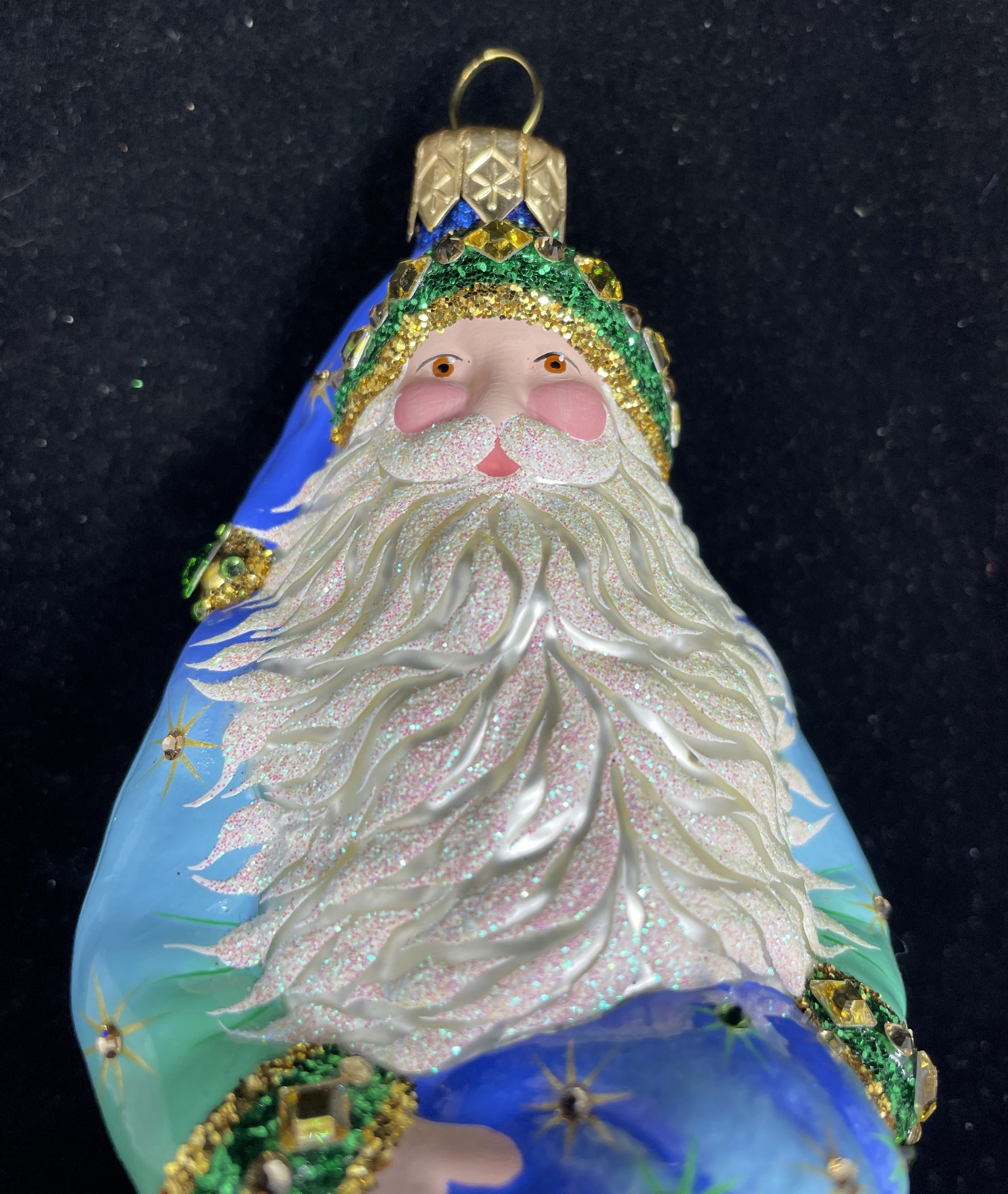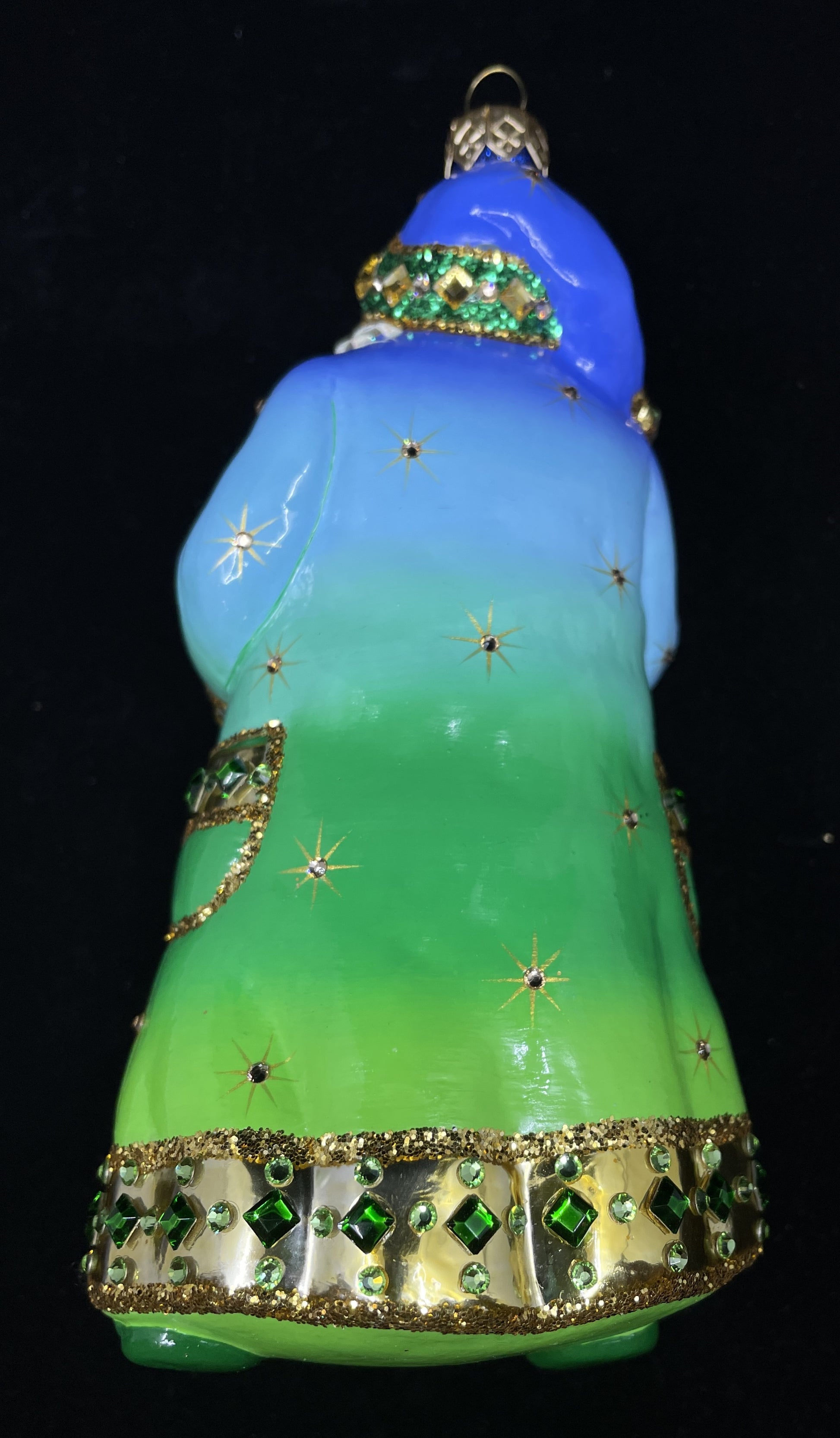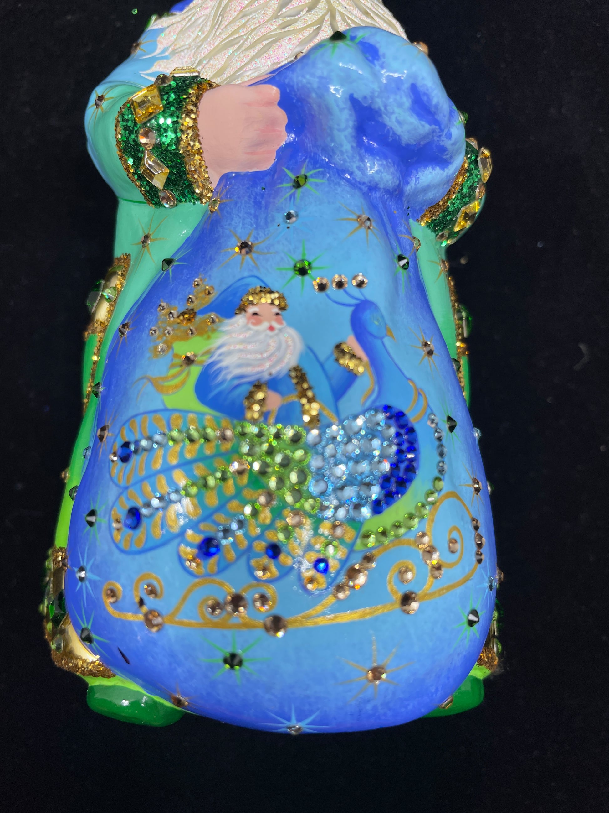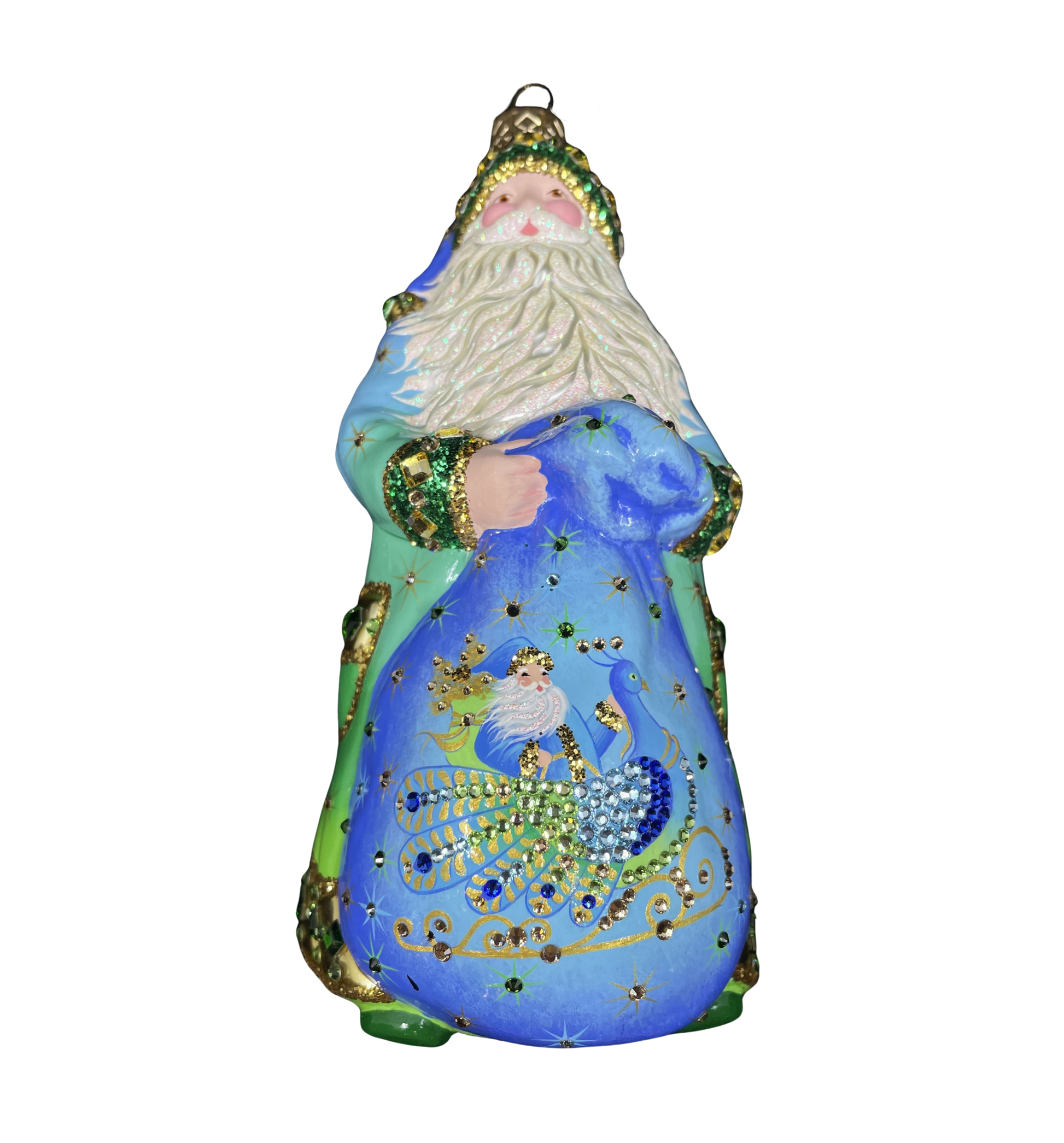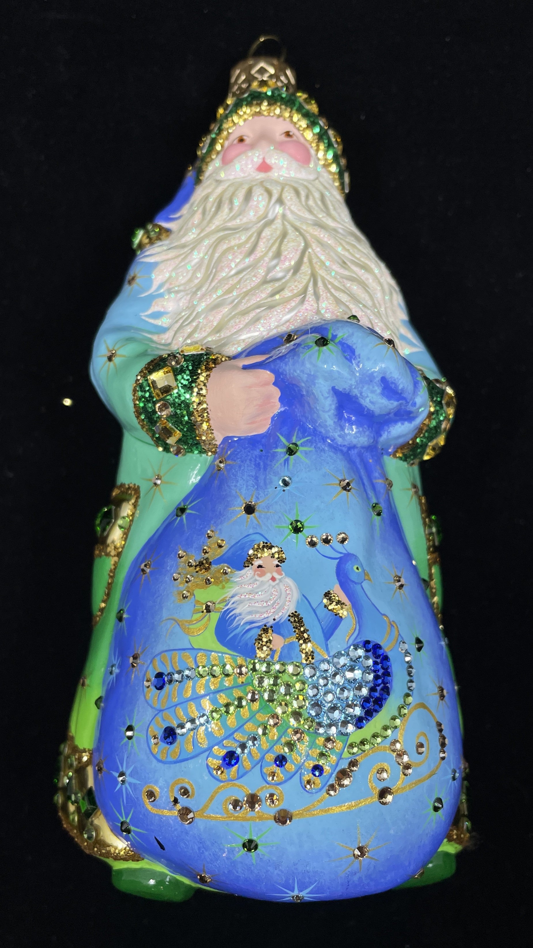 Patricia Breen night of giving peacock ornament. This beautiful hand-painted, hand-blown glass ornament is full of vibrant cool colors. The ornament depicts a Santa holding his sack, but rather than his traditional Christmas colors, this Santa is wearing a peacock themed outfit. His robe features a gradient of blues and greens with a gold trim on the bottom with bejeweled accents. The sides of the robe include pockets with a design that matches the lower trim. He is holding a bright blue bag with a painted Santa riding a beautiful peacock themed sleigh. The ornament is accented with glitter details and beautiful crystals dappled throughout. A bright and colorful ornament that is sure to elevate any tree.
