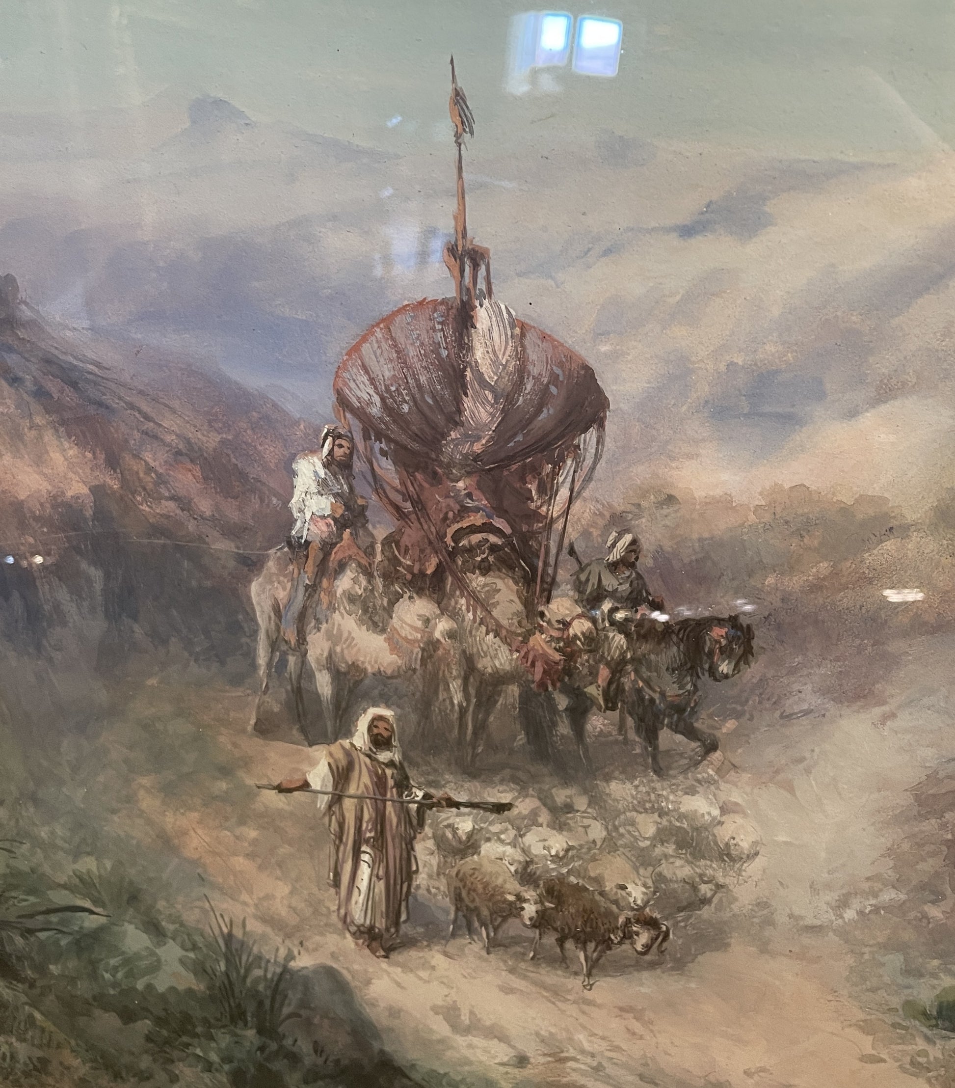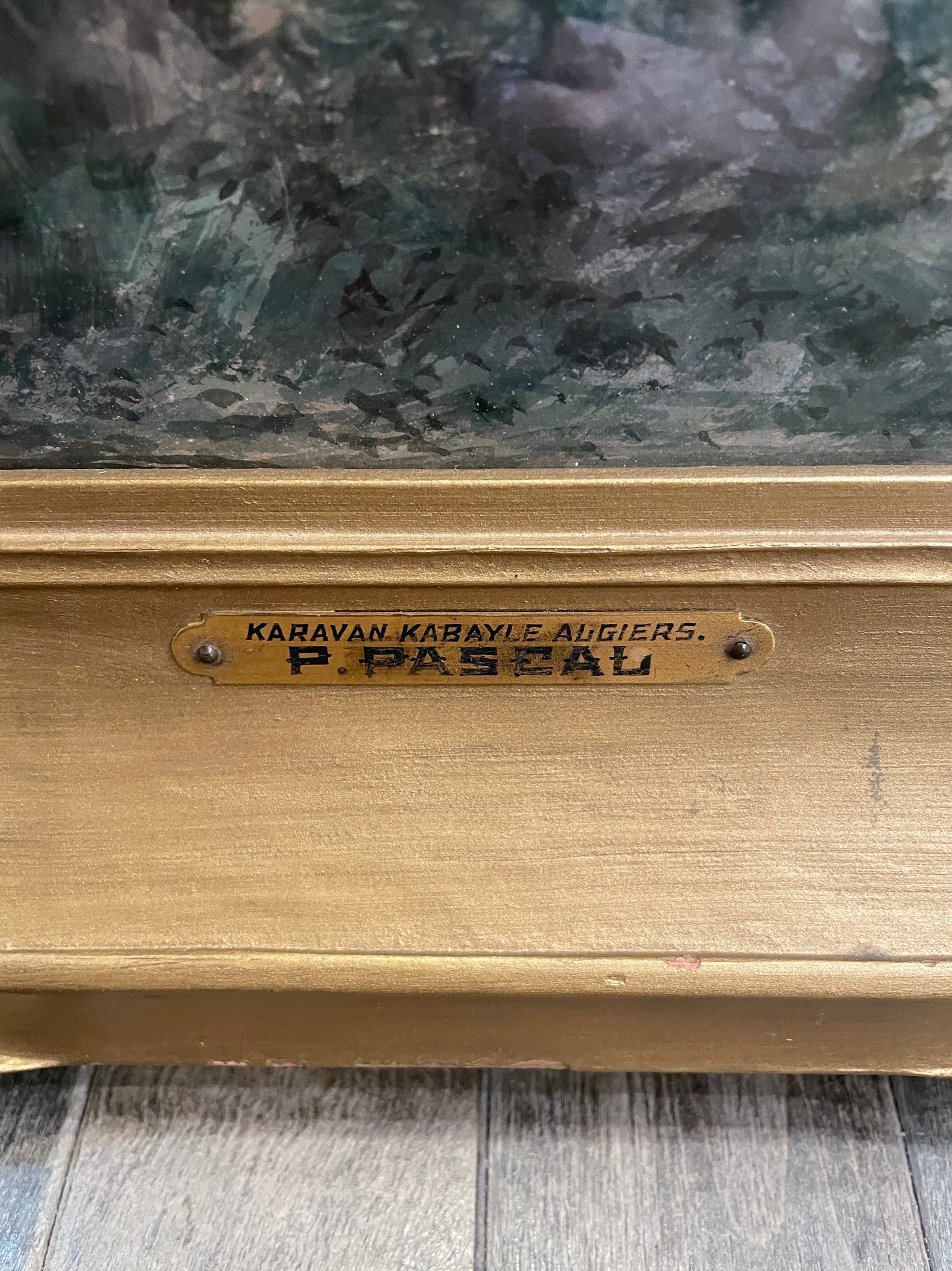 Paul Pascal "Karavan" gouache. Signed lower right. French (1905-1939). This large piece depicts a caravan with a horse, camels, and sheep. The group is traveling along a dirt path on a clear day. The piece is held in a simple gold finished frame with scrolled accents and a placard displaying the title "Karavan Kabayle Augiers, P. Pascal". A striking gouache piece perfect to brighten up a space.