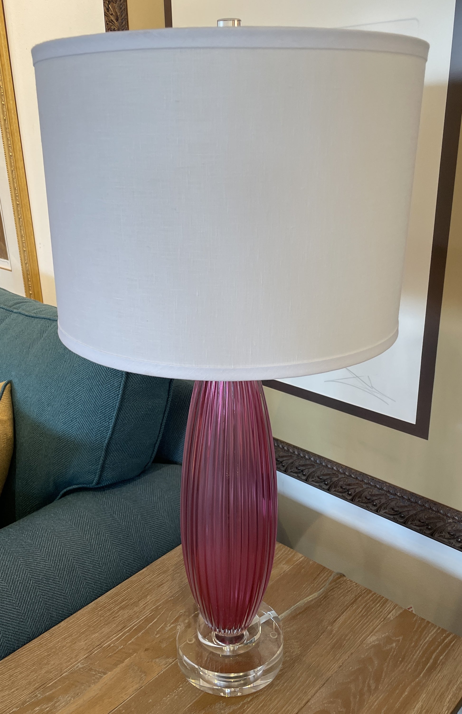 Two pink ribbed glass table lamps with acrylic base and white shade. This adorable set of two table lamps really light up a room. The circular acrylic stands support a hollow, pink, ribbed glass base. The round, white shades atop the lamp are sleek and cylindrical. With their bright color, and charming shape, these lovely lamps are a great contemporary style piece for a room.