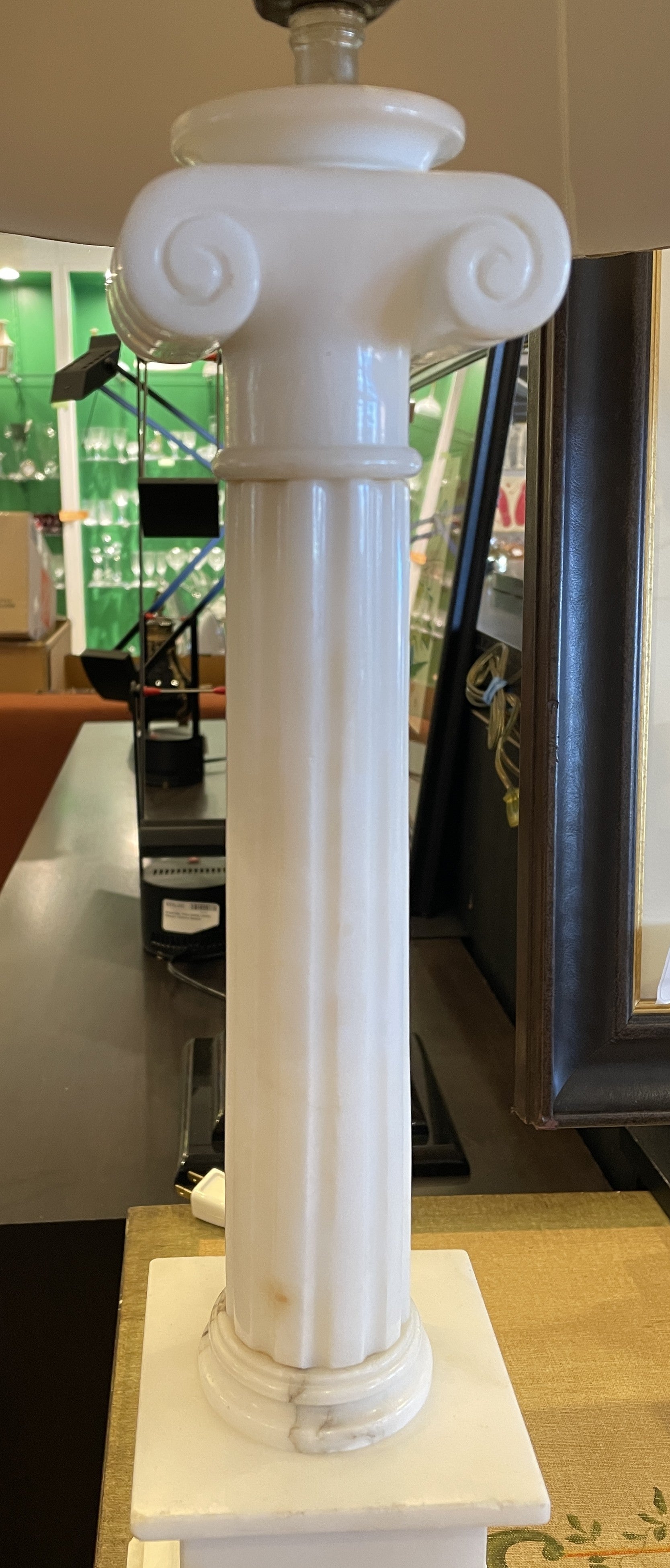 Elegant pair of alabaster column lamps. Each lamp sits on a square base that leads up to a beautiful ionic column. The base of the lamps is alabaster, with subtle gray details peeking through on the otherwise white material. The bases hold up empire shaped pleated shades in a beige color. To top off each lamp, a small spherical finial peeks out from the top of the shade. A beautiful and charming set of lamps that is sure to light up a room.