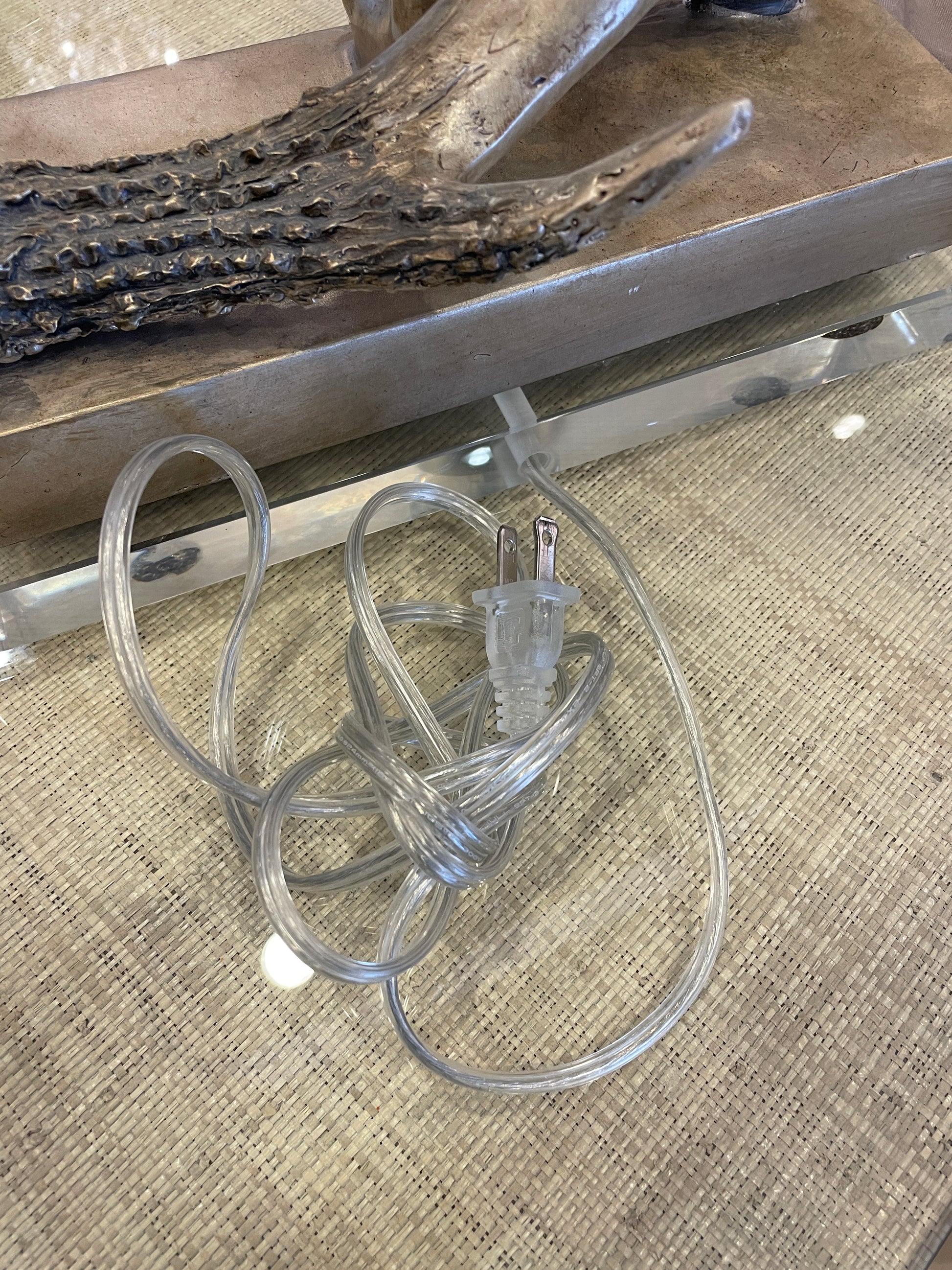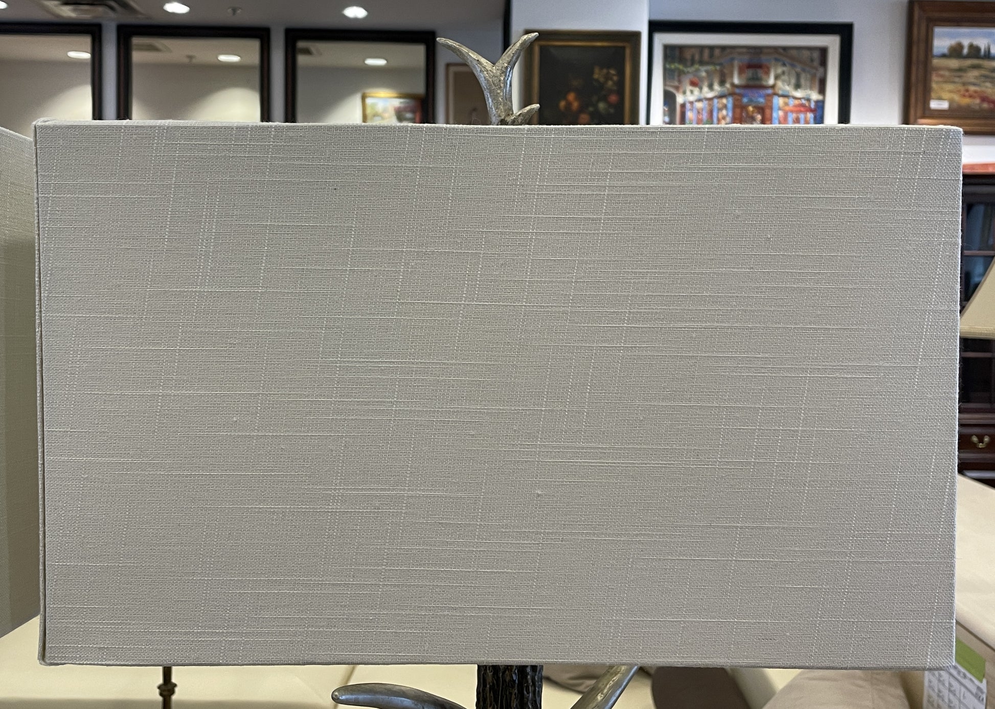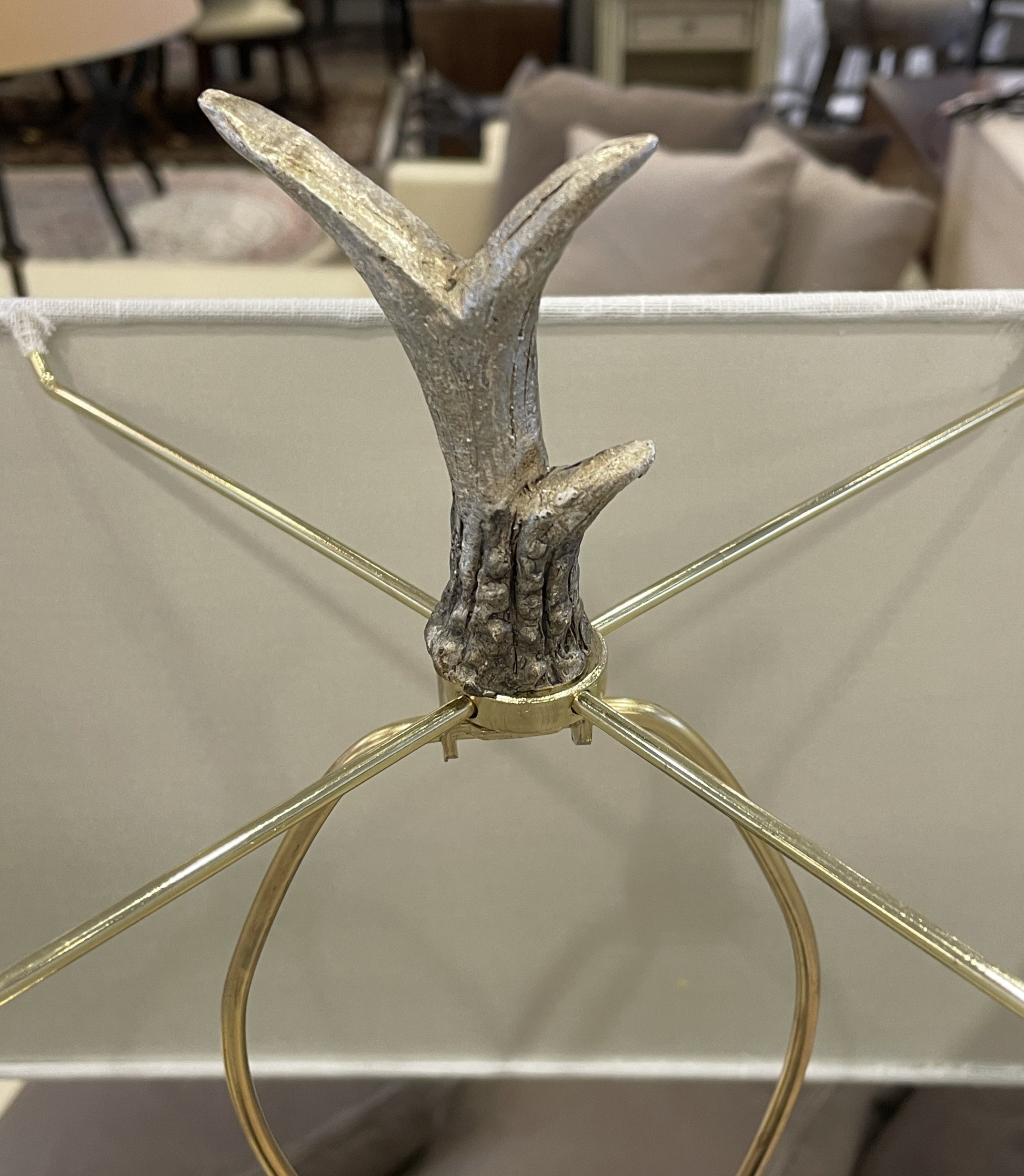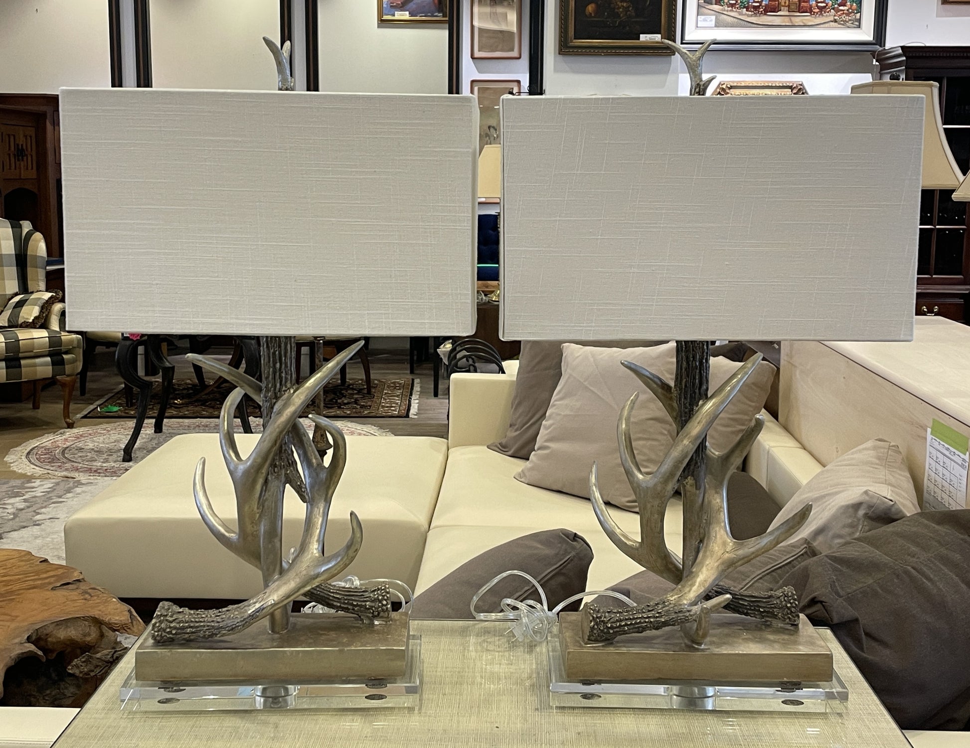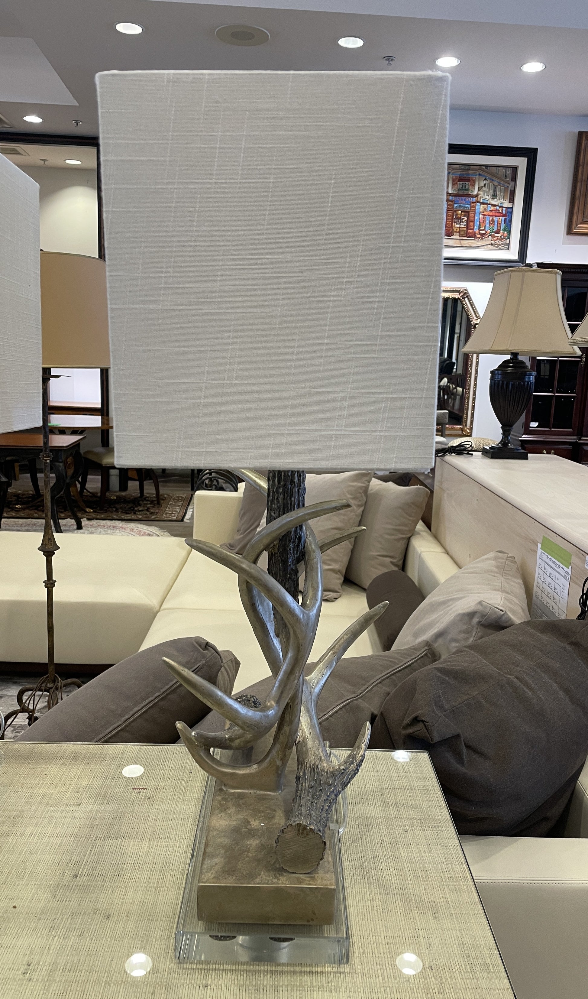 Two unbranded table lamps featuring a thick glass base followed by two silvered antlers that twist around each other. The shade is a modern, white rectangle. The top is accented my a small, antler shaped finial.