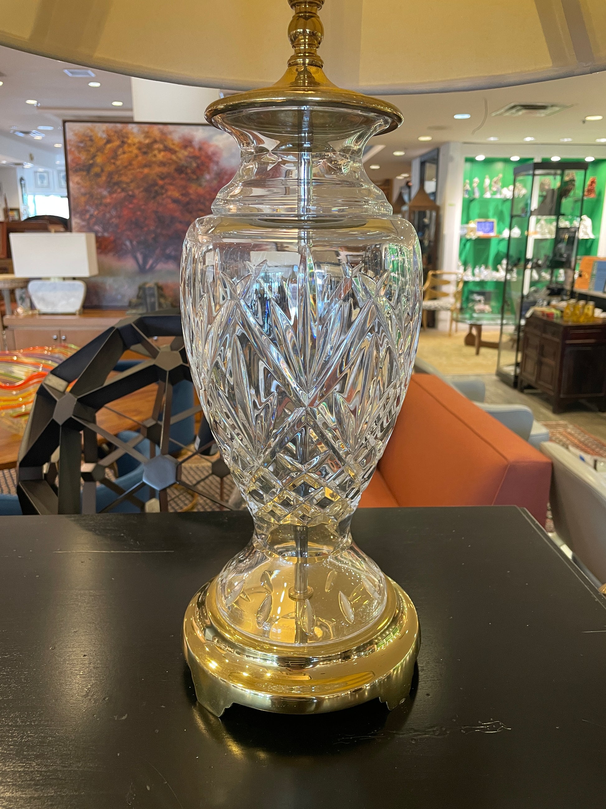 Waterford lamps with custom shades, a pair. These luxurious lamps have cut crystal bases that sit on a subtle gold stand with four feet. The intricately cut design on clear glass refracts light beautifully. The shades of these lamps are custom made. They are a light cream color, and have pleated sections equally spaced around the perimeter. The shades are in a classic empire shape with a wide bottom and narrow top, and peeking just out from above the shade you can see the gold, ball-shaped finial. A stunning set of lamps that's sure to add class and elegance to any space.