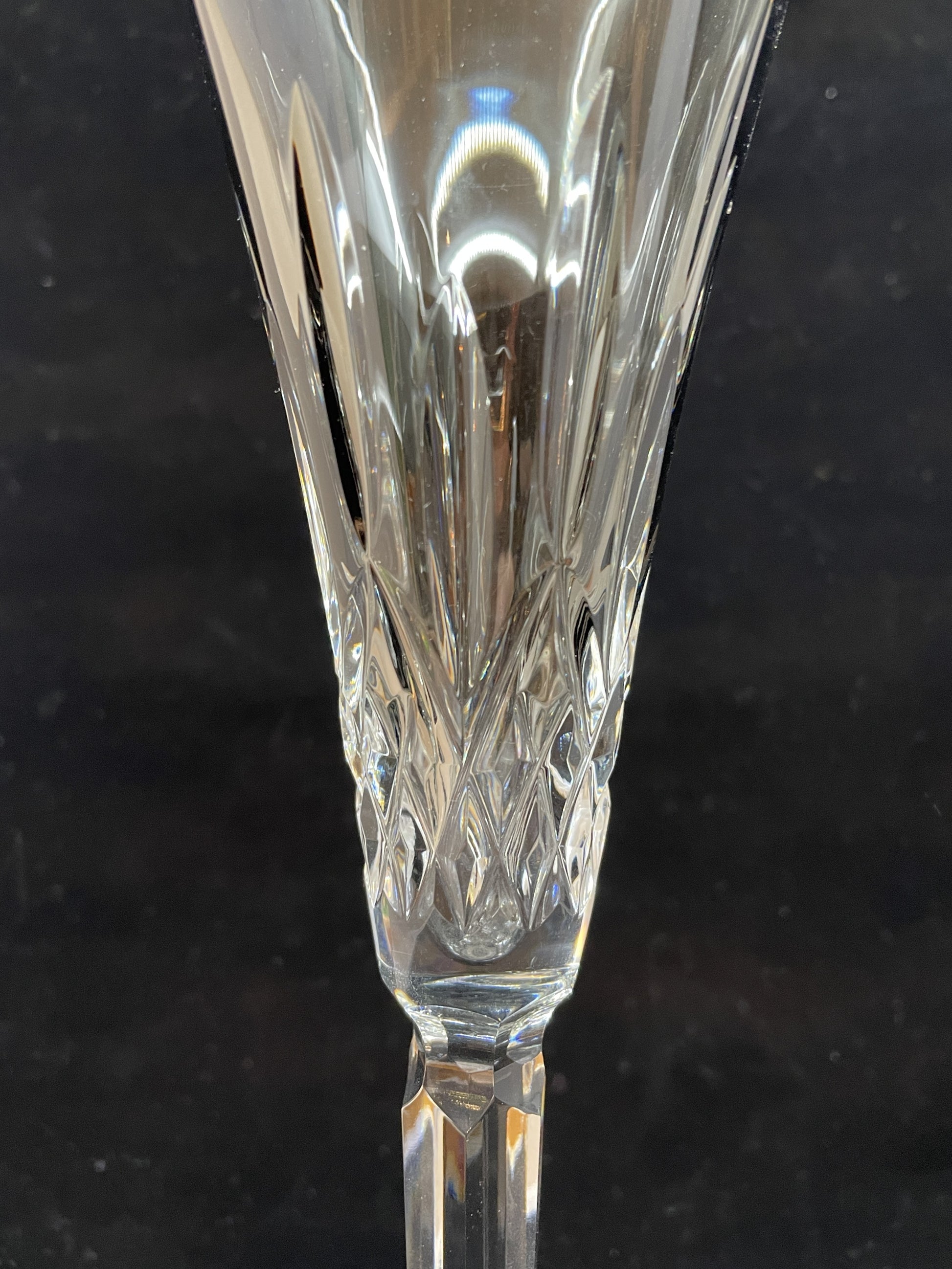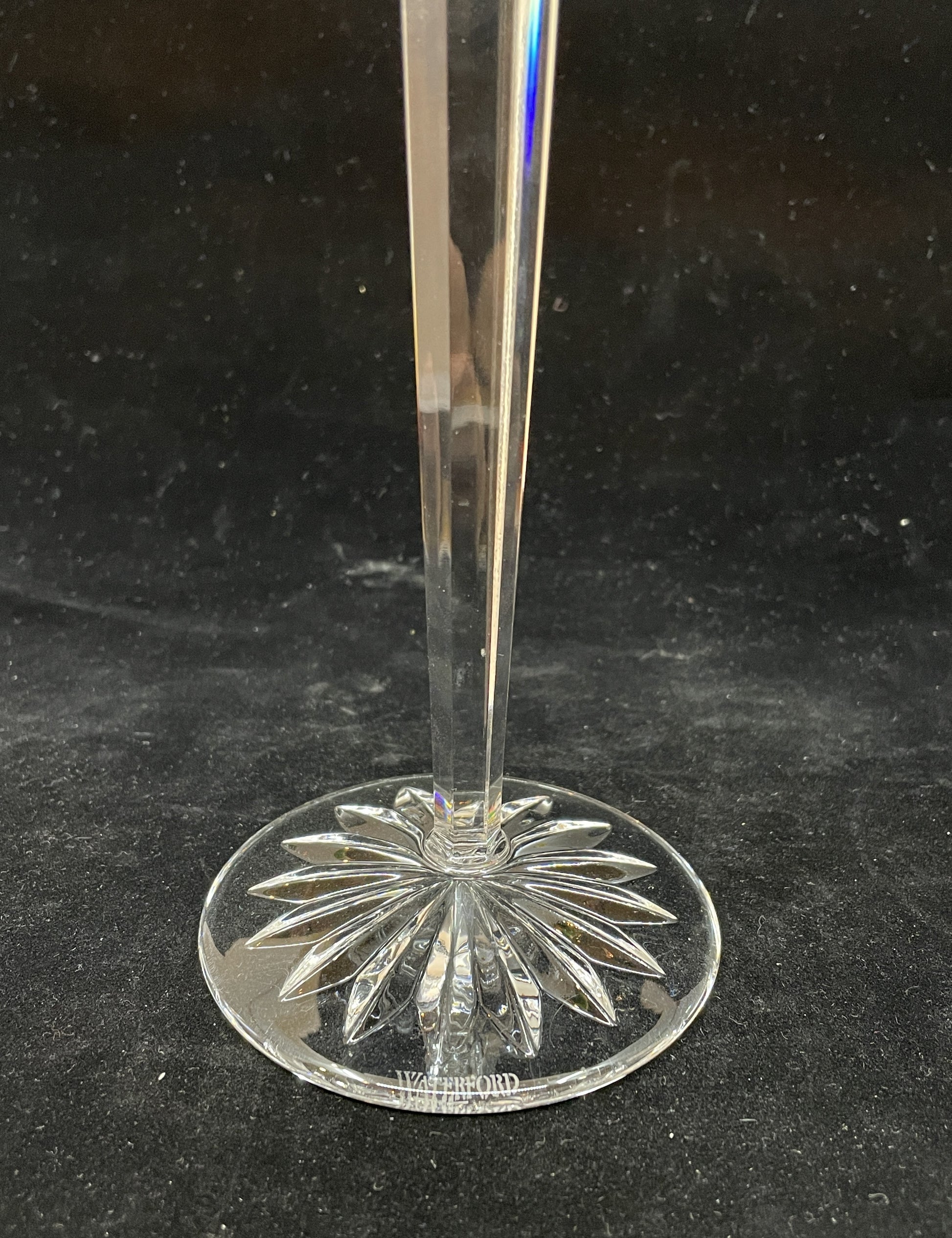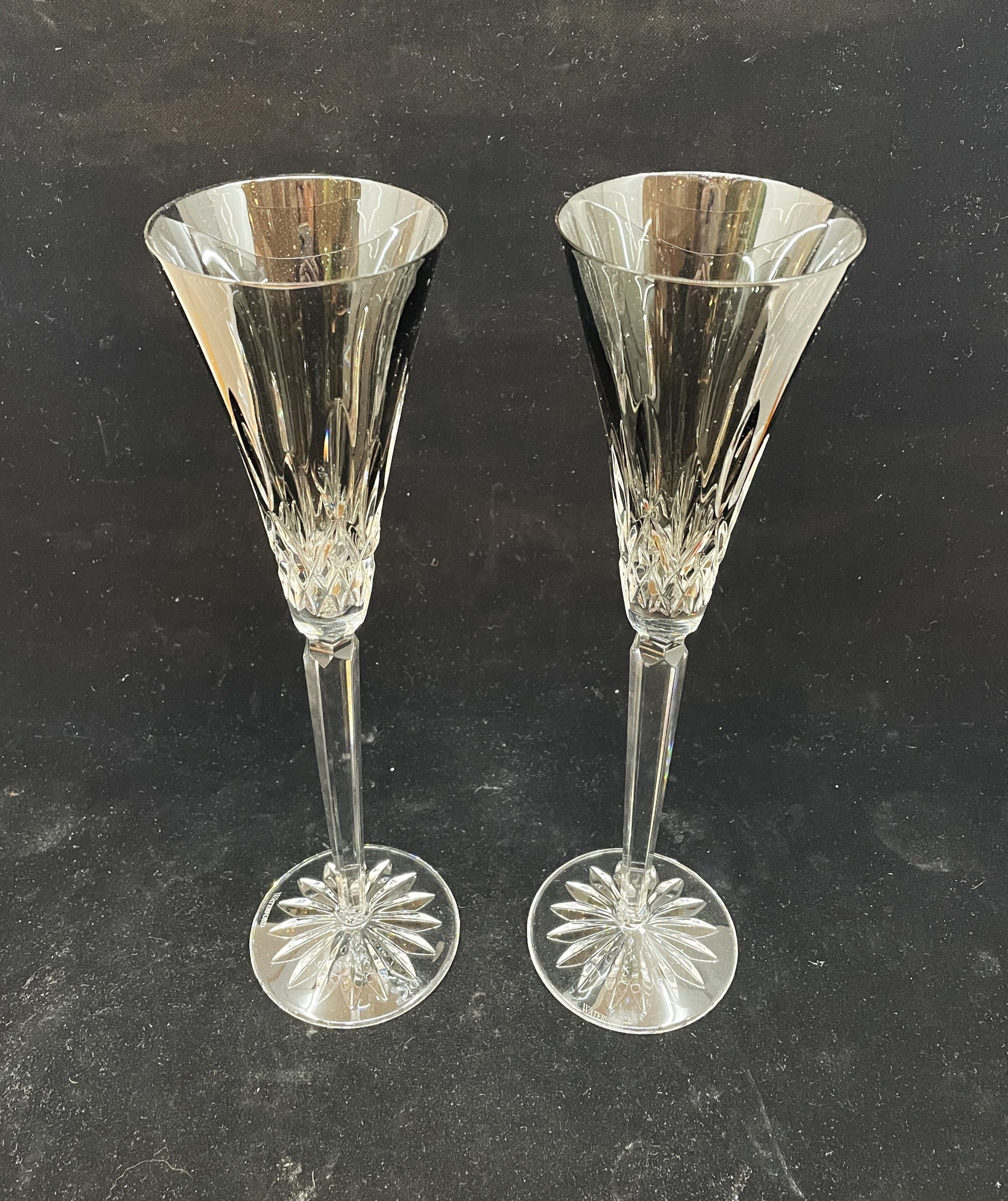 These champagne toasting flutes from Waterford are in the Lismore pattern. They feature vertical cut designs with multi-faceted stems. The top of the tapered flutes are ombre smokey topaz. The bases have a starburst pattern with the Waterford mark.