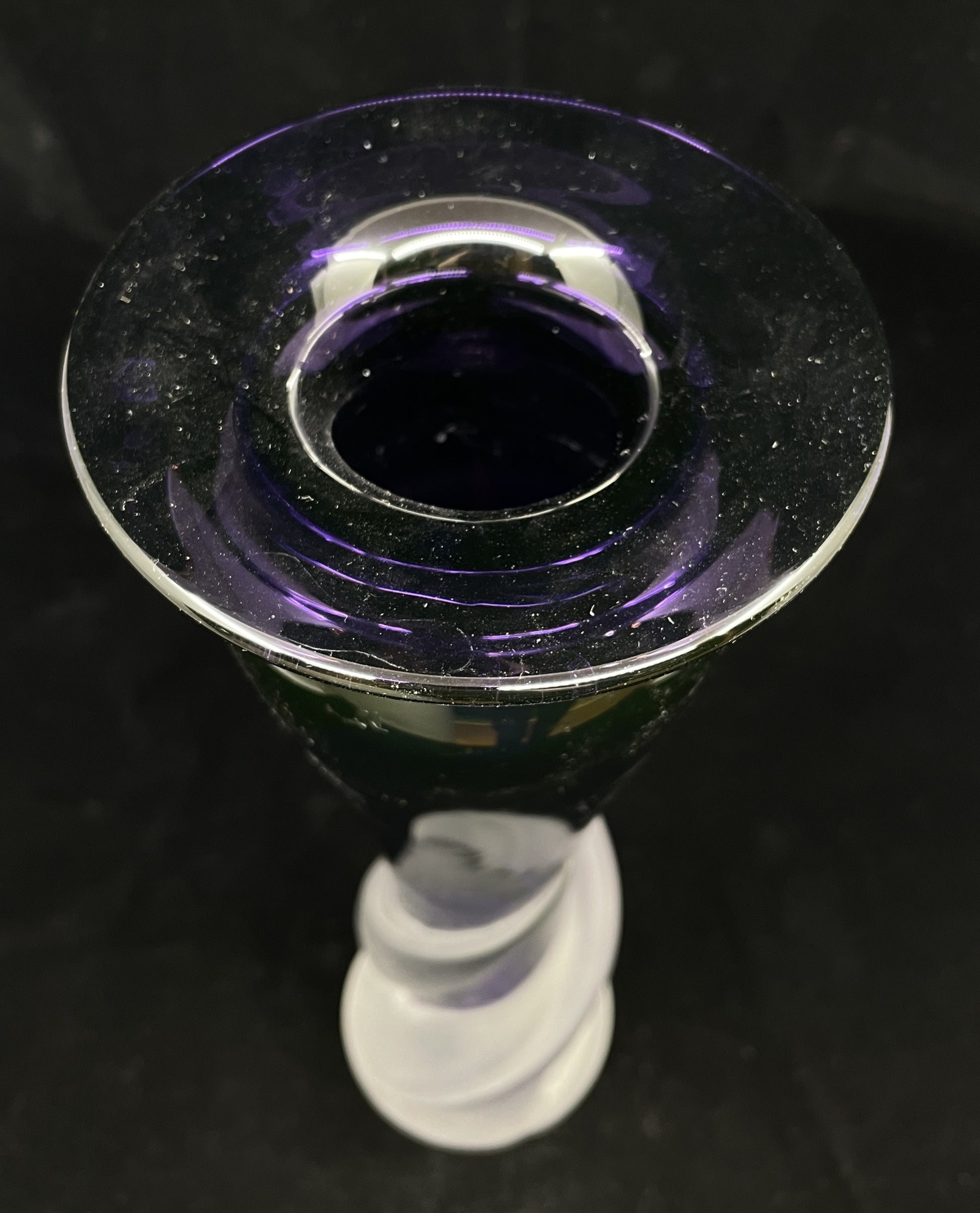Purple fused glass vase. This beautiful vase has a slender hourglass shape with a broad lip. The base color of the vase is a rich purple color. The bottom of the piece is accented with a frosted glass detail that twists and tapers as it creeps up the sides. This beautiful vase is an elegant and artistic way to add a pop of color to an arrangement.