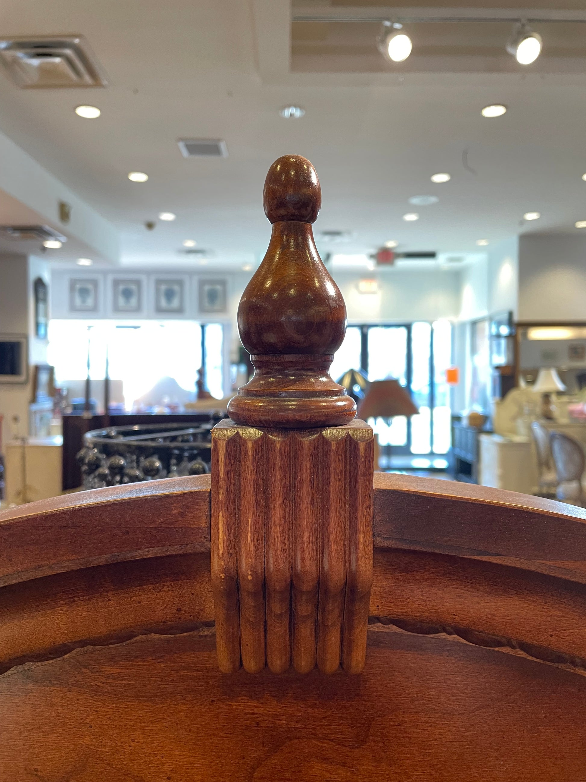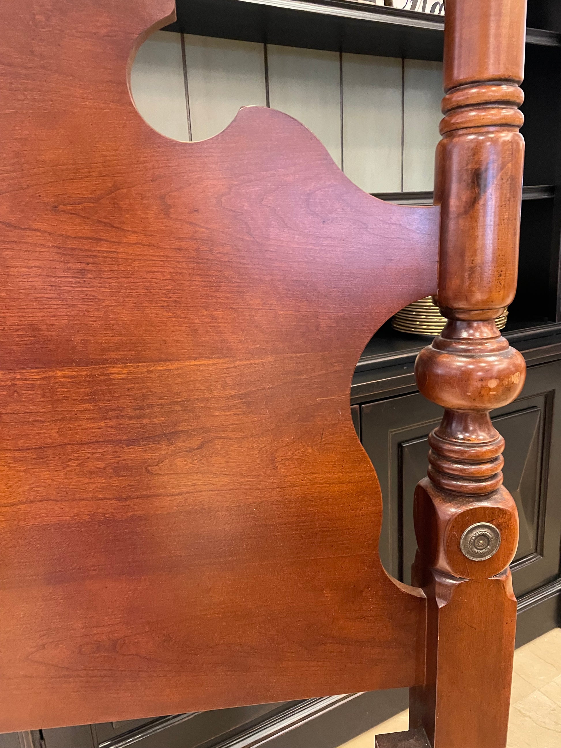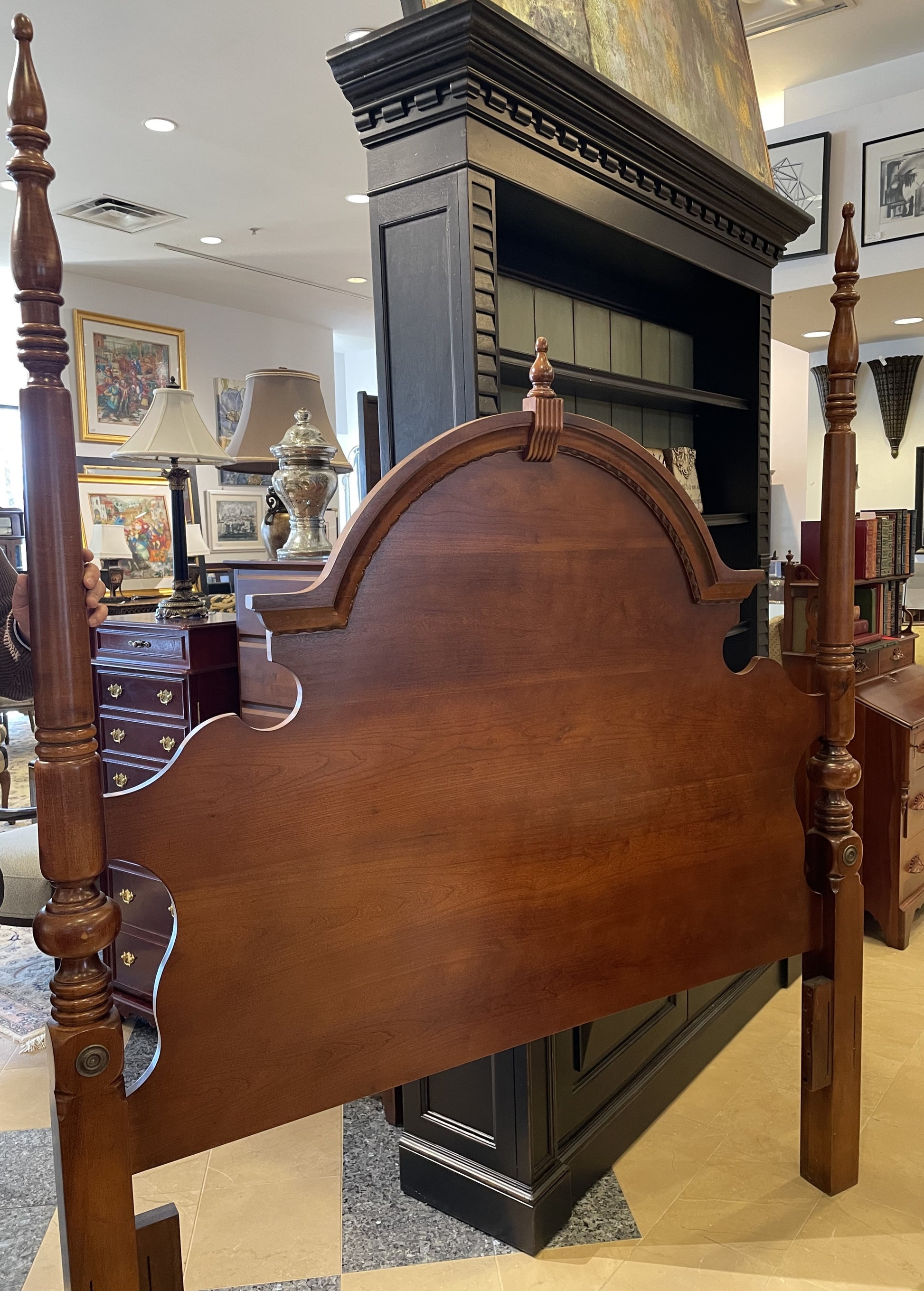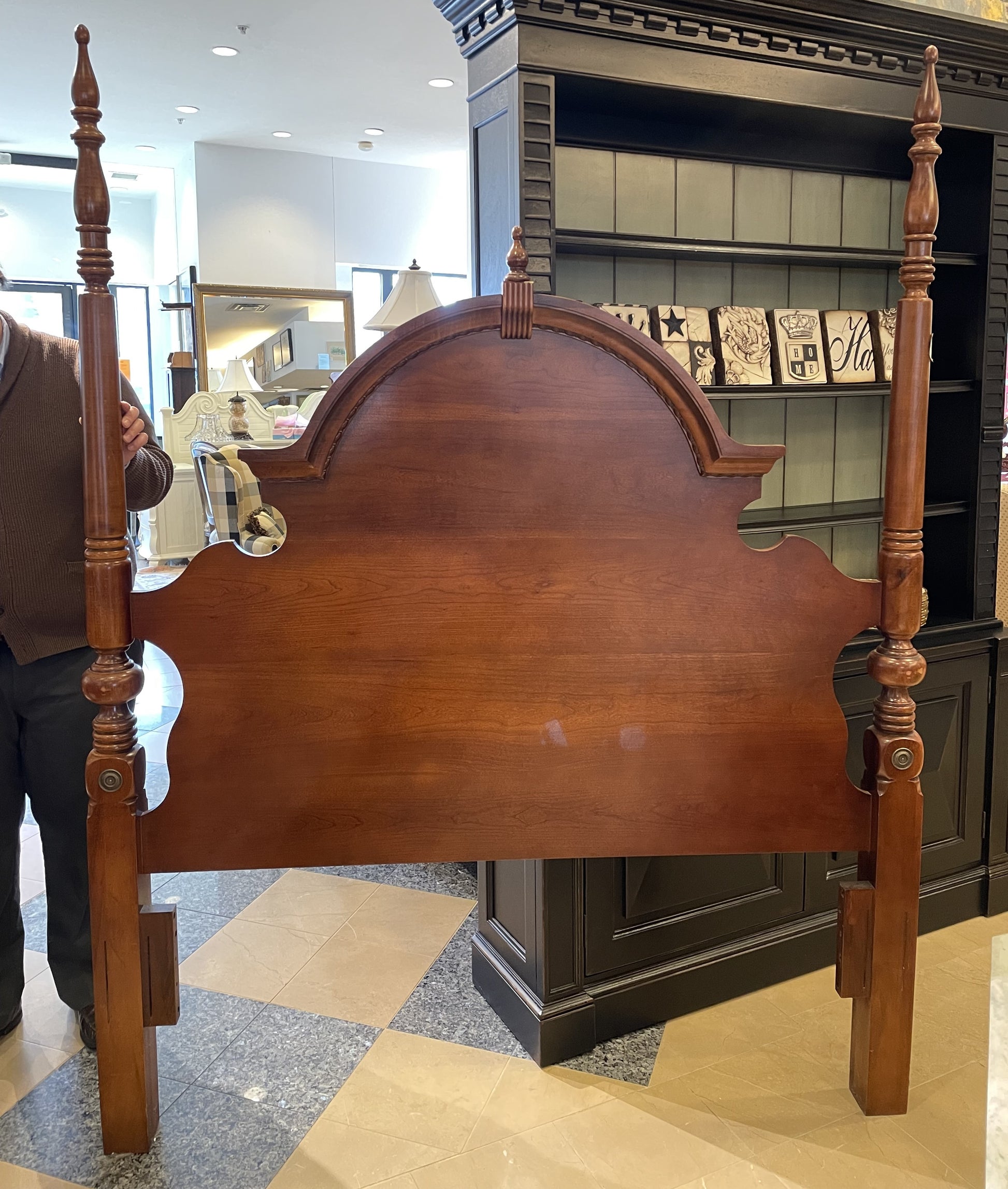 Poster bed for a queen size mattress. Features beautiful wood grain and pronounced, rounded top embellished with a finial. The two posts also have finials on top and are adorned with brass bolt covers. Stamped "Made in the USA" on the back. There is some minor wear on the wood (pictured). Comes with the footboard, side rails, and slats.
