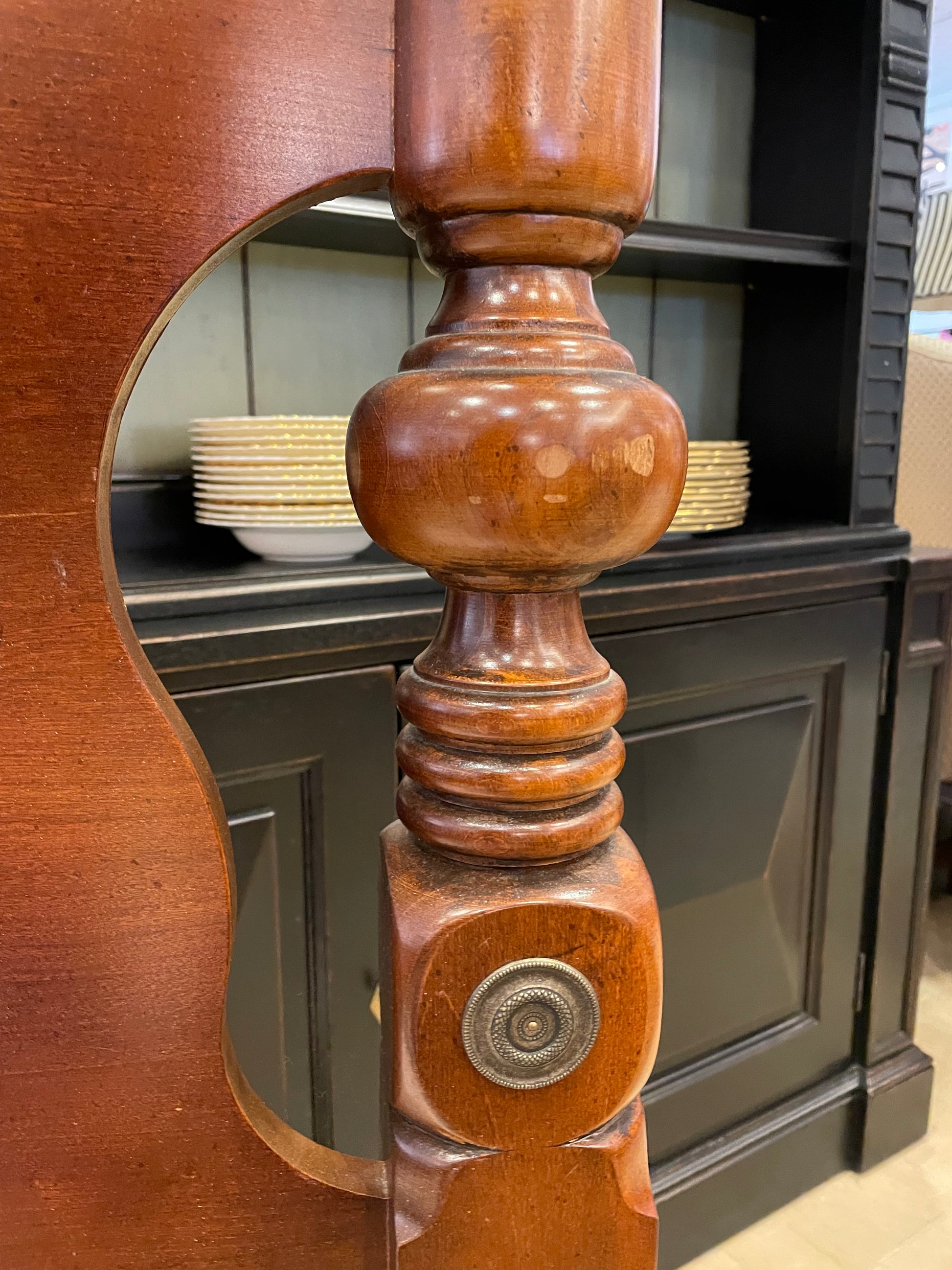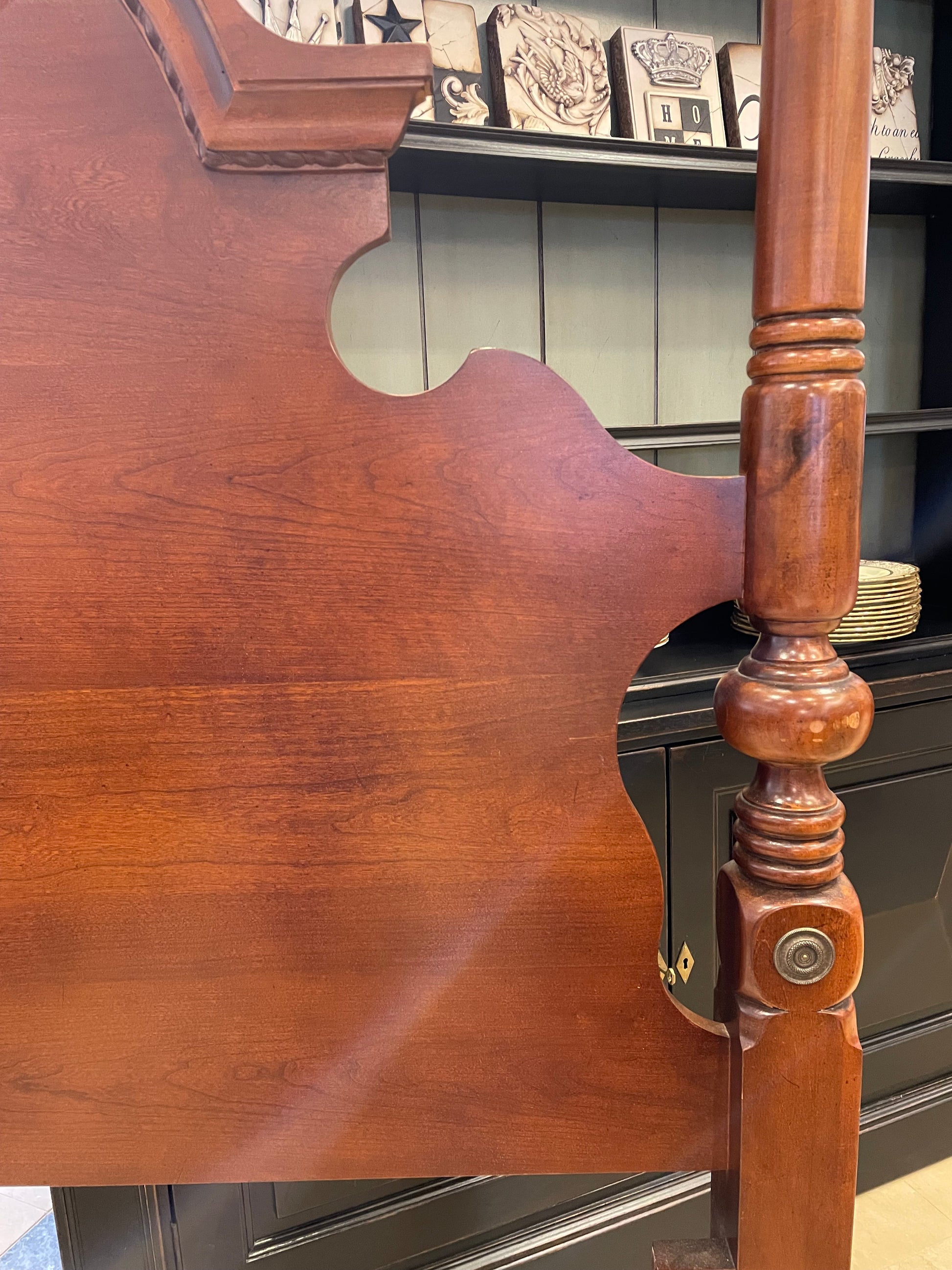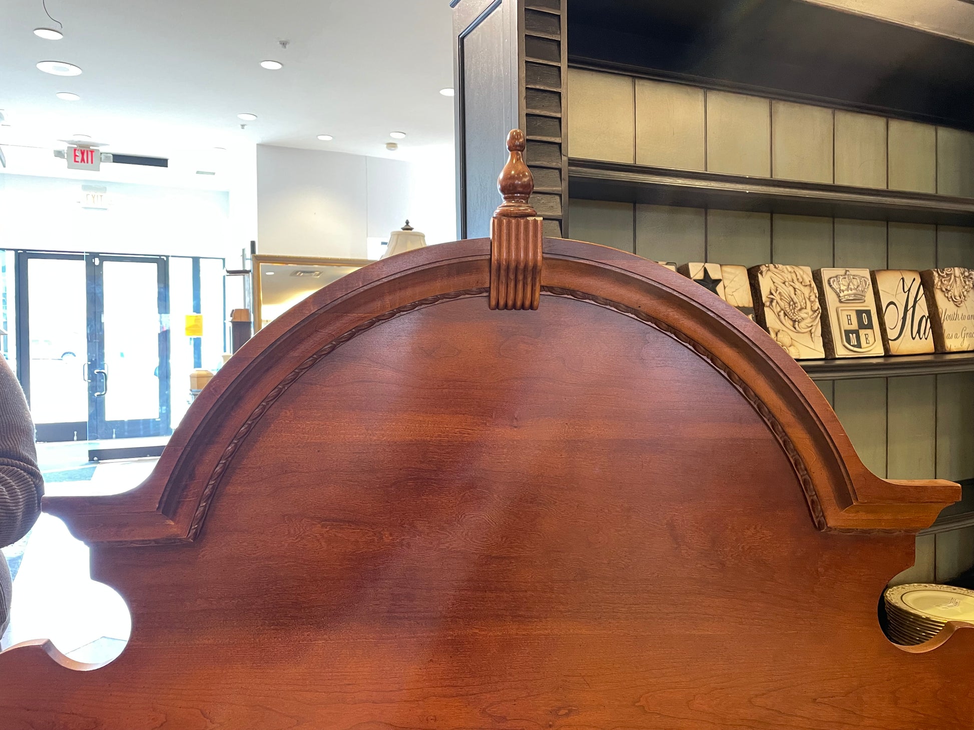 Poster bed for a queen size mattress. Features beautiful wood grain and pronounced, rounded top embellished with a finial. The two posts also have finials on top and are adorned with brass bolt covers. Stamped "Made in the USA" on the back. There is some minor wear on the wood (pictured). Comes with the footboard, side rails, and slats.