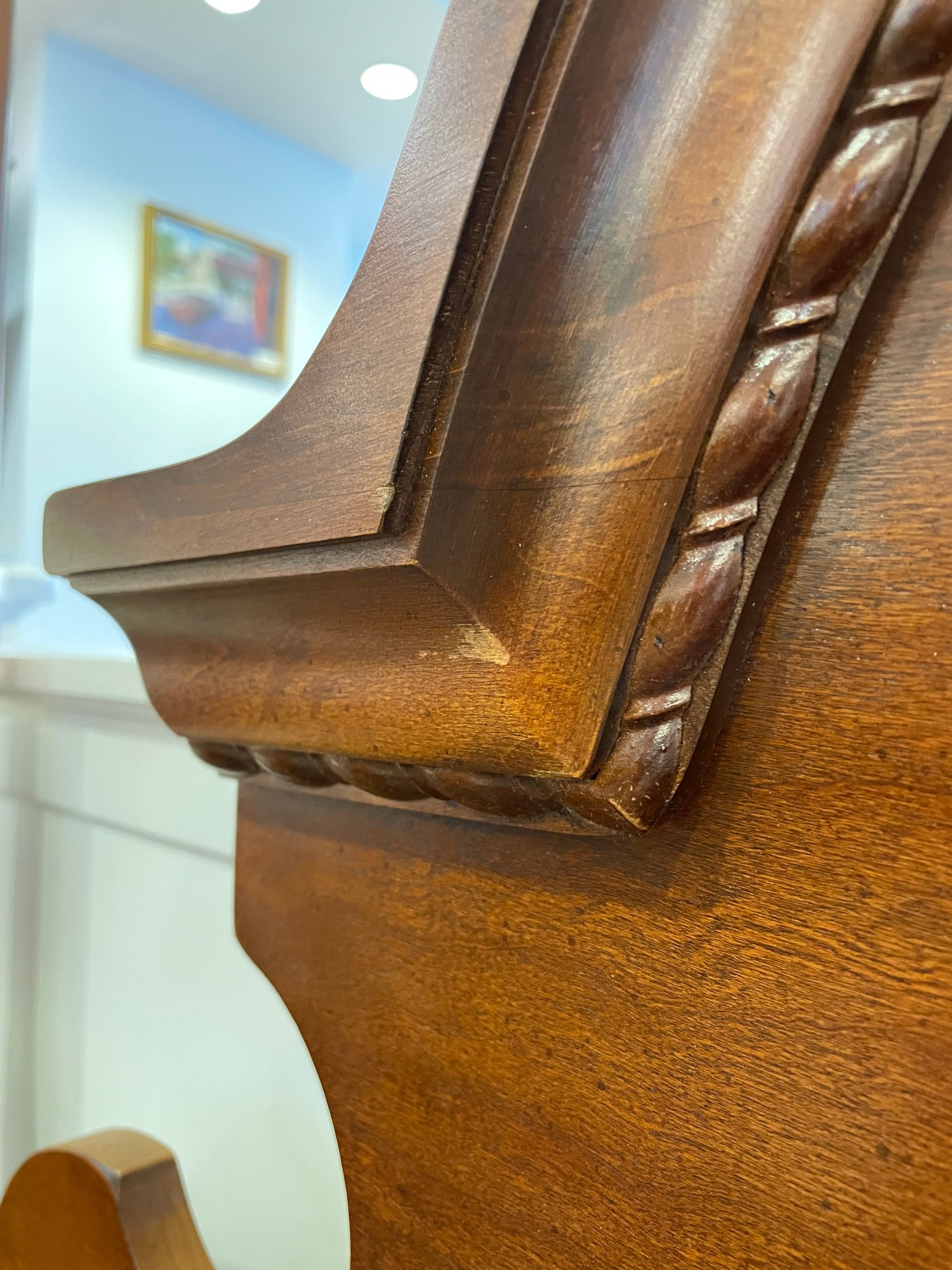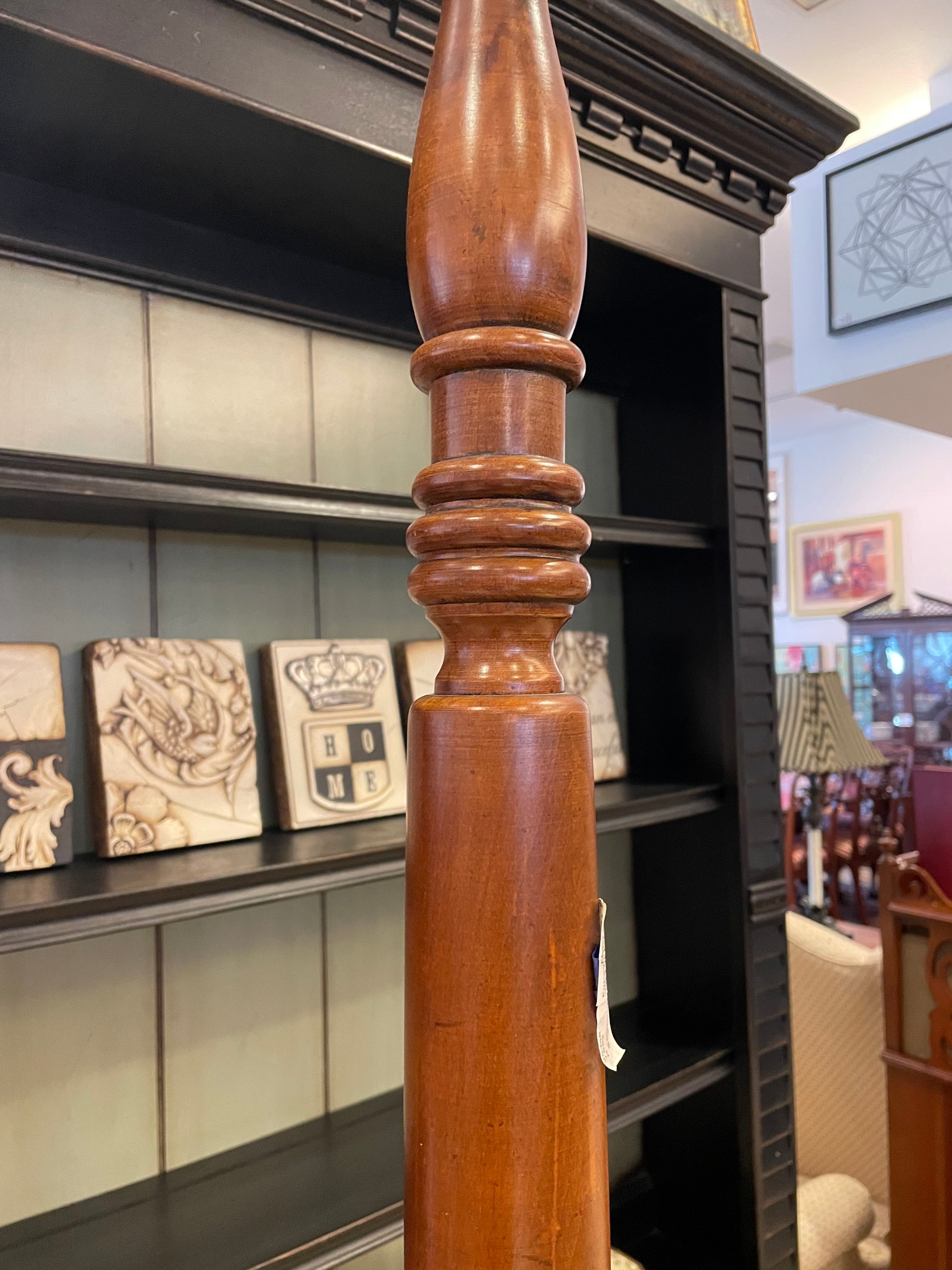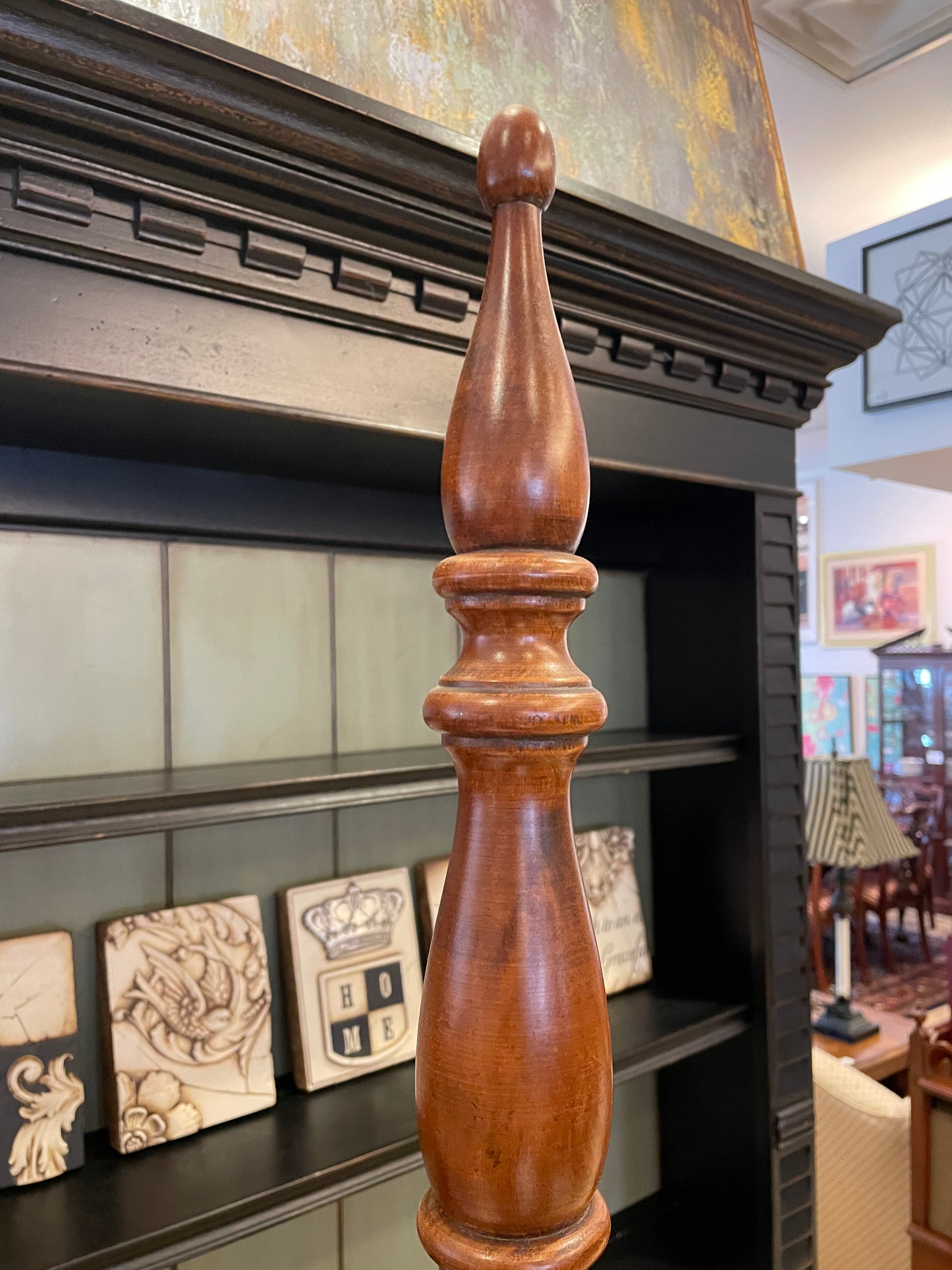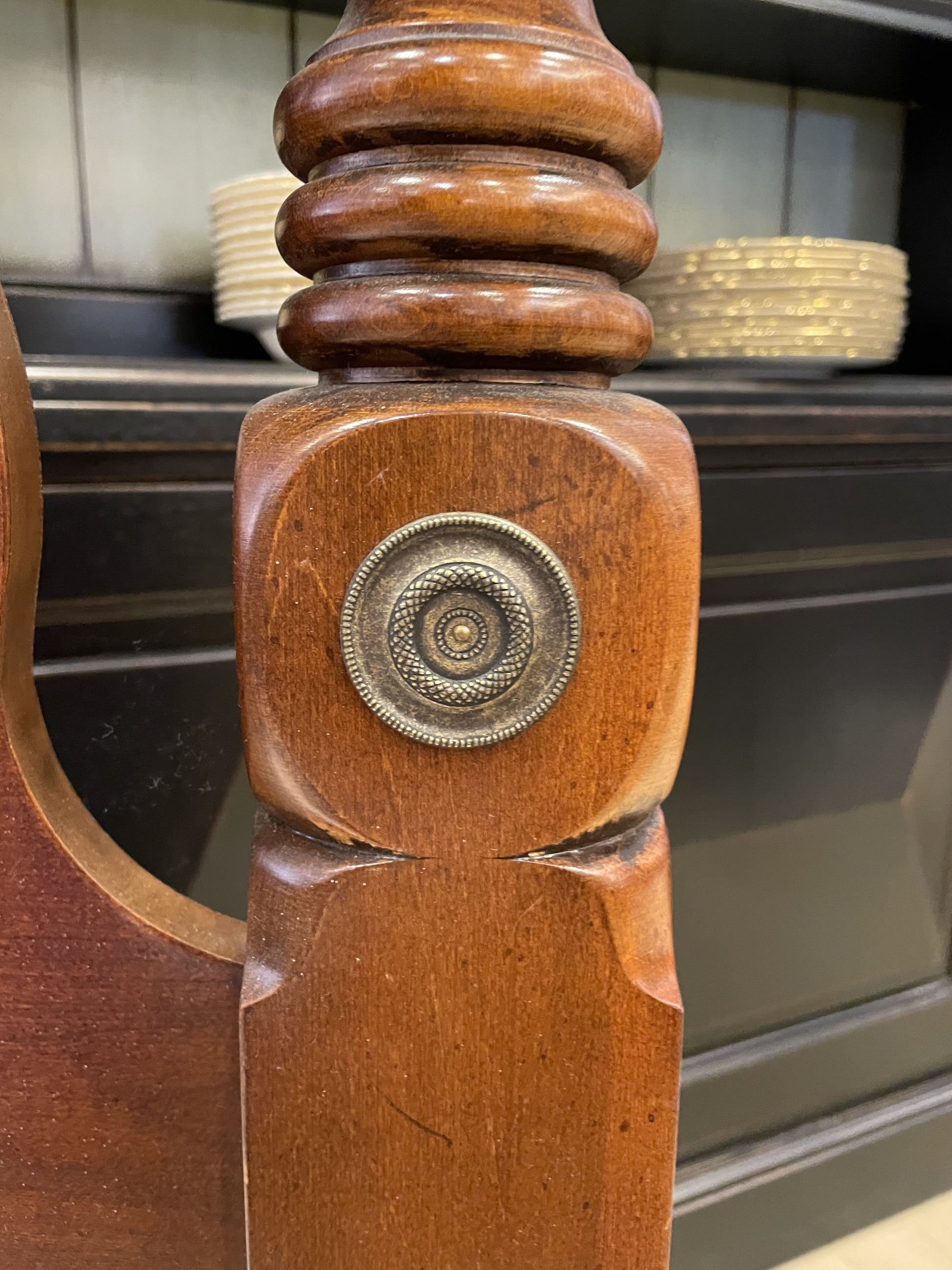 Poster bed for a queen size mattress. Features beautiful wood grain and pronounced, rounded top embellished with a finial. The two posts also have finials on top and are adorned with brass bolt covers. Stamped "Made in the USA" on the back. There is some minor wear on the wood (pictured). Comes with the footboard, side rails, and slats.