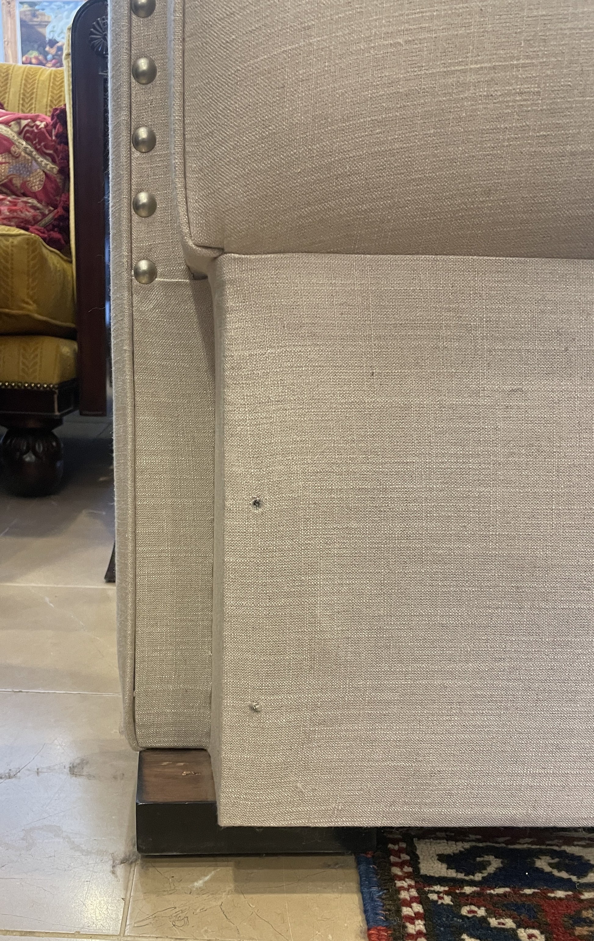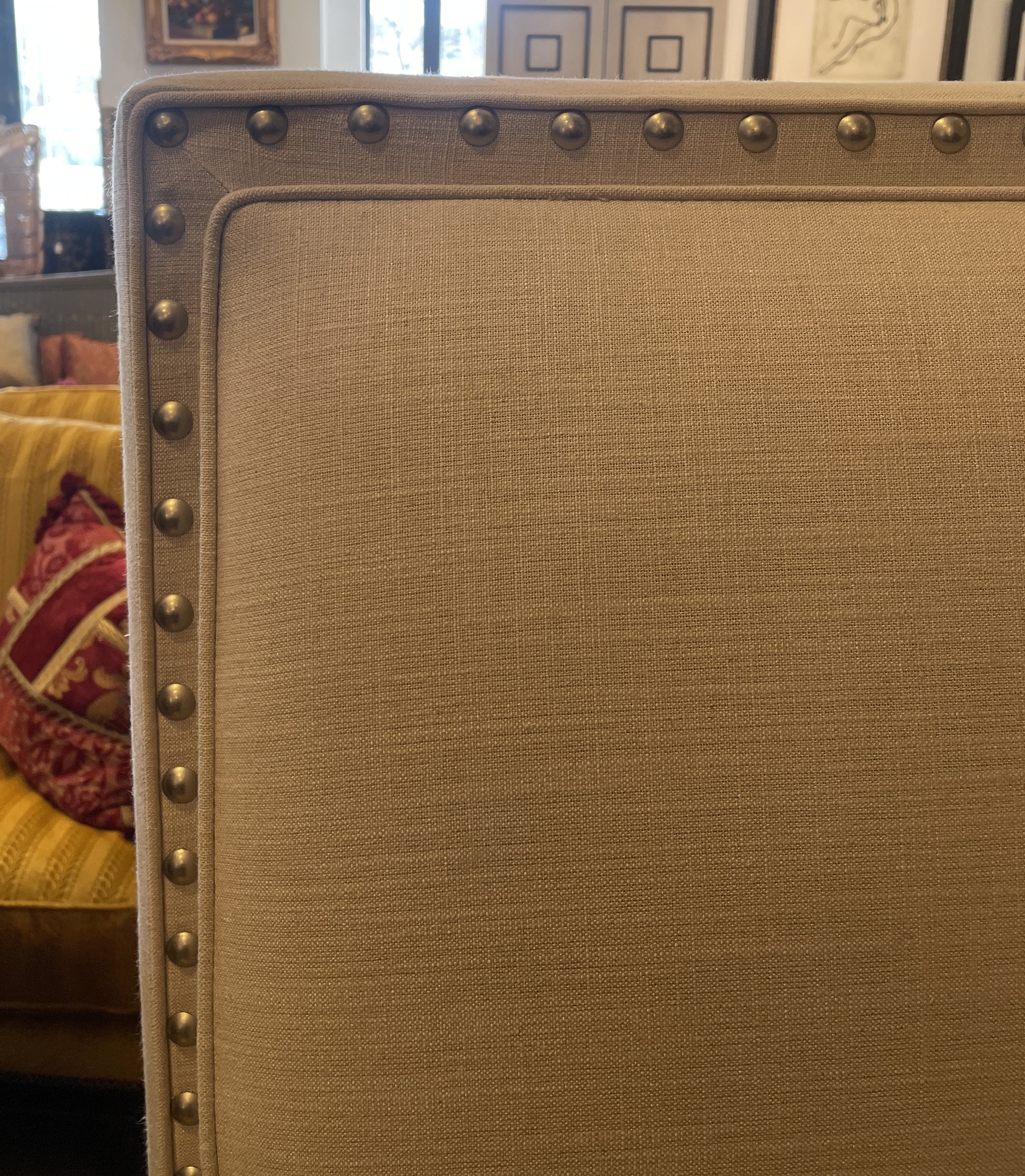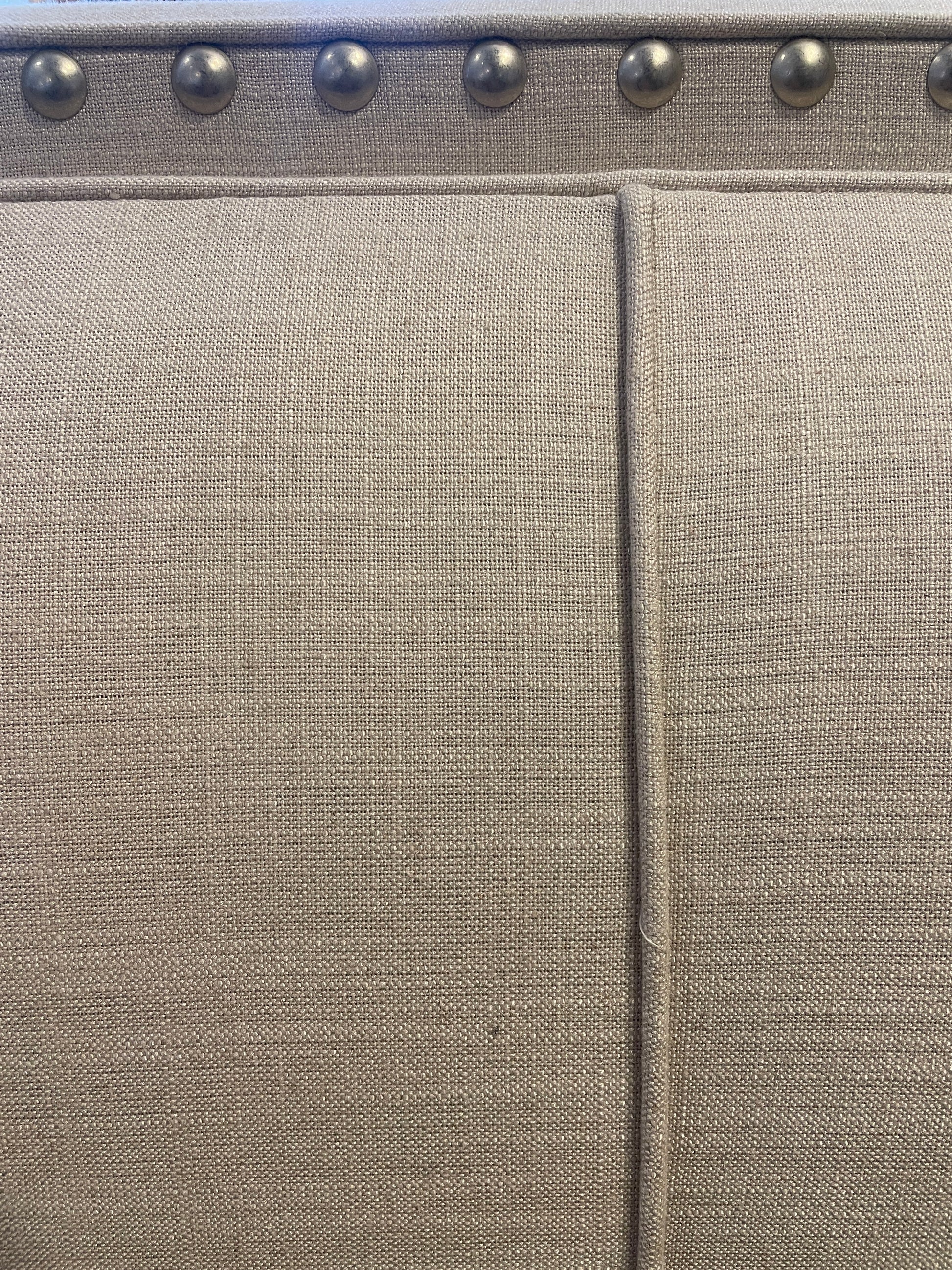 Queen upholstered bed, tufted. This gorgeous bed features a simple, inviting design. The bed is upholstered in a light gray fabric. The outer edge of the headboard has a silver toned nailhead trim that borders the cushioned section of the piece. The cushioned portion in question features a simple design split into three vertical sections. A charming bed with a timeless design.