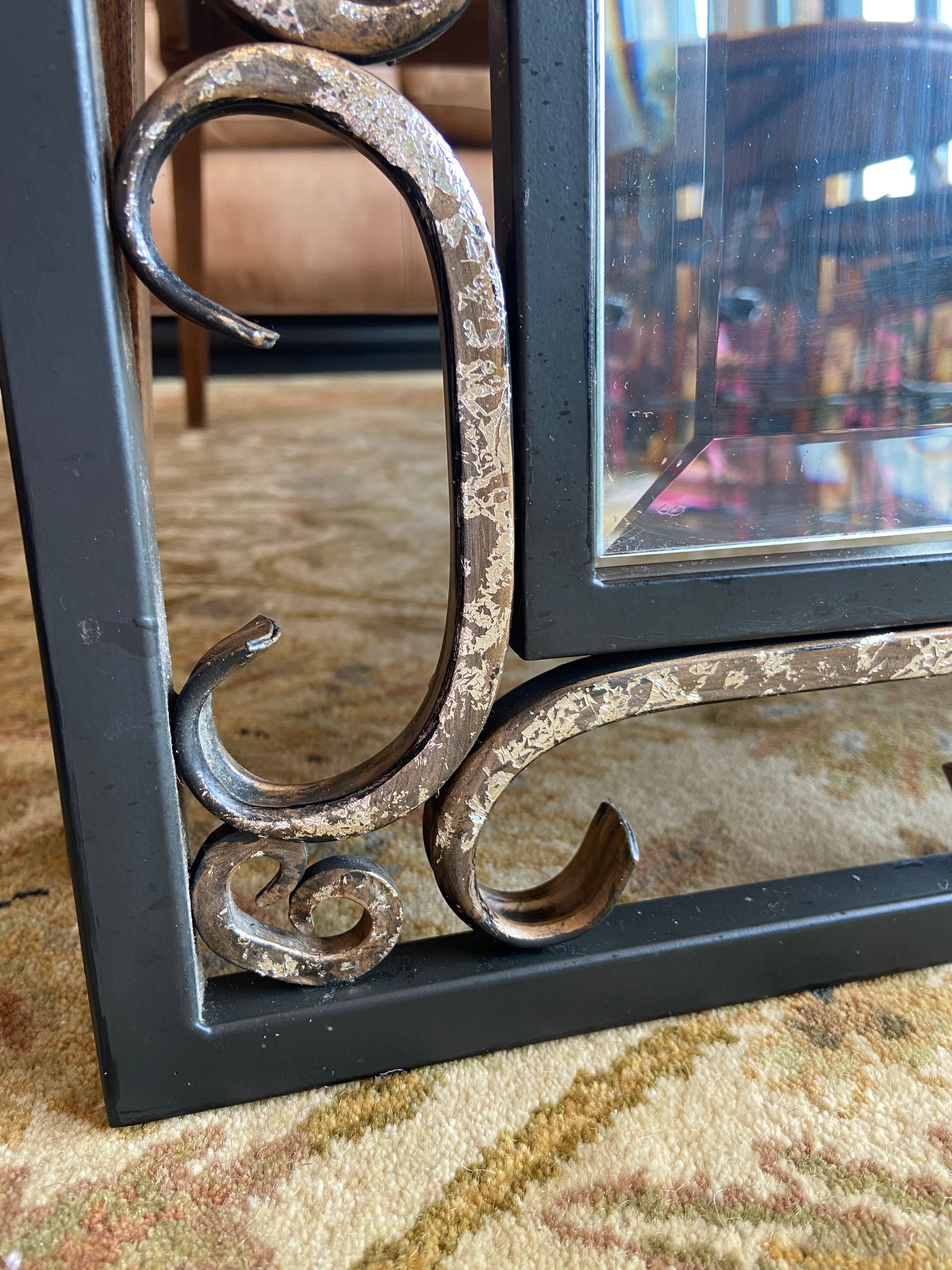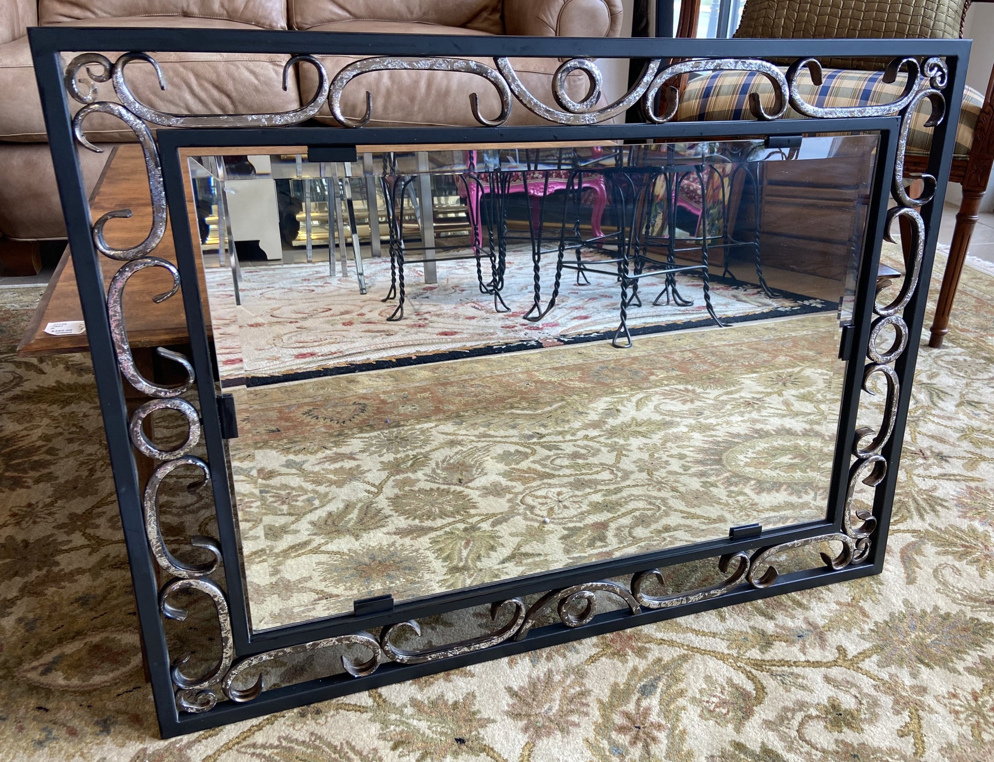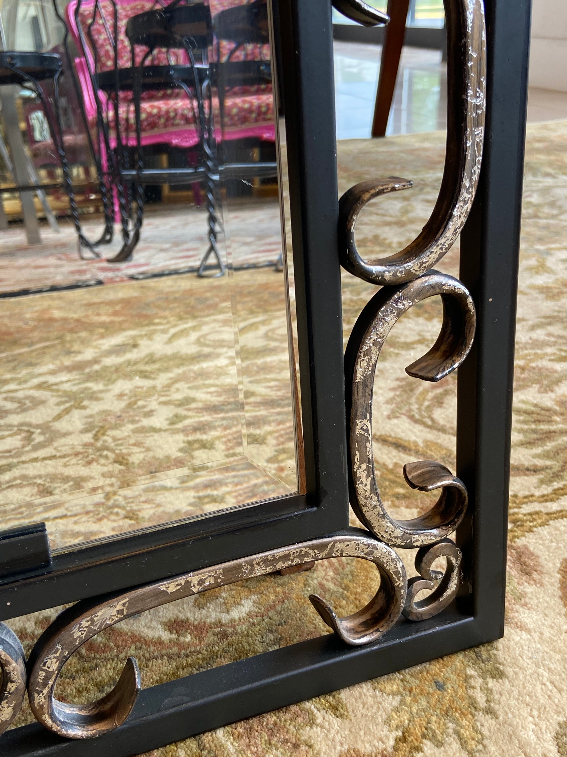 Mirror by Quizel. Features an iron frame with swirl details throughout. The mirror also includes beveled edges. Two mirrors are available.