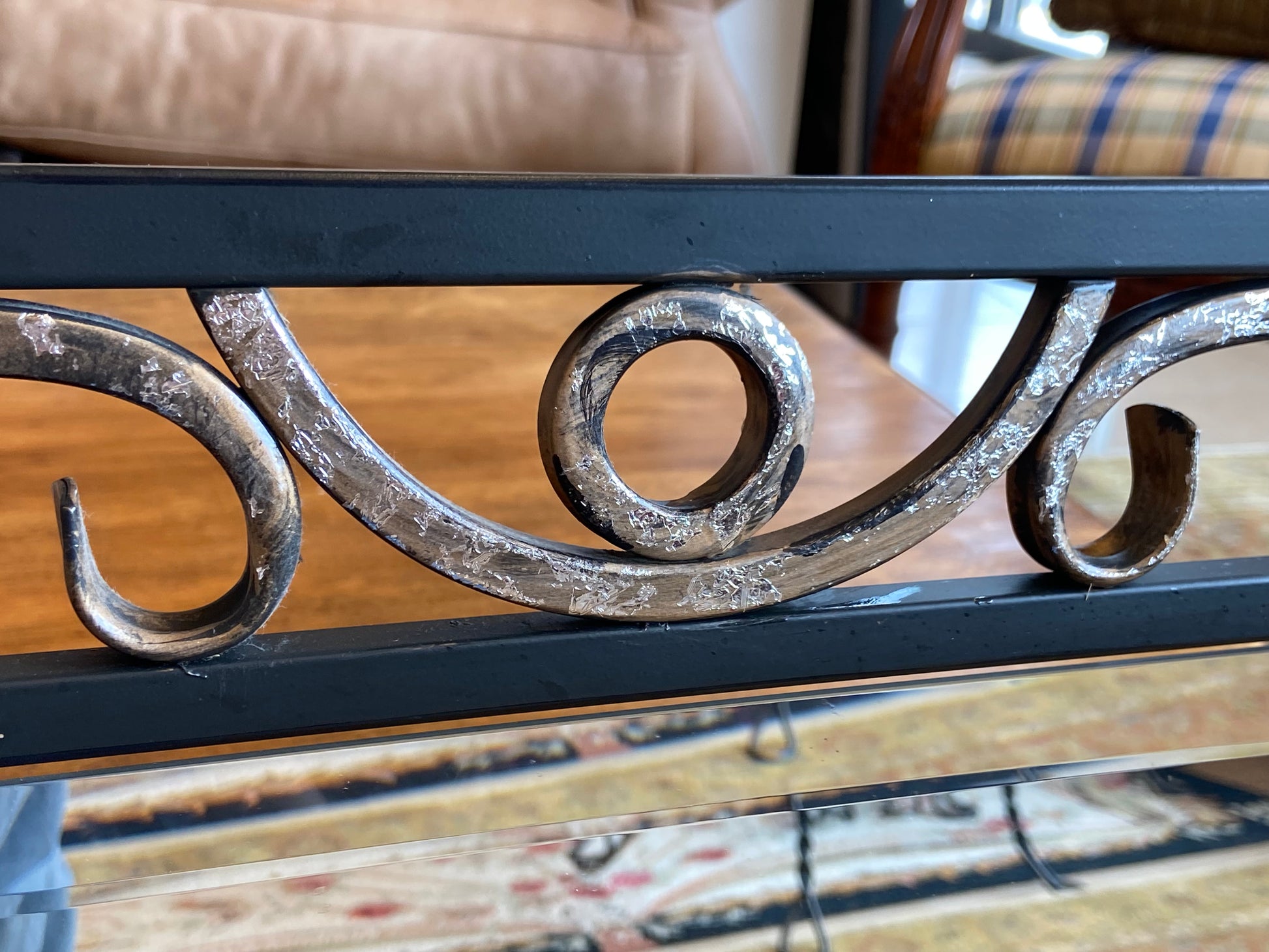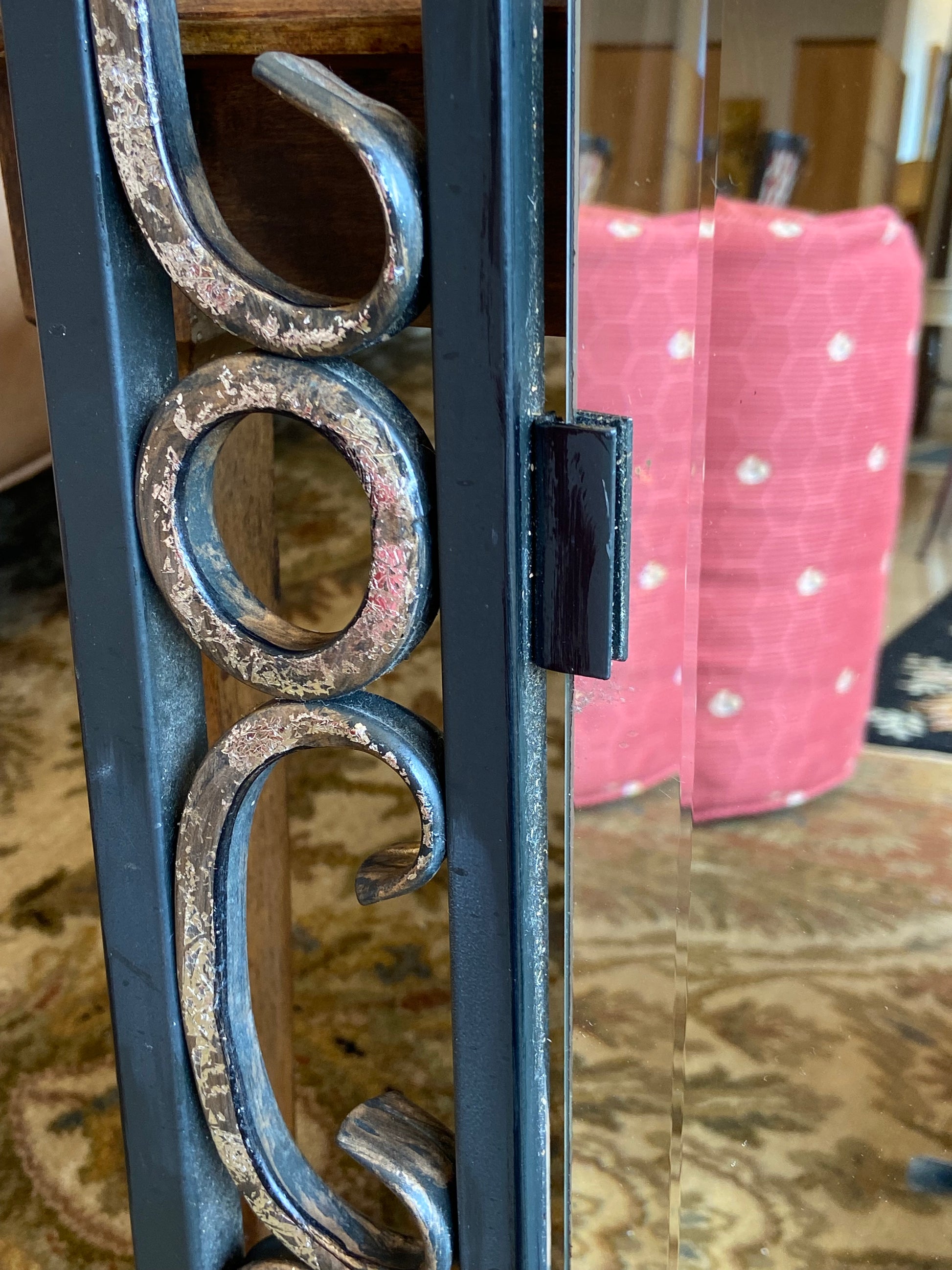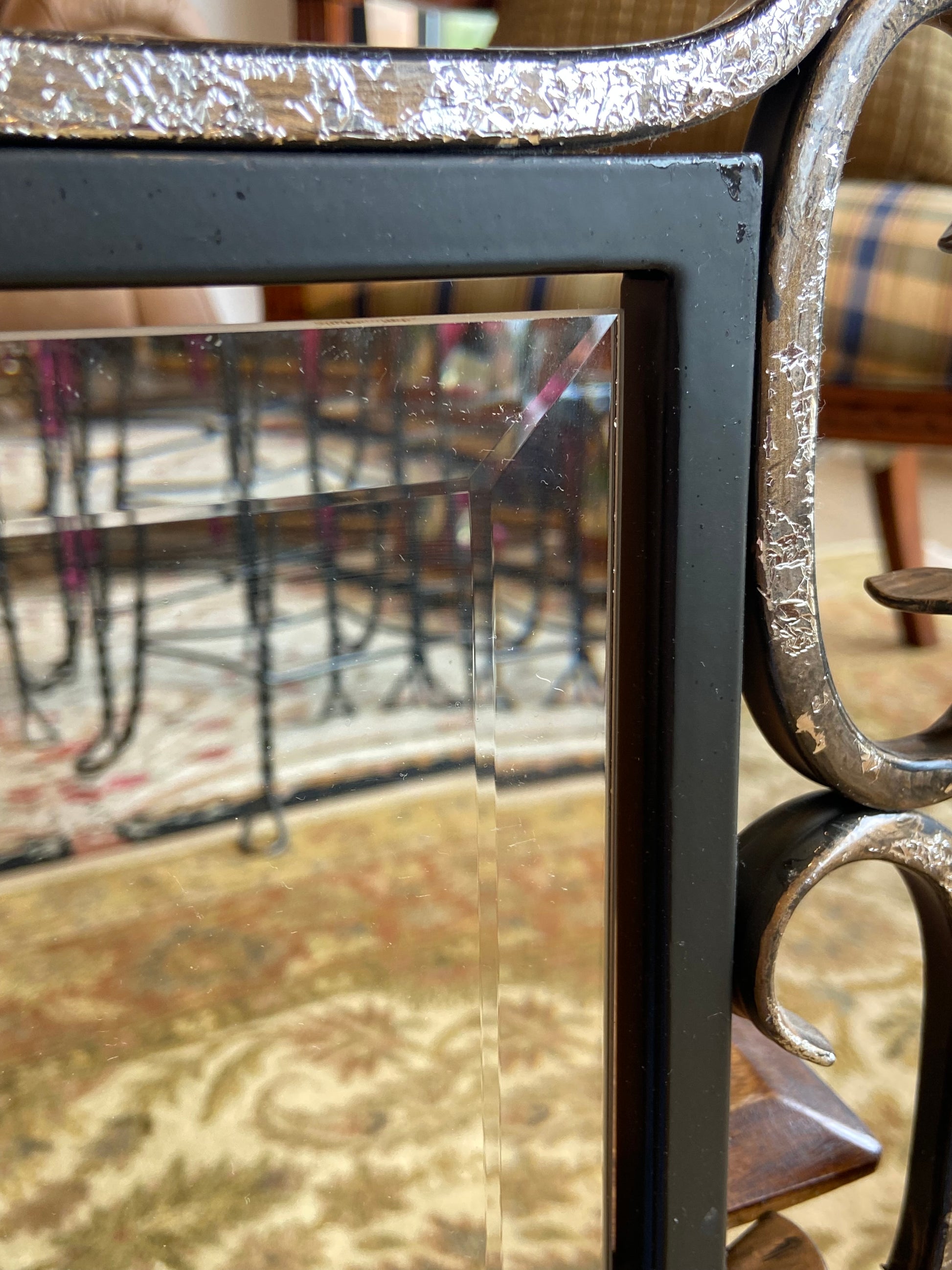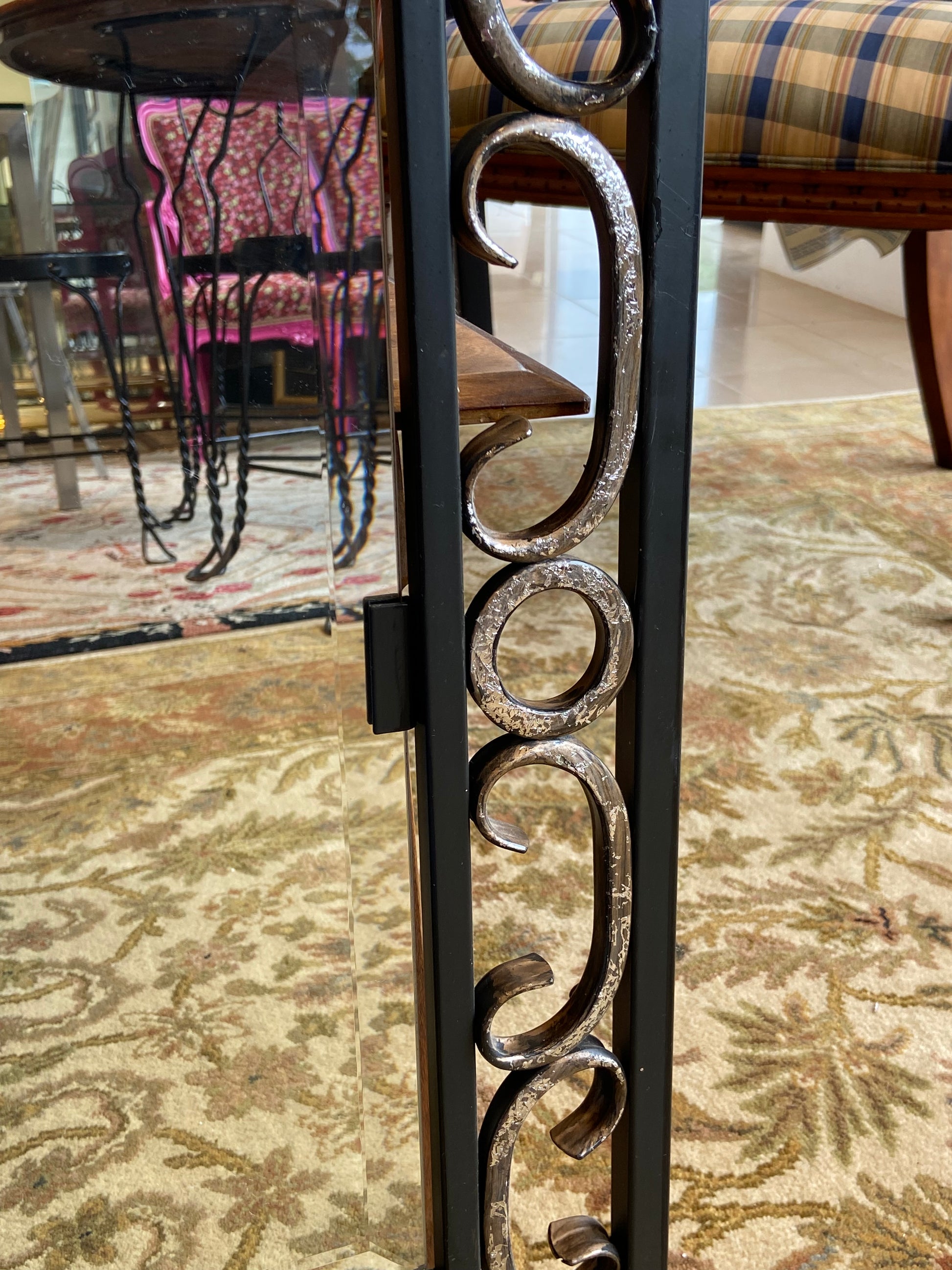 Mirror by Quizel. Features an iron frame with swirl details throughout. The mirror also includes beveled edges. Two mirrors are available.