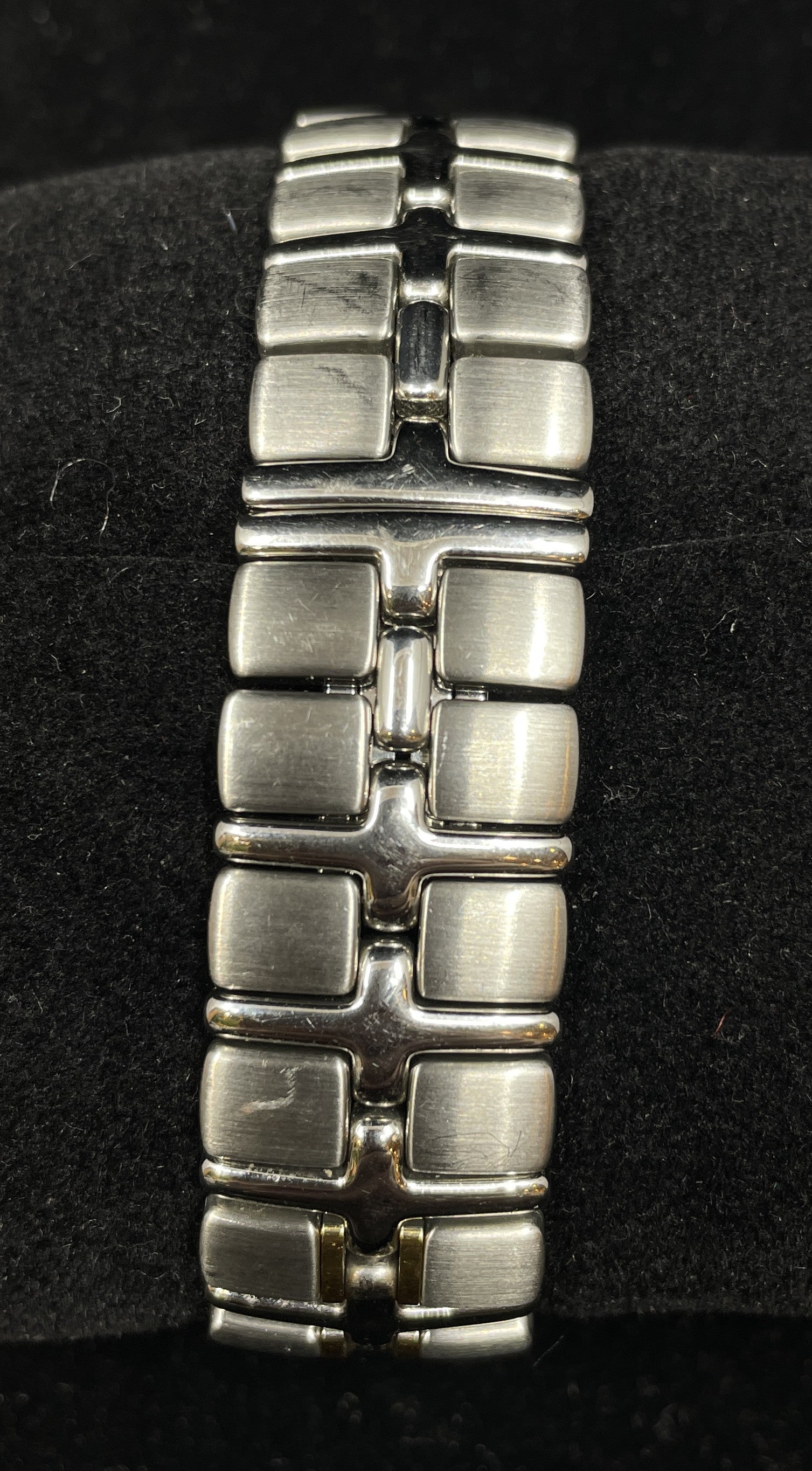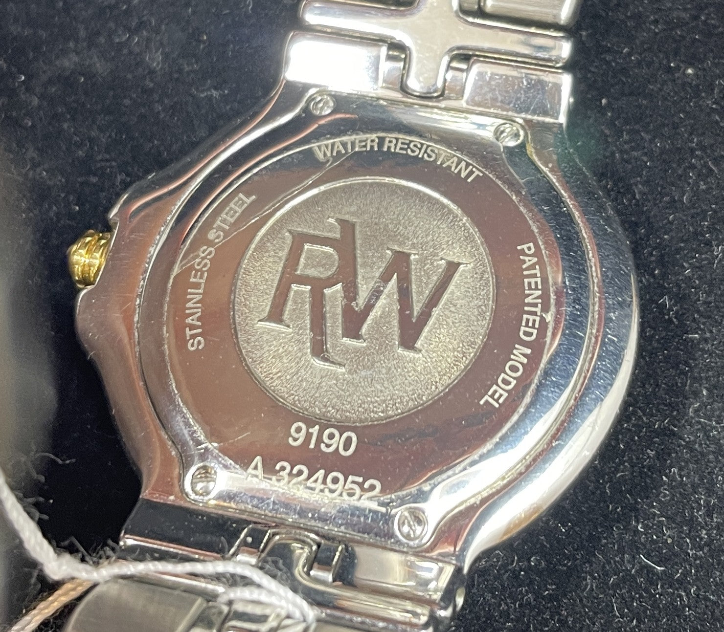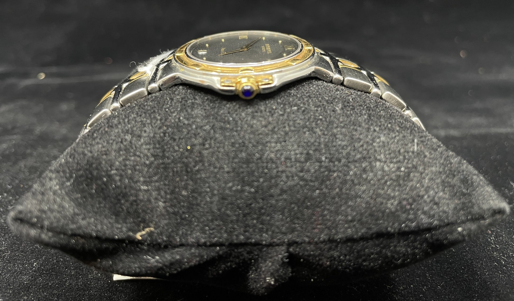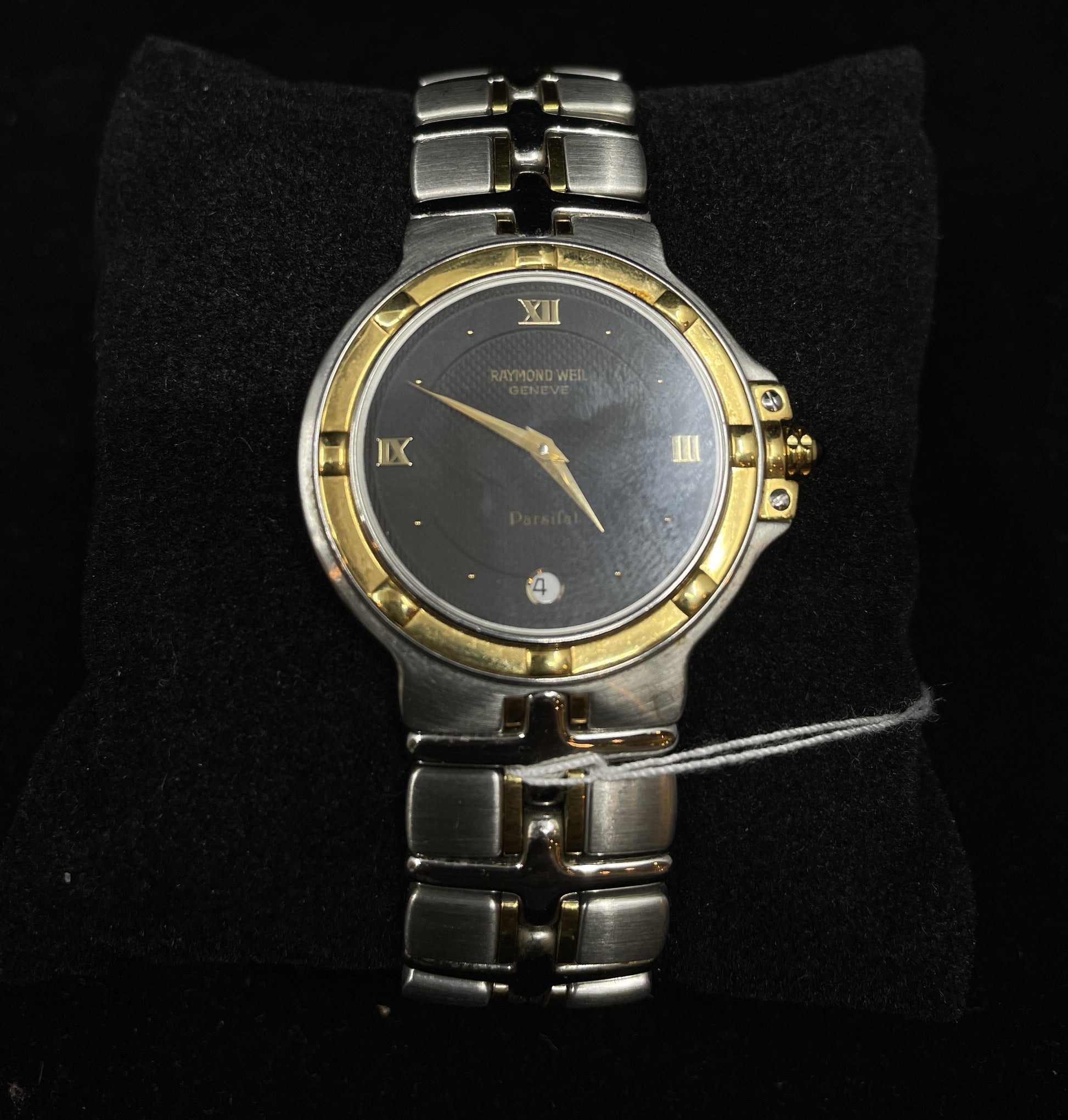 Raymond Weil Parsifal watch. This beautiful watch has a dual done design of gold and silver. The stainless steel band is accented with gold details, and a gold bezel surrounds the black face of this piece. The watch is closed with a hidden fold clasp. The piece functions with quartz movement. A beautiful and timeless design that's perfect for casual wear.