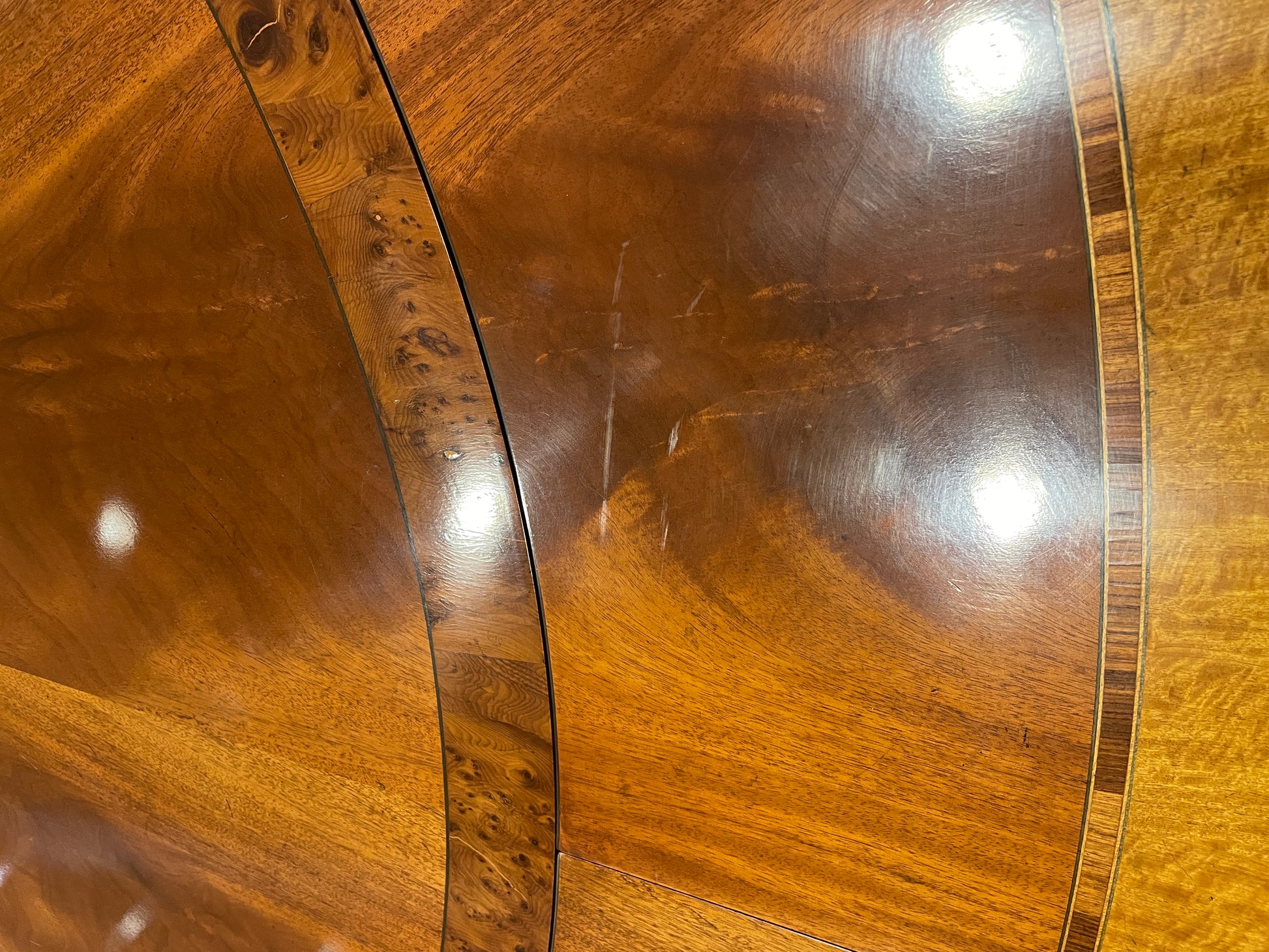 This luxurious dining table features stunning mahogany wood with beautiful wood grain details. The outer edge and center have a burled texture, while the rest of the table has a swirled grain in a sunburst design. The table sits atop a pedestal with sabered legs that are capped at the foot with brass casters. An octagonal platform connects the legs to the center portion of the pedestal, and turned pillars complete the pedestal above the platform. An incredible piece that exemplifies Restall Brown & Clennell's dedication to craftsmanship at the highest degree. Even at a glance, this piece boasts luxury.