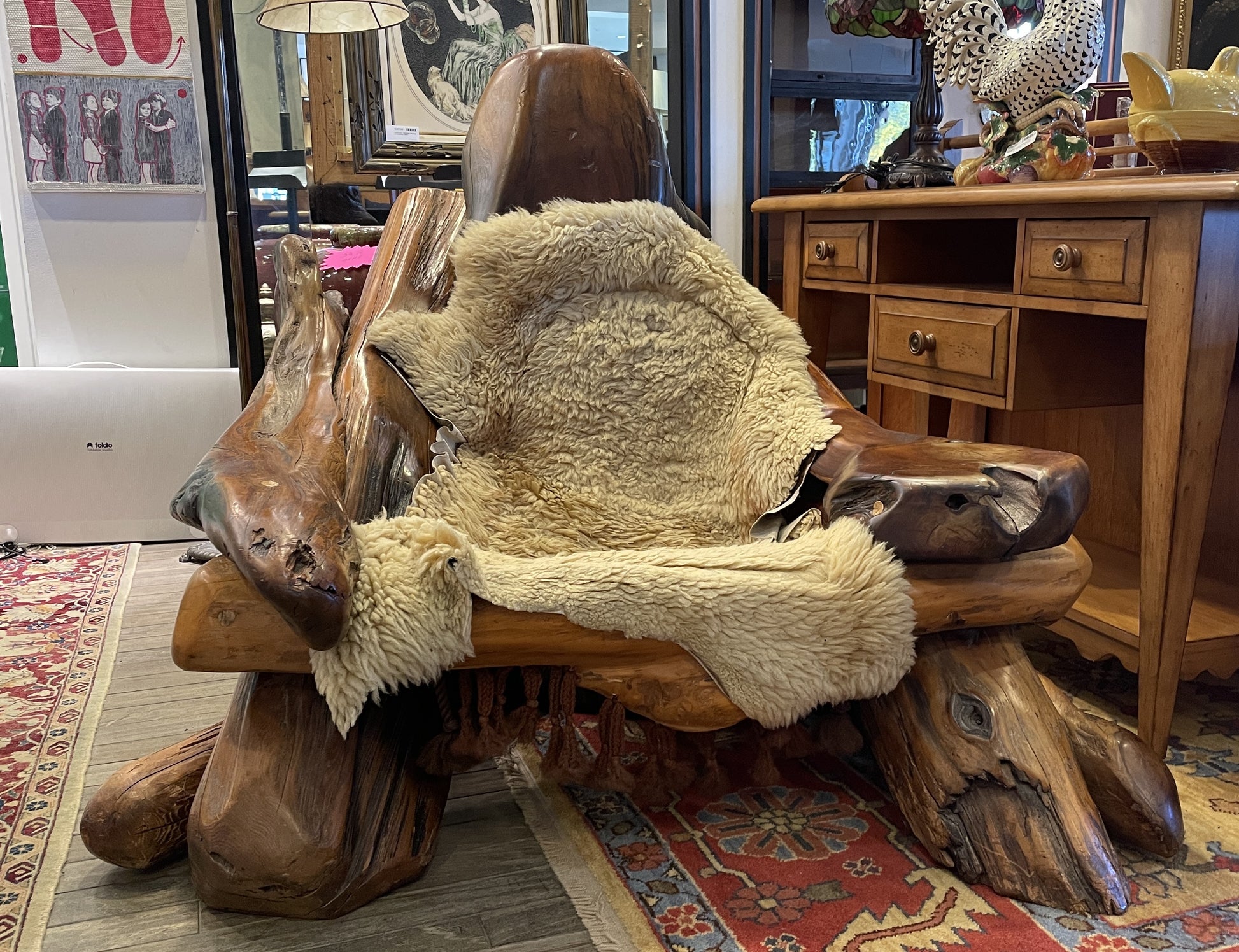 Sculptural redwood chair attributed to Daryl Stokes circa 1970s. The freeform redwood base stretches out like the roots of a tree. A sheepskin throw covers the seat. The throw is attached with brown ties to the sides of the chair, and matching tassels hang from the bottom of the seat. This beautiful chair is a unique piece of art and craftsmanship.