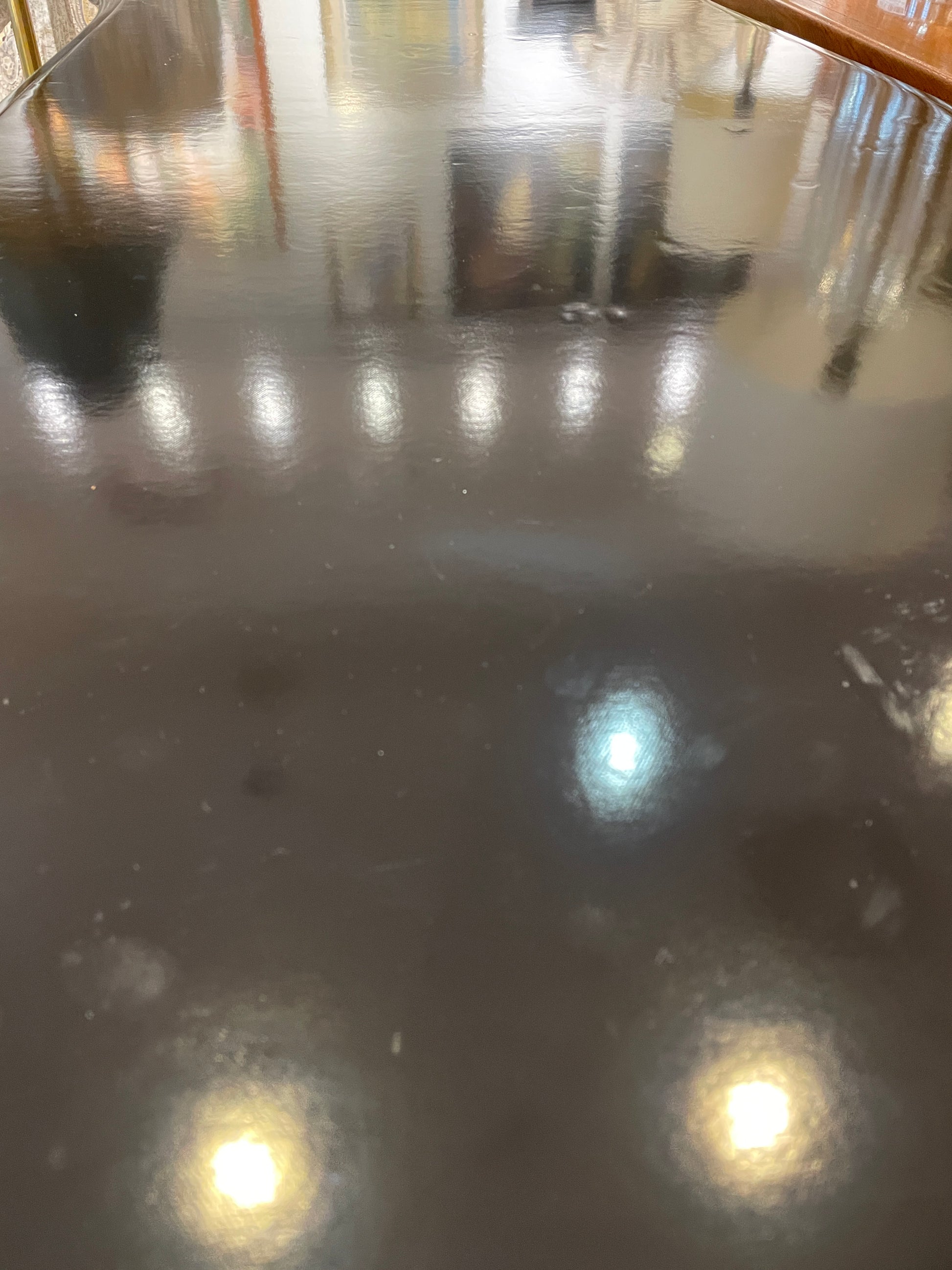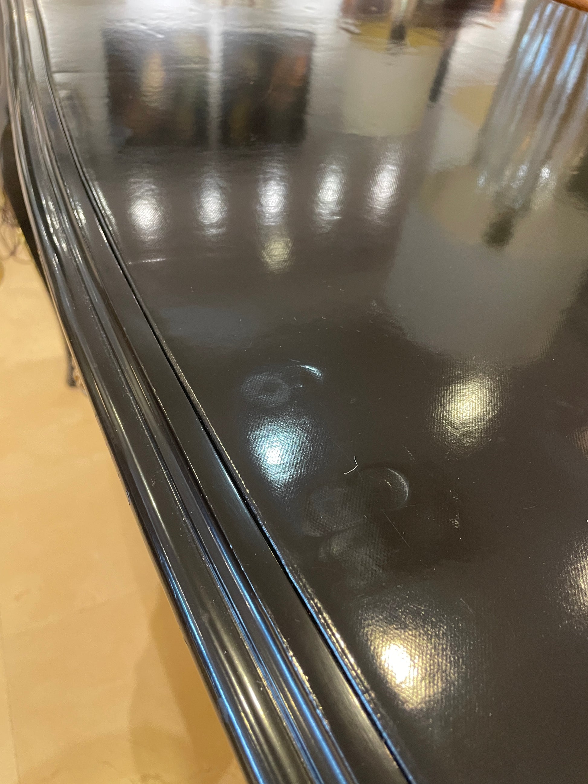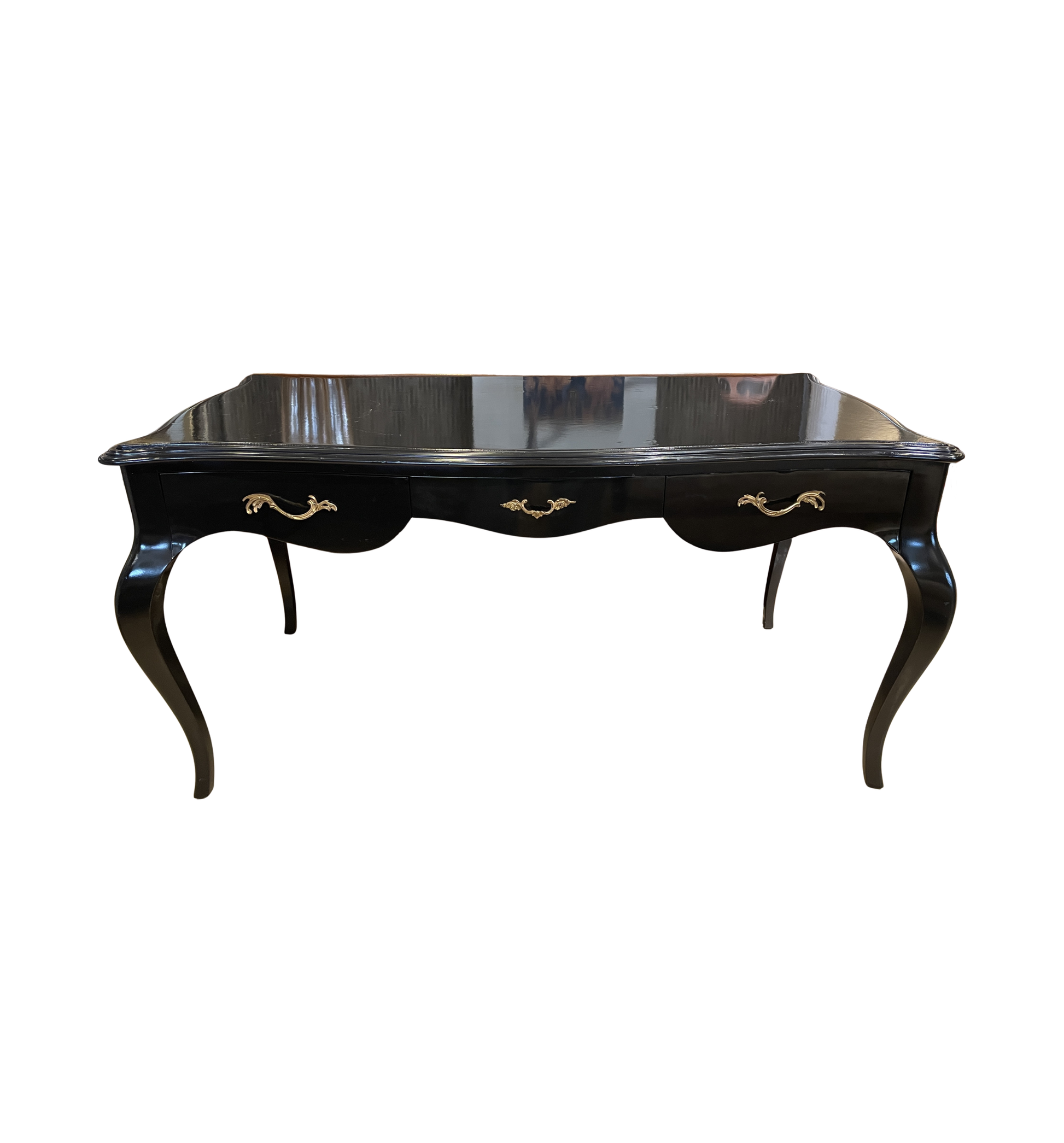 Regency style black desk with leather top. This stunning desk features a patent leather tabletop on a black wooden frame. The table is full of elegant curves from the cabriole legs to the carved apron, and the bowed tabletop sides. Three drawers sit just below the tabletop, each of which has a beautifully intricate brass handle. The black leather tabletop elevates this piece further with its luxurious shiny finish. A gorgeous desk that is sure to elevate any space with regency style.