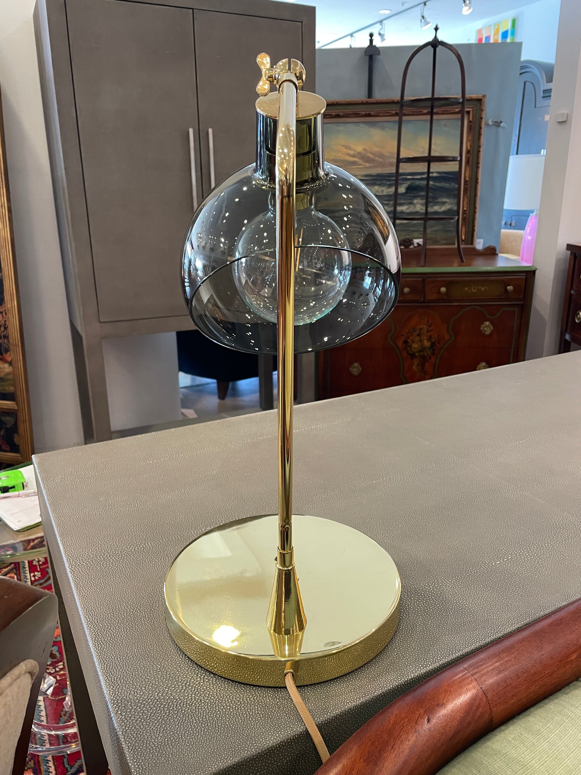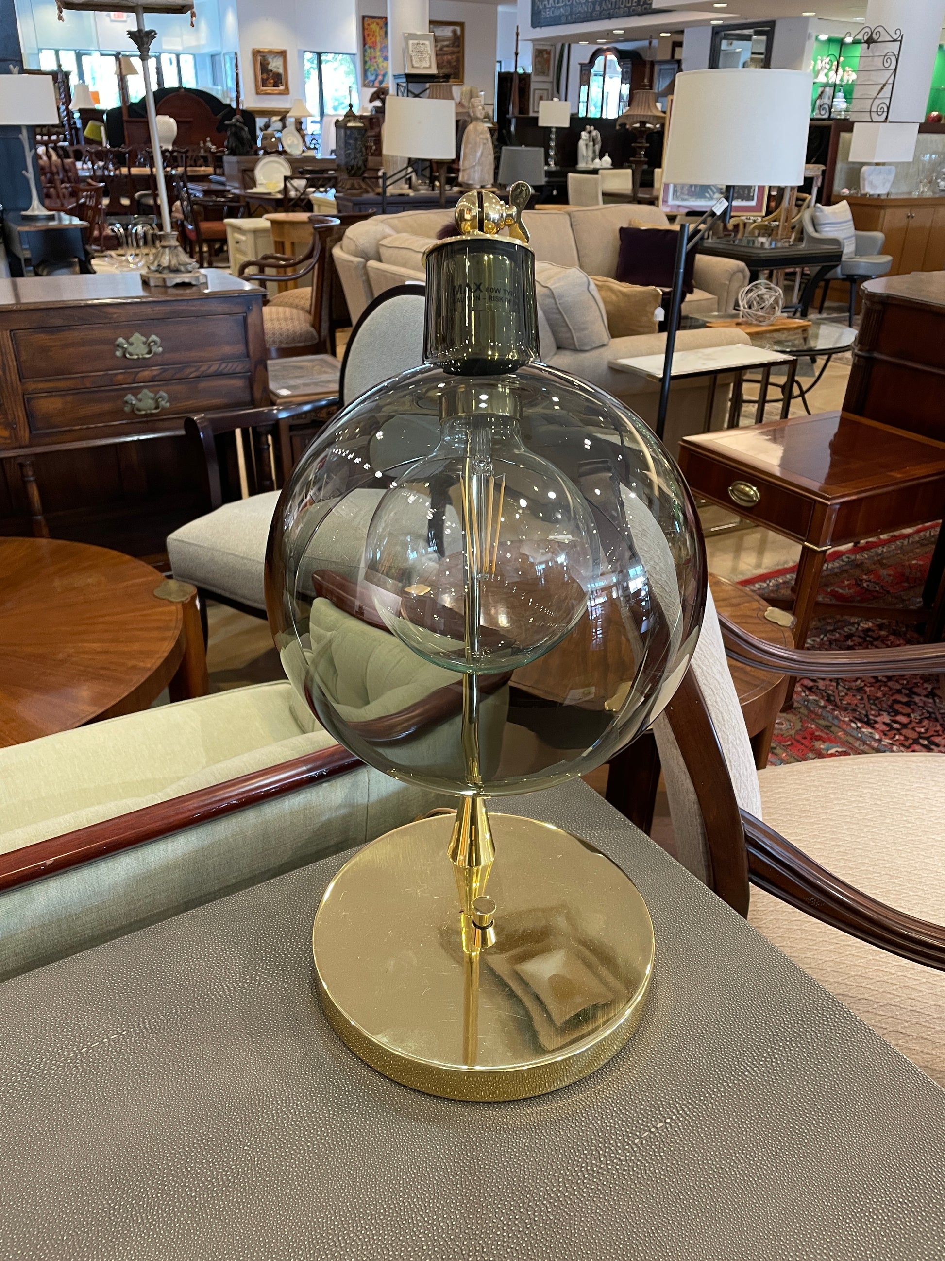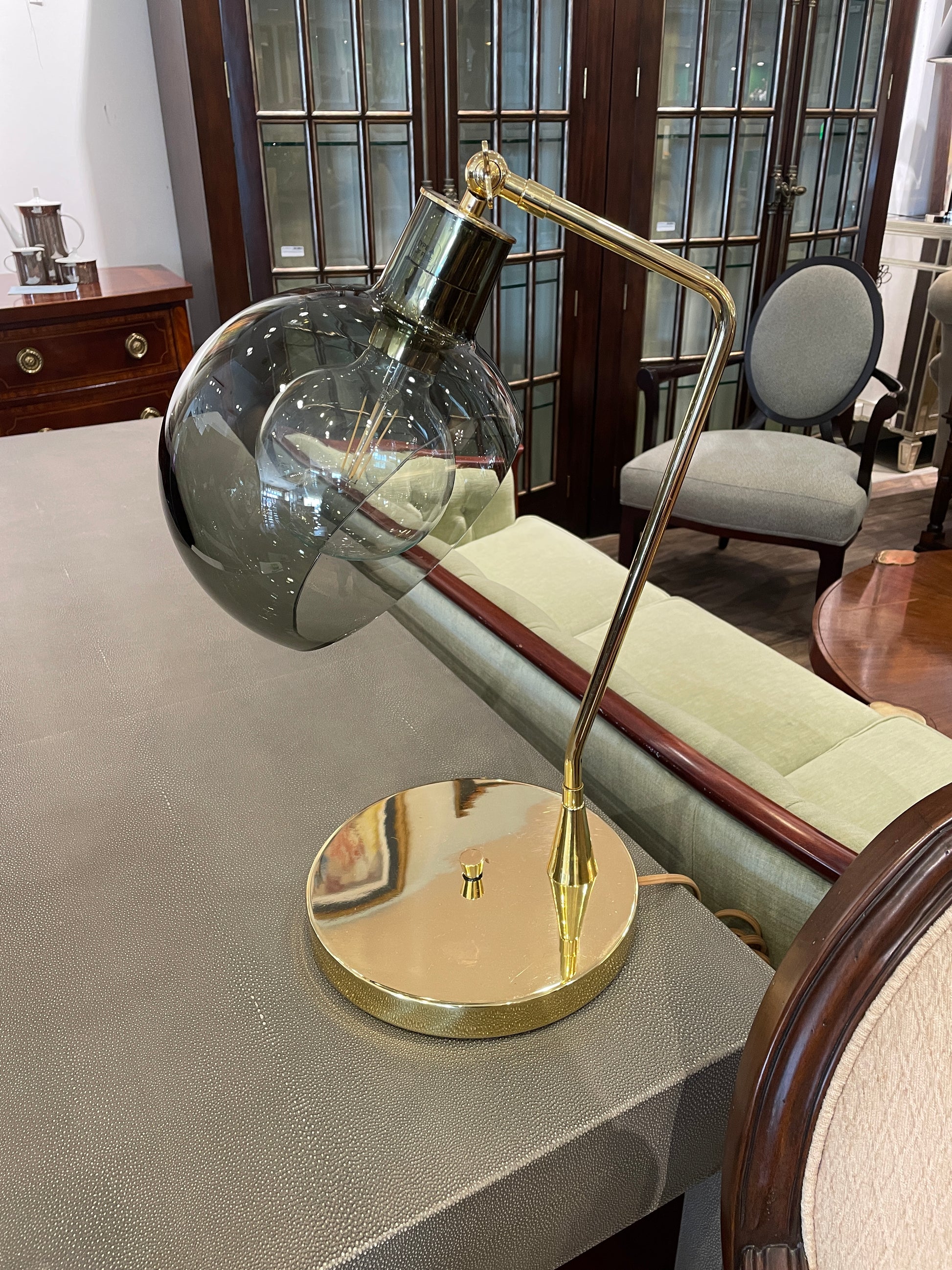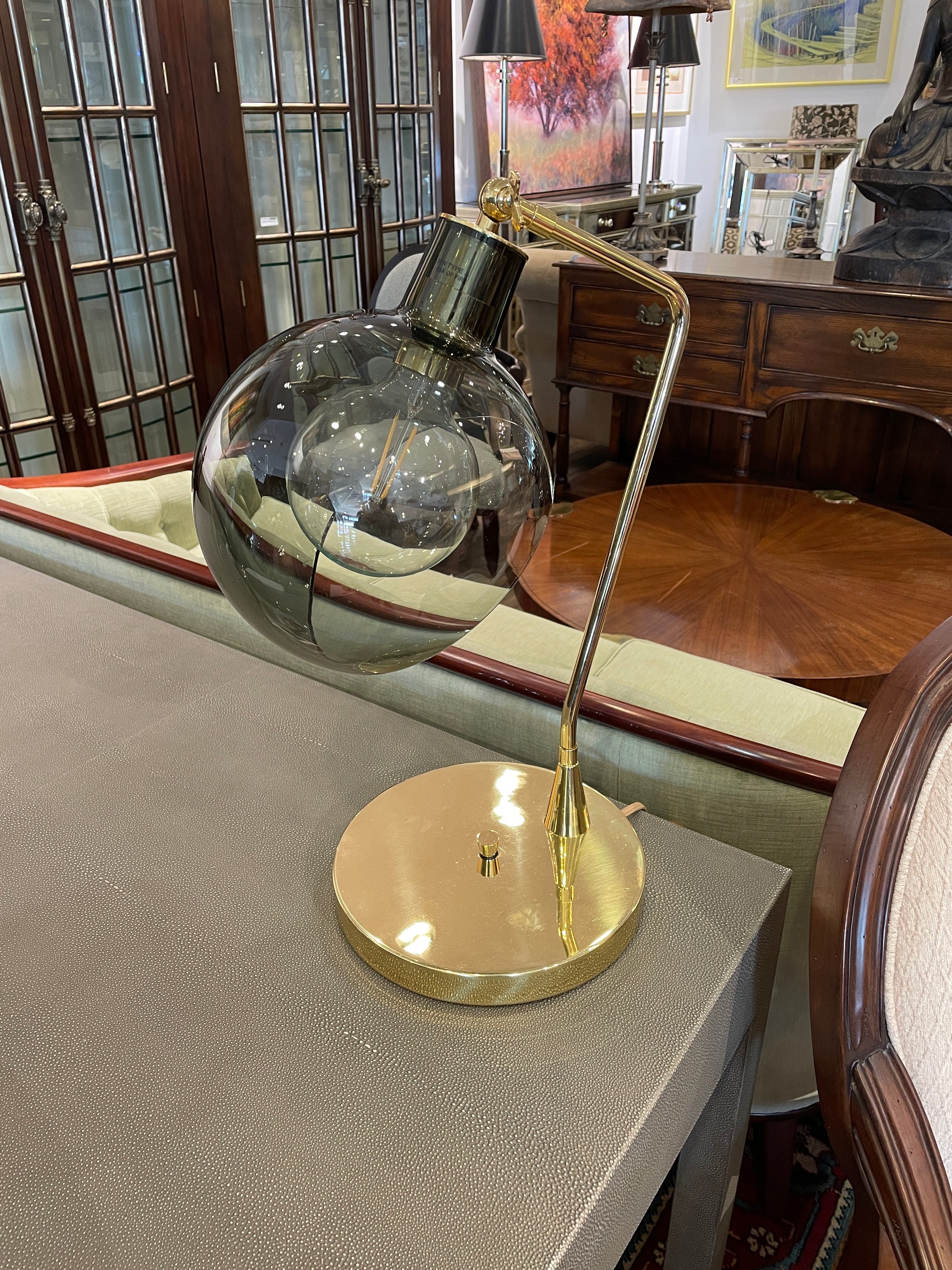 Rejuvenation globe desk lamp. This beautiful lamp features a circular base with a gold finish. The base holds a slender arm that protrudes out beyond the base and then angles back in. The arm leads to a beautiful dark green globe-shaped glass shade. A beautiful lamp that's sure to elevate a space.