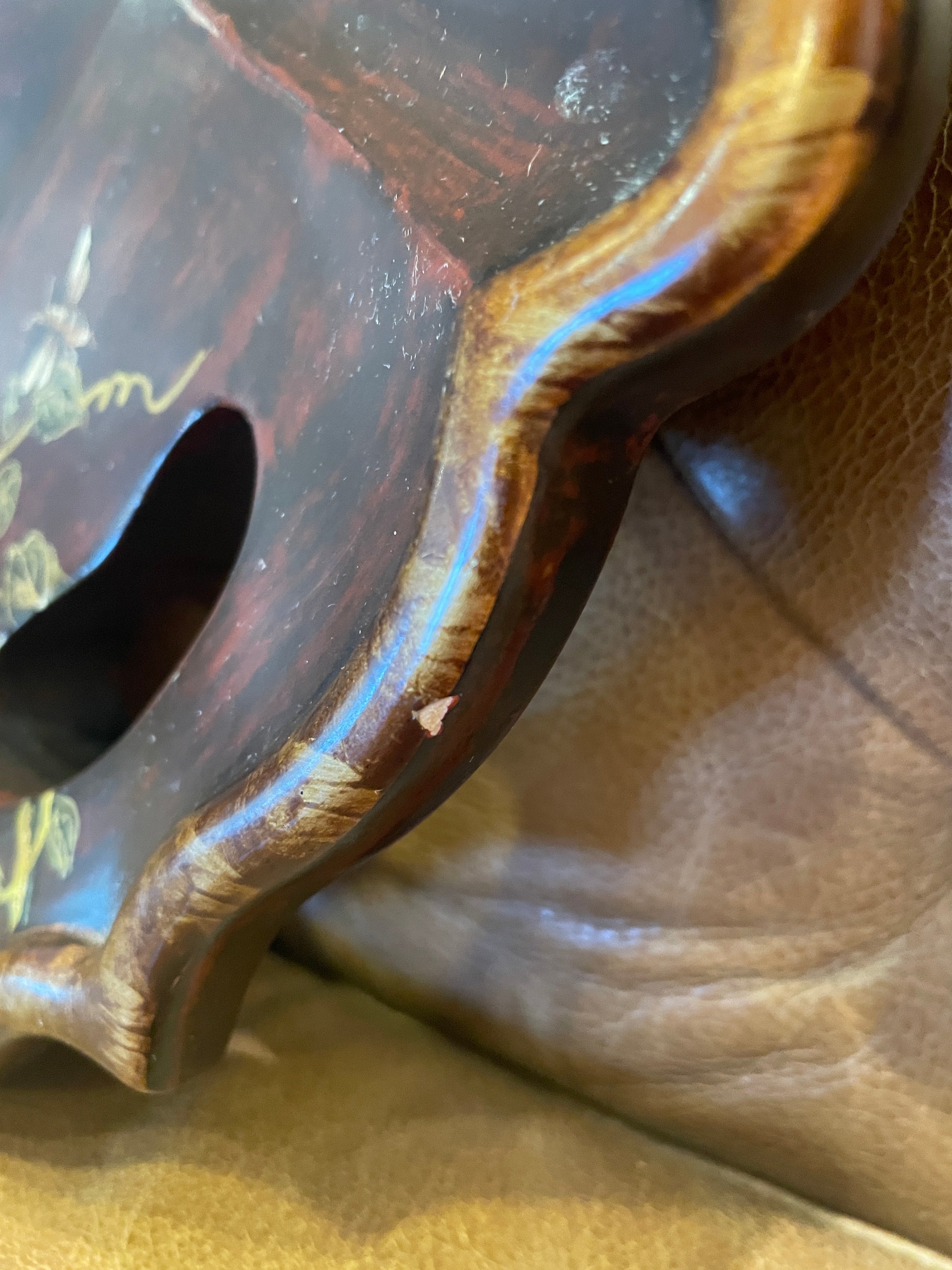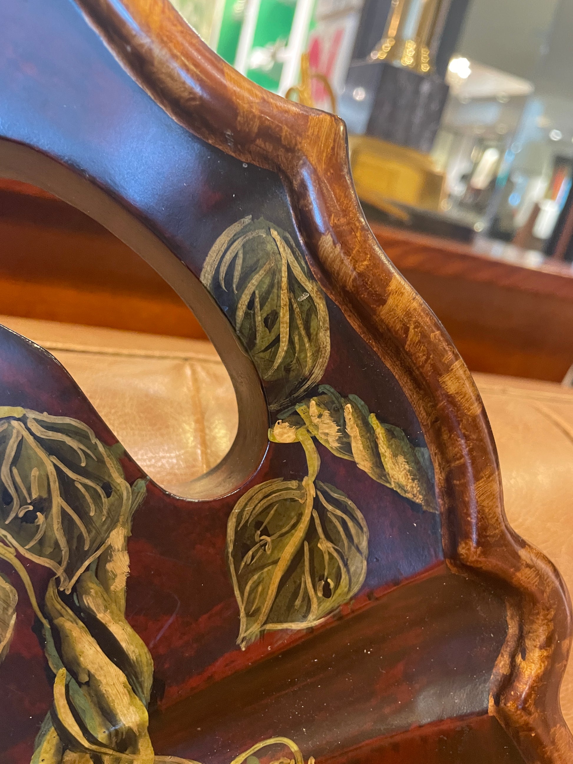 Chinoiserie style tray with birds. This beautiful decorative resin tray is adorned with designs of plants, birds, and some moths. Creeping green vines stretch across the length of the tray, and two birds sit in the center. The outer edge holds the moths, and eight holes are spread around the edge too. The tray is a deep red, almost brown color, and the outer border is gold. This tray is a work of art that is sure to add a chinoiserie touch to any space.