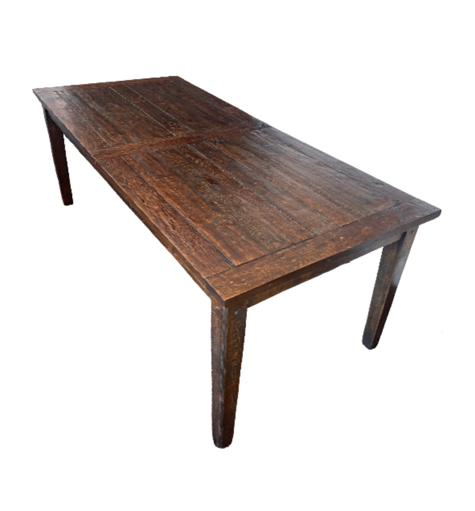 This is a rustic-style wooden dining table with a rich, dark-stained finish. The tabletop features a plank design framed by a solid border, showcasing natural wood grain and texture. The sturdy construction and distressed finish give it a vintage, handcrafted appeal. Perfect for a warm, traditional dining space, the table is surrounded by both modern and classic seating, enhancing its timeless aesthetic.