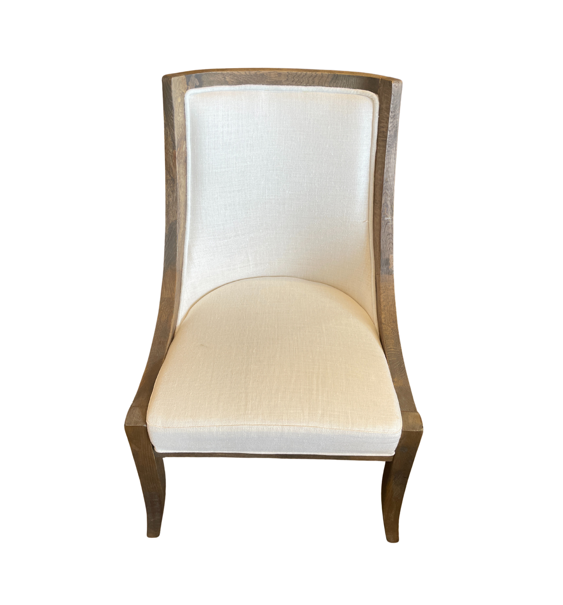 Restoration Hardware pair of two nineteenth century French empire dining chairs. Each chair sits atop four wooden saber legs. The white upholstery is bordered with the same wood. The back tapers off as is stretches towards the front of the seat, creating two low arms. Black studs connect the area between the border and upholstery on the back of the chair. An elegant and beautiful pair of chairs.