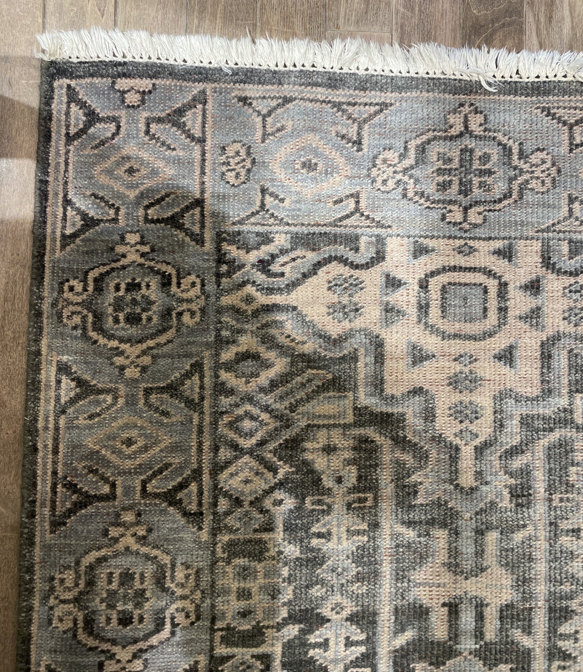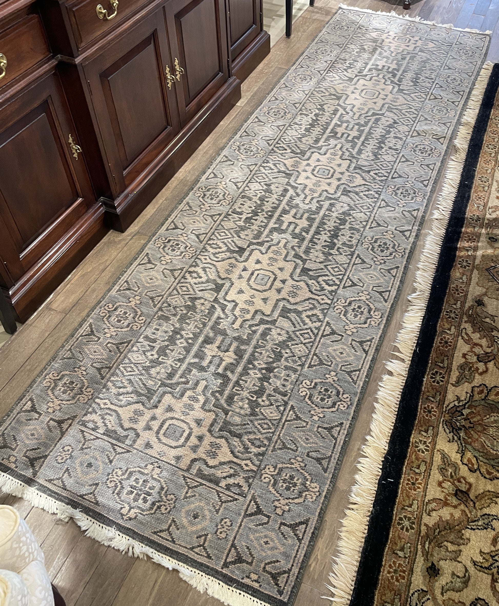 This runner by Ben Soleimani for Restoration Hardware showcases a modern geometric pattern in cool blue tones. A cream colored fringe is present on each end of the runner.