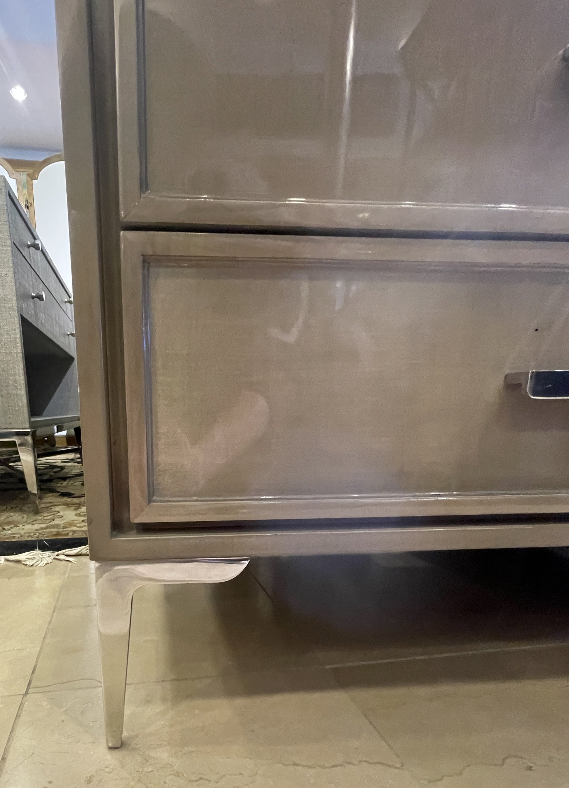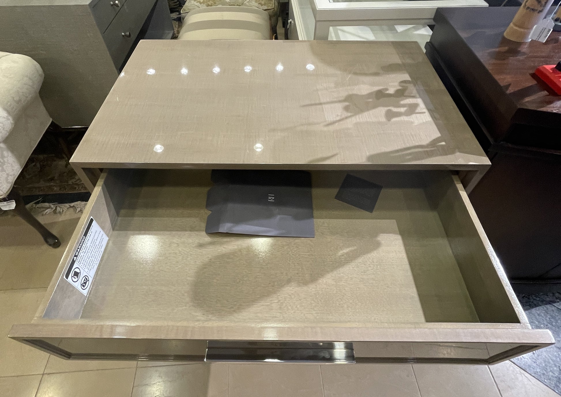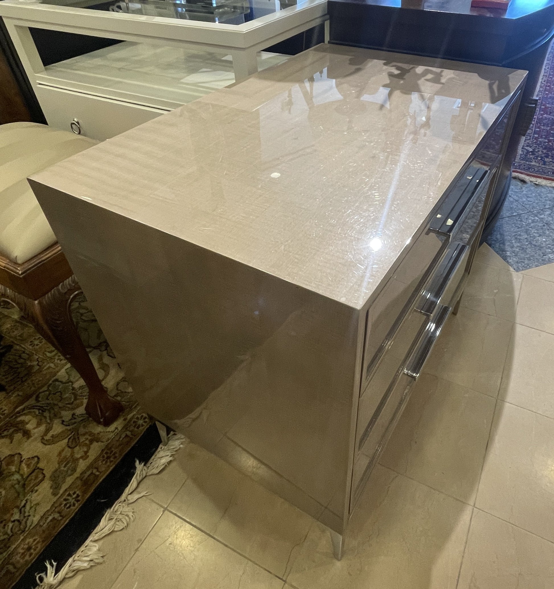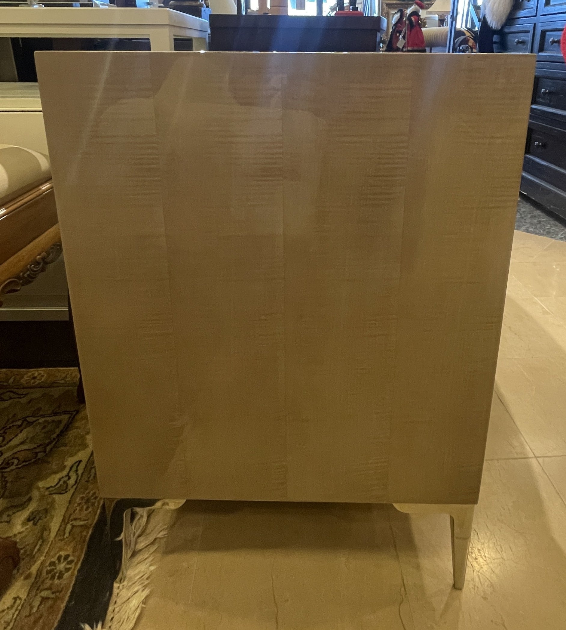 Restoration Hardware Benoit closed three drawer nightstand. This charming nightstand is crafted from light toned wood with a lacquered finish. The piece features three drawers with chrome finished bar handles and sits atop slender metal feet. This little contemporary piece is a perfect addition next to a bed or could even be used as a small end table.