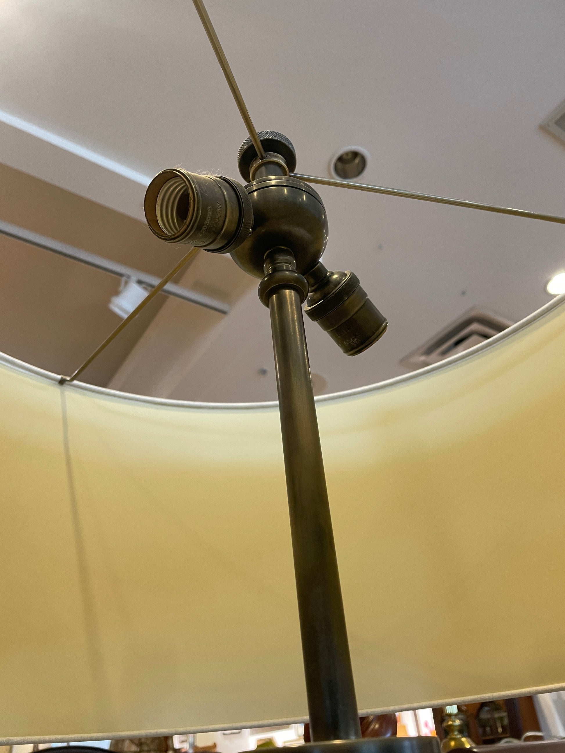 Restoration Hardware column floor lamp in bronze. This beautiful lamp sits on a bronze base with a square stand and thick, round stem. Atop the stand sit two lightbulb sockets that are covered by a broad white cylindrical shade. A beautiful lamp that is sure to light up a room with its robust design.
