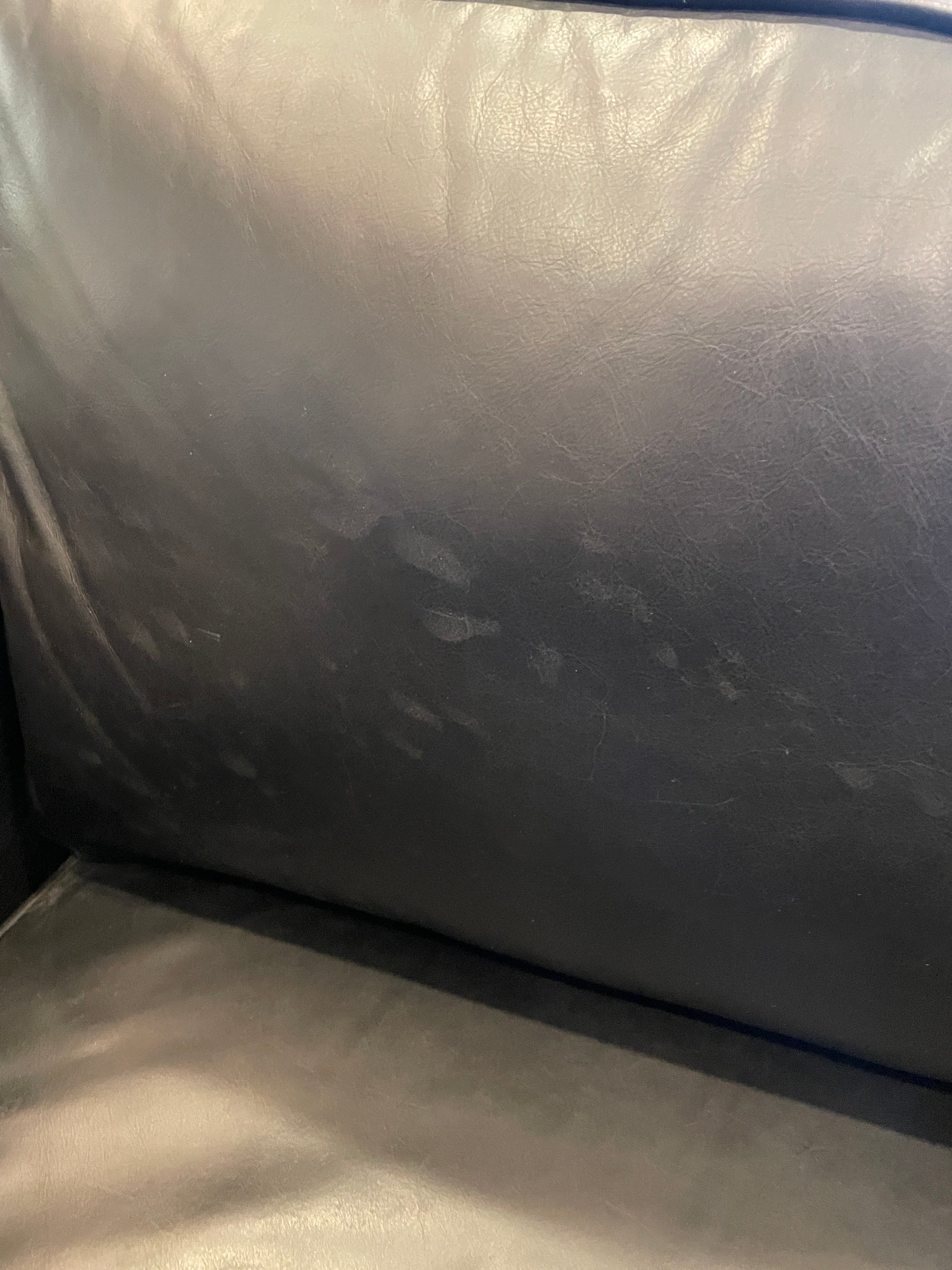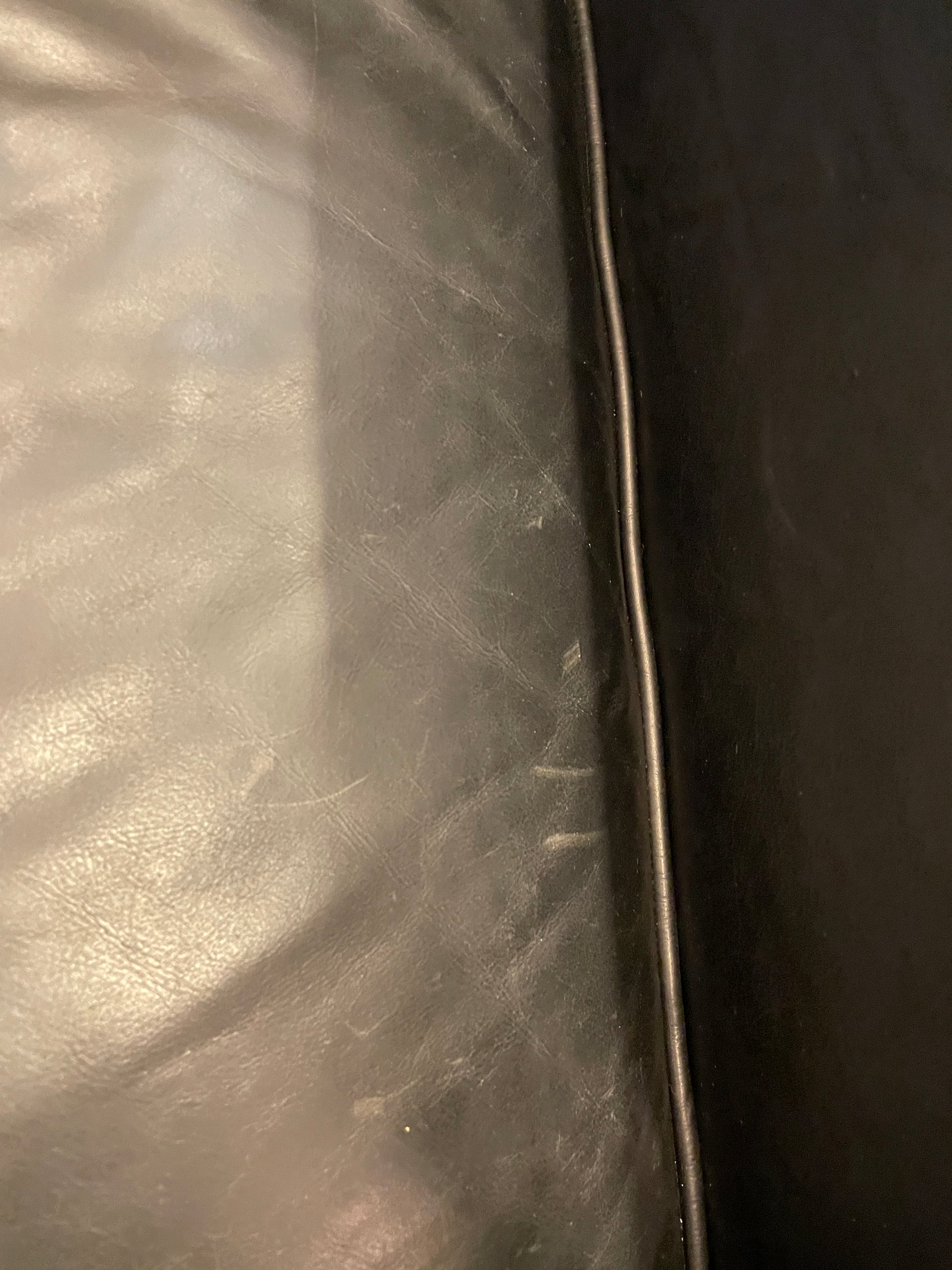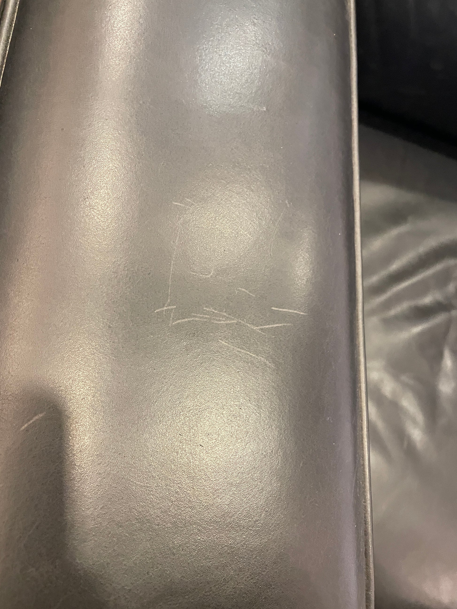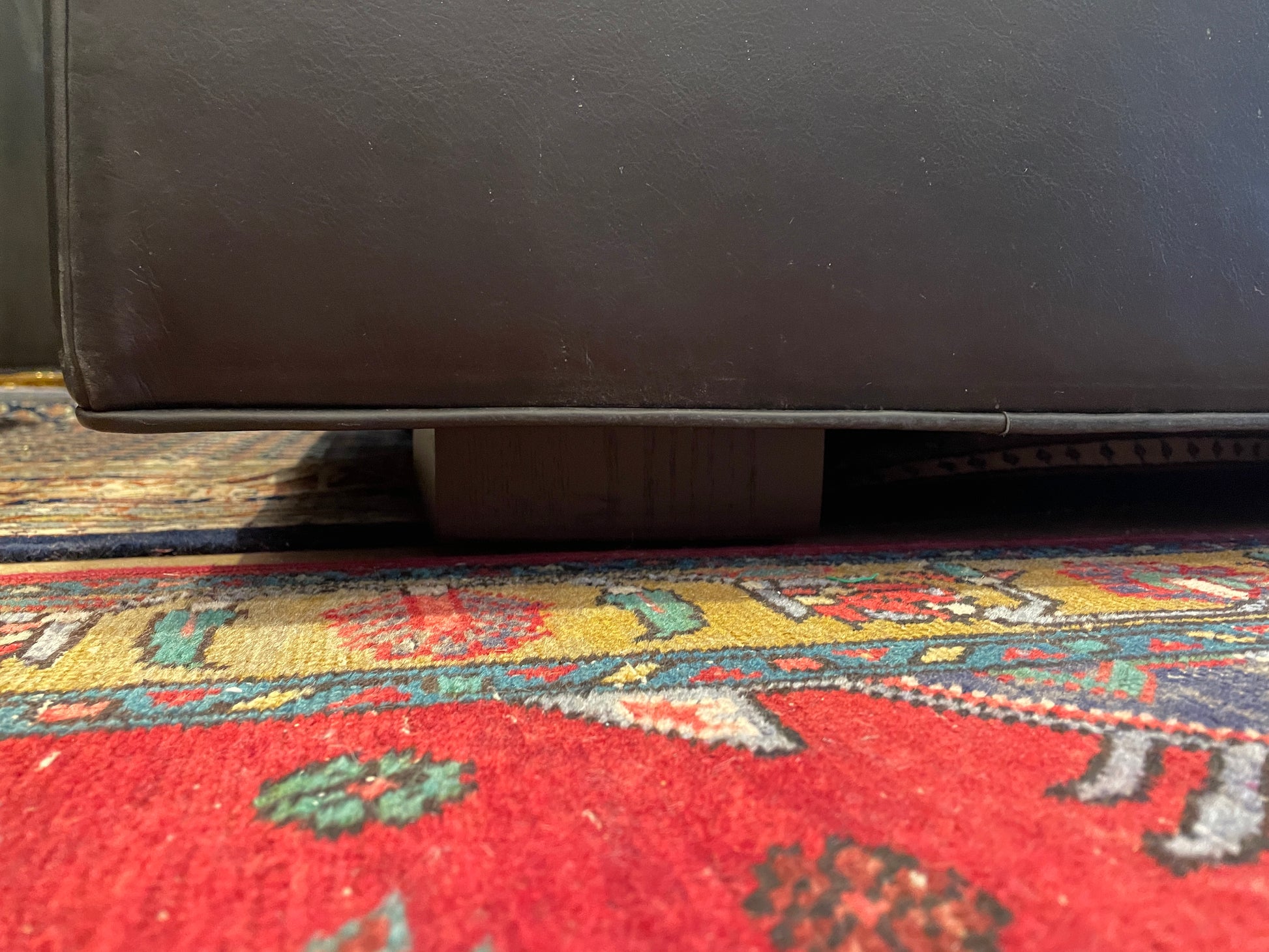Restoration Hardware Maddox leather arm chair. This beautiful chair features an overall blocky, partial cube design which gives it a robust and eye catching appearance. The chair is upholstered with a smooth black leather which adds further to the simple bold design. The chair sits low to the ground on short, blocky, wooden square feet that cannot be seen from a distance, as they are tucked relatively far in underneath the wide seat. To finish off the design, this chair has subtle piping details at some of the seams, notably on the edges of the cushions and arms. A charming chair that boasts both comfort and bold design.